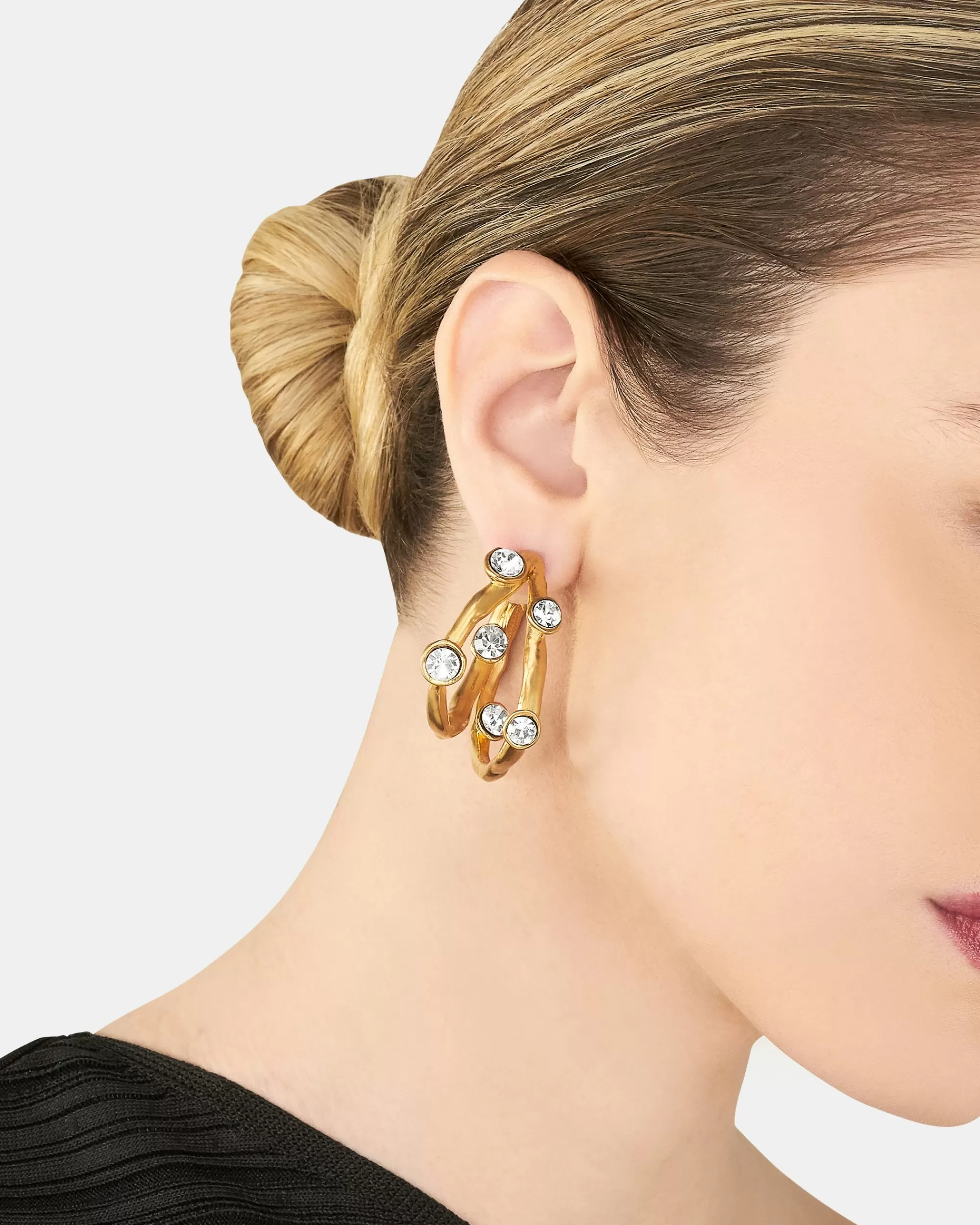 If you’re looking for a little extra sparkle to elevate your wardrobe, you’ll love these Queen Of The Nile Hoops. Made in Italy from light-gold brass with an intricate texture and enriched with gleaming crystals, style yours with the matching choker and cuff for maximum impact.