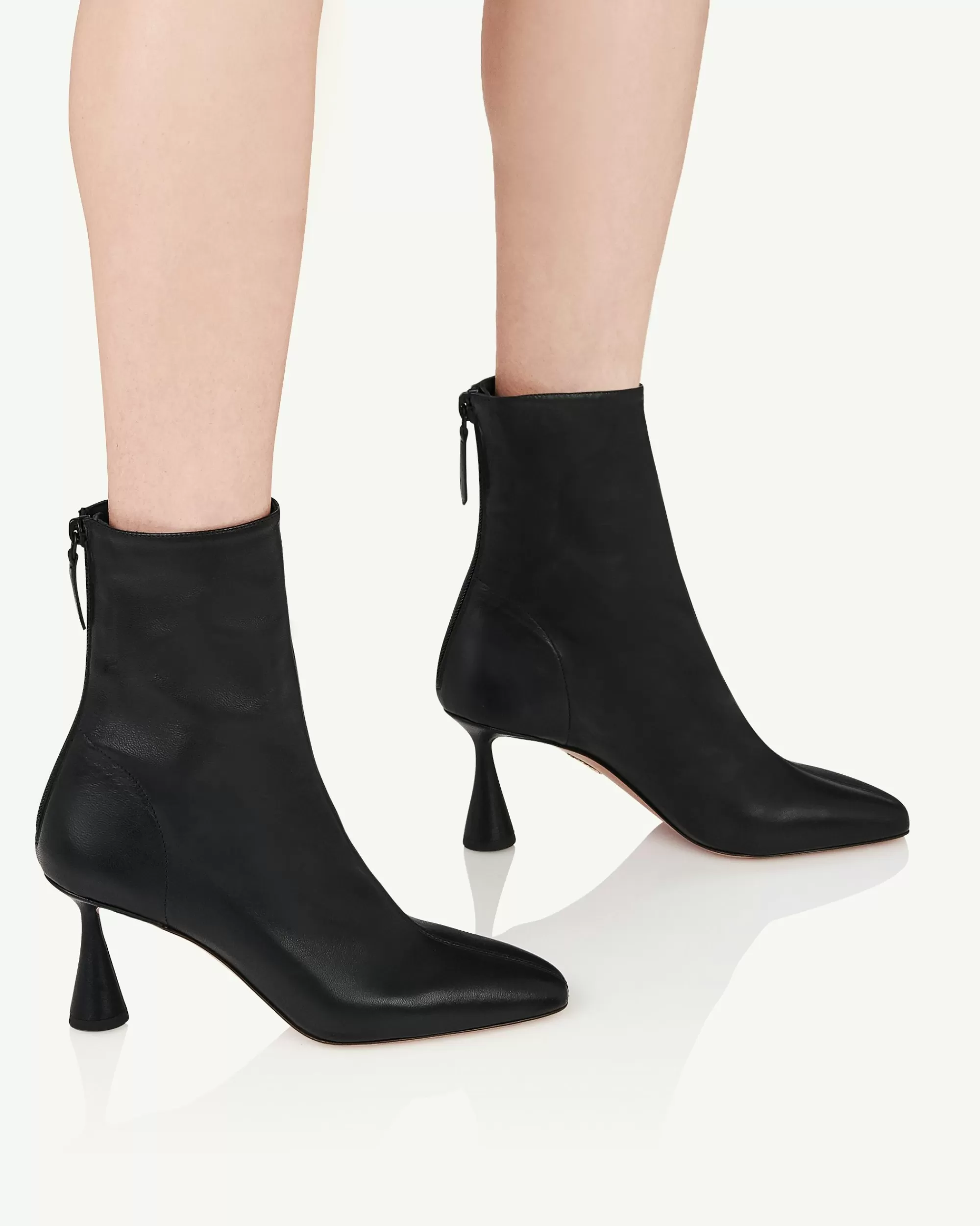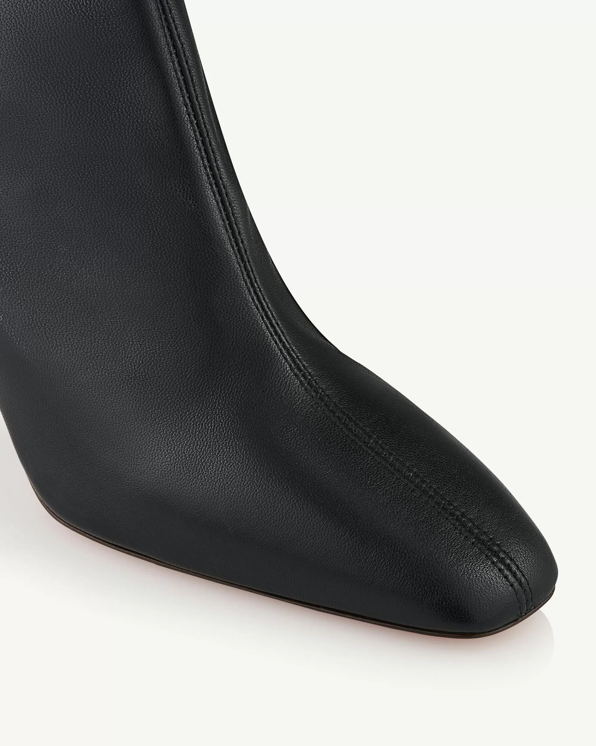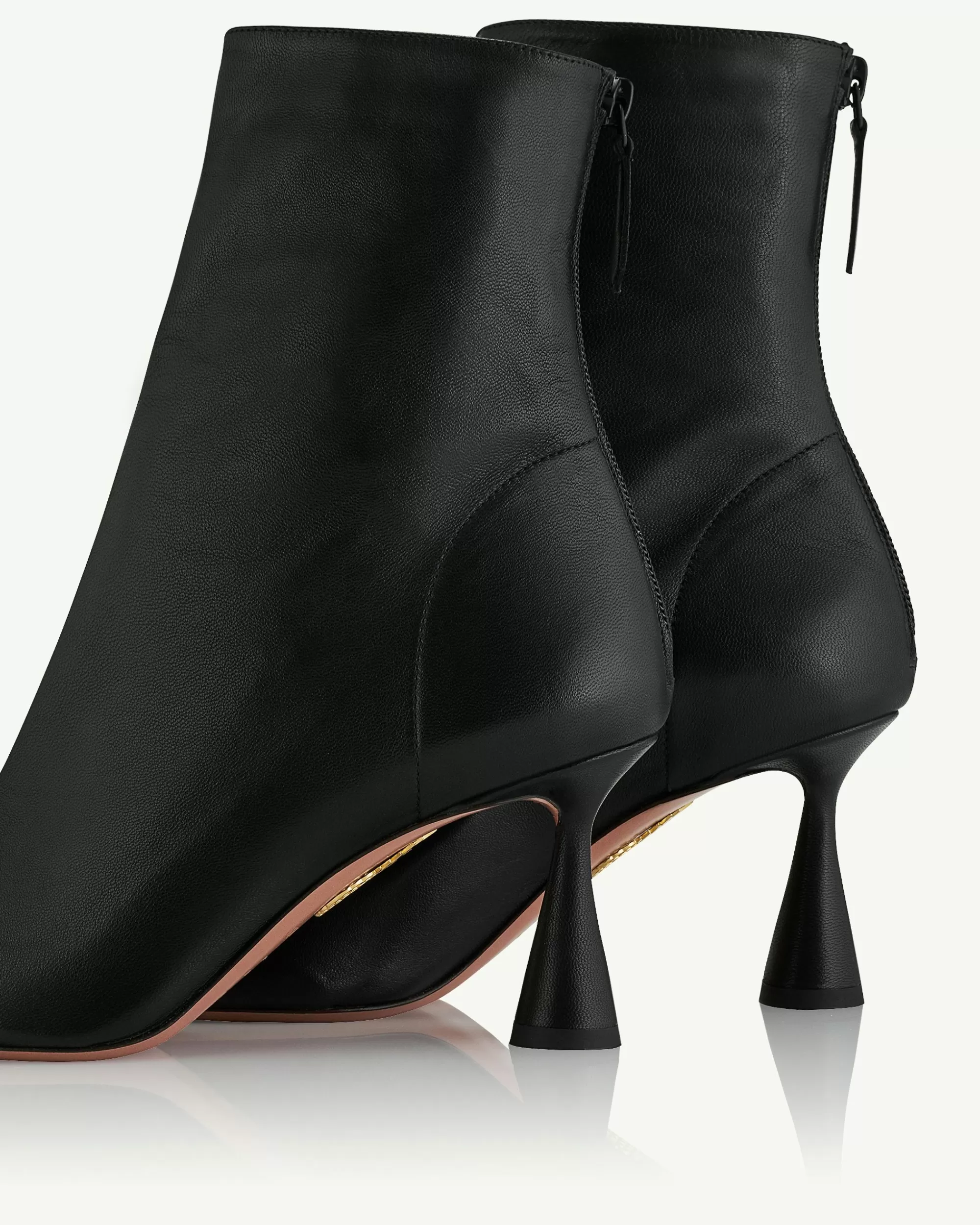 Cool, contemporary and beautifully made, the Amore Booties will slot seamlessly into your year-round wardrobe. Crafted from supple black leather and meant to mould to the shape of your foot over time, they have elegant almond toes and sculptural 75 mm heels. Styling-wise, they work with anything and everything.