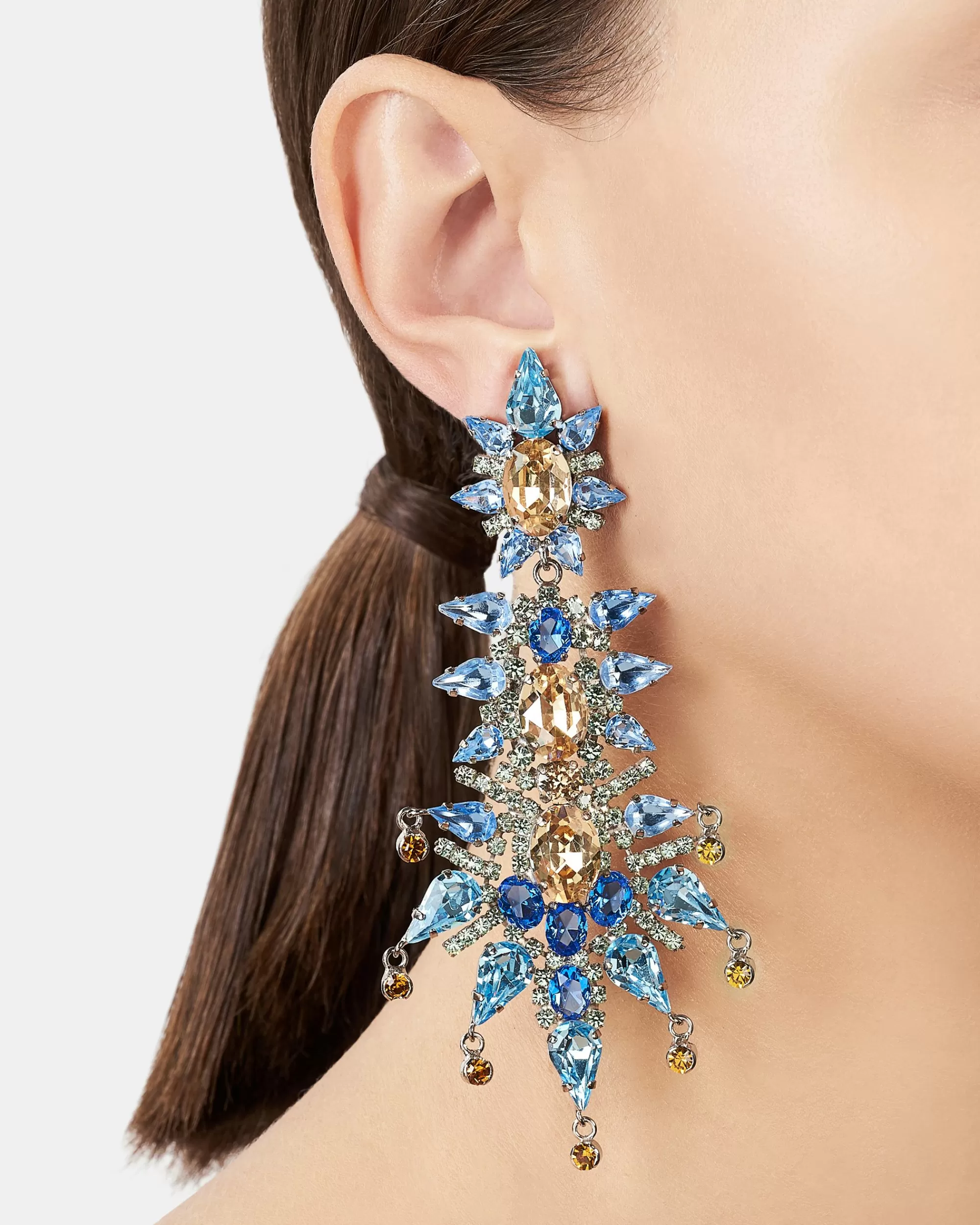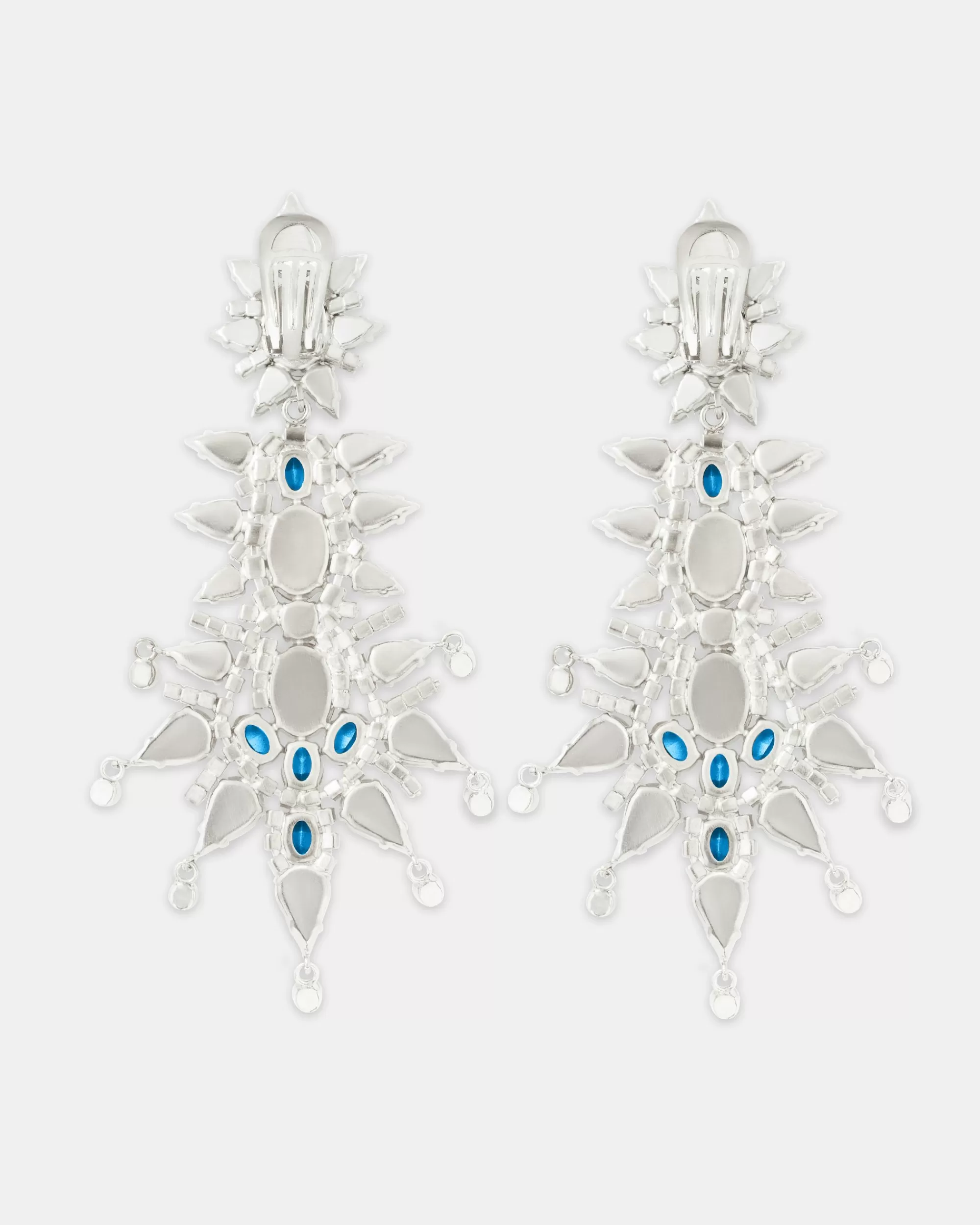 Our Aranka Earrings will add a dramatic finishing touch to your evening edits. Crafted from glossy strass and brass in a vibrant palette of palladium and aquamarine, the striking chandelier style is finished with easy to wear clip-ons.