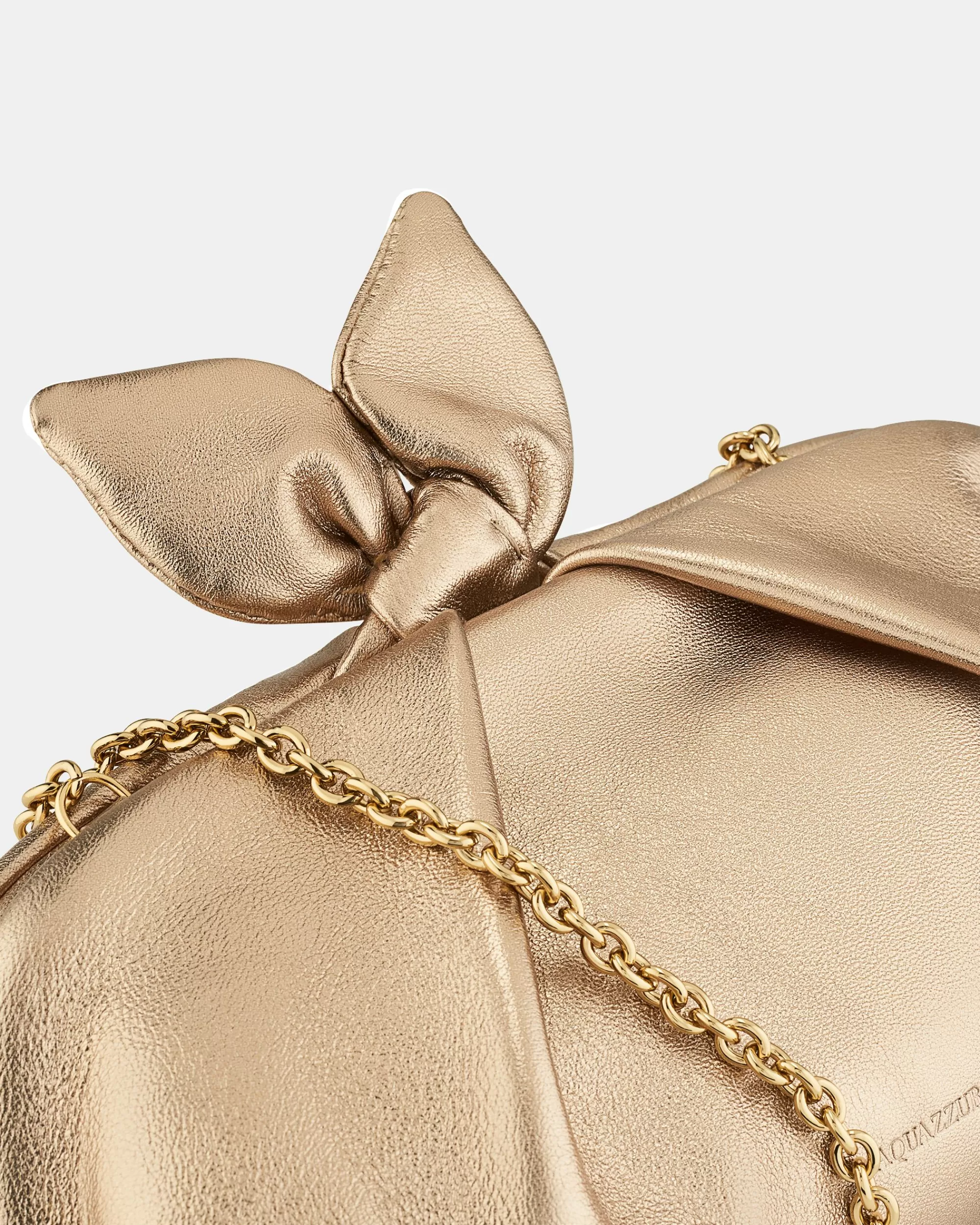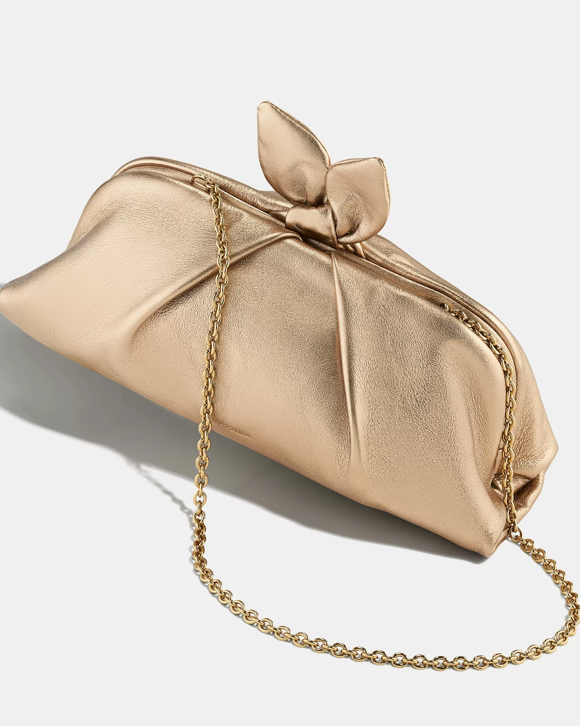 With a playful allure courtesy of the signature bow motif, our Bow Tie Clutch is reimagined in laminated nappa leather with a soft vintage effect. The leather is elegantly folded and tied over a sleek metal frame, offering a modern twist on the classic structured pouch. Finished with subtle gold-tone branding and a slim metal chain strap that tucks inside.