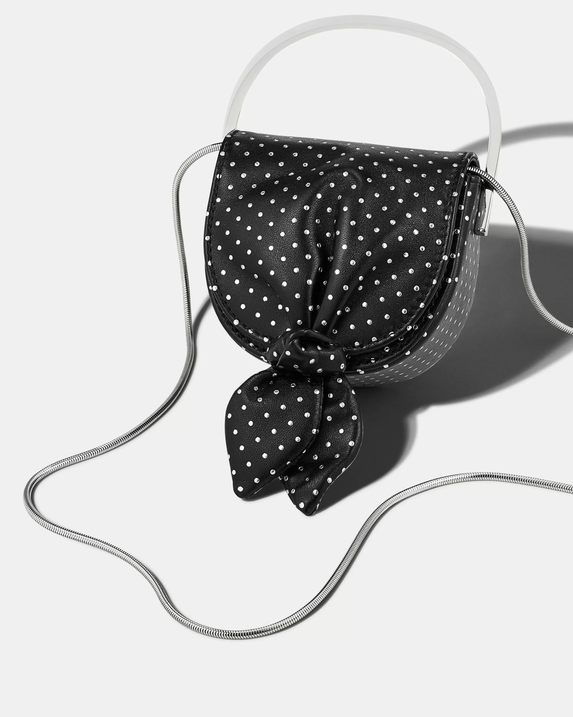 Upgrade your arm candy with our Bow Tie Micro Bag. Lovingly crafted in Italy, the supple black leather is punctuated with shimmering silver polka dots for a light-catching effect, while the curved top handle and a bow-like knot add an artful touch. Style yours with a classic LBD and casual denim alike.