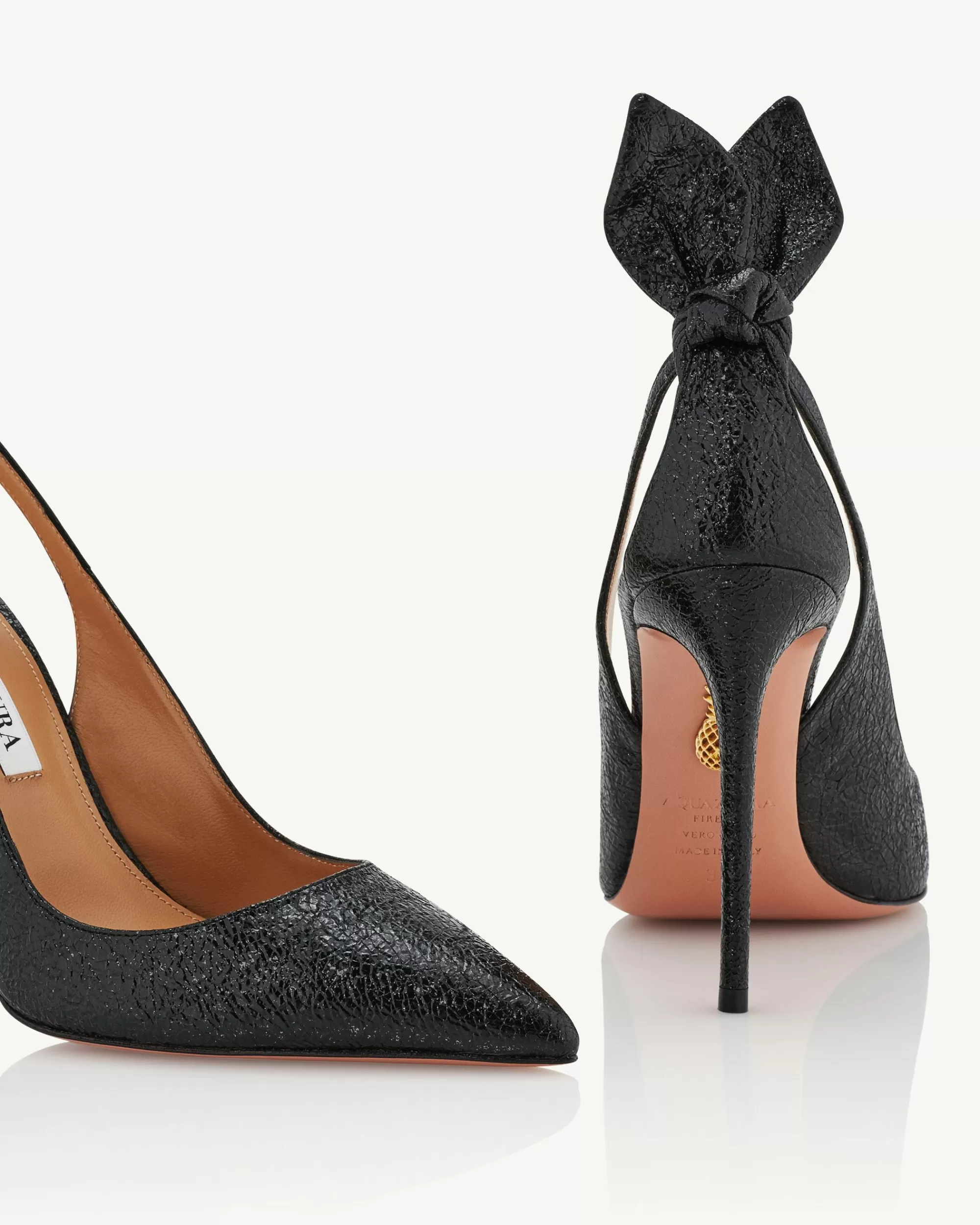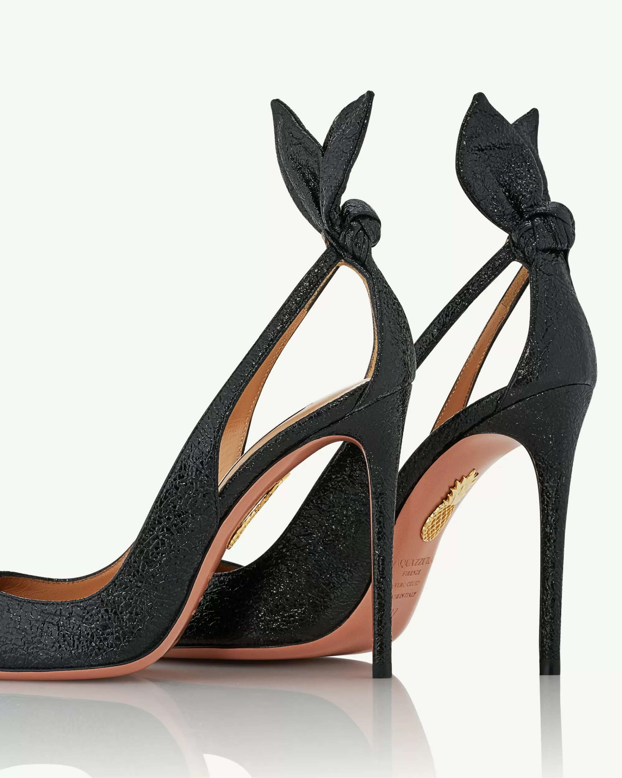 A natural trend-setter that needs no introduction: these Bow Tie Pumps are crafted from supple black nappa leather with a high-shine craquele’ finish. They feature a flattering pointed toe, skin-baring side cutouts and a flirty upward bow at the back for that extra special finishing touch.