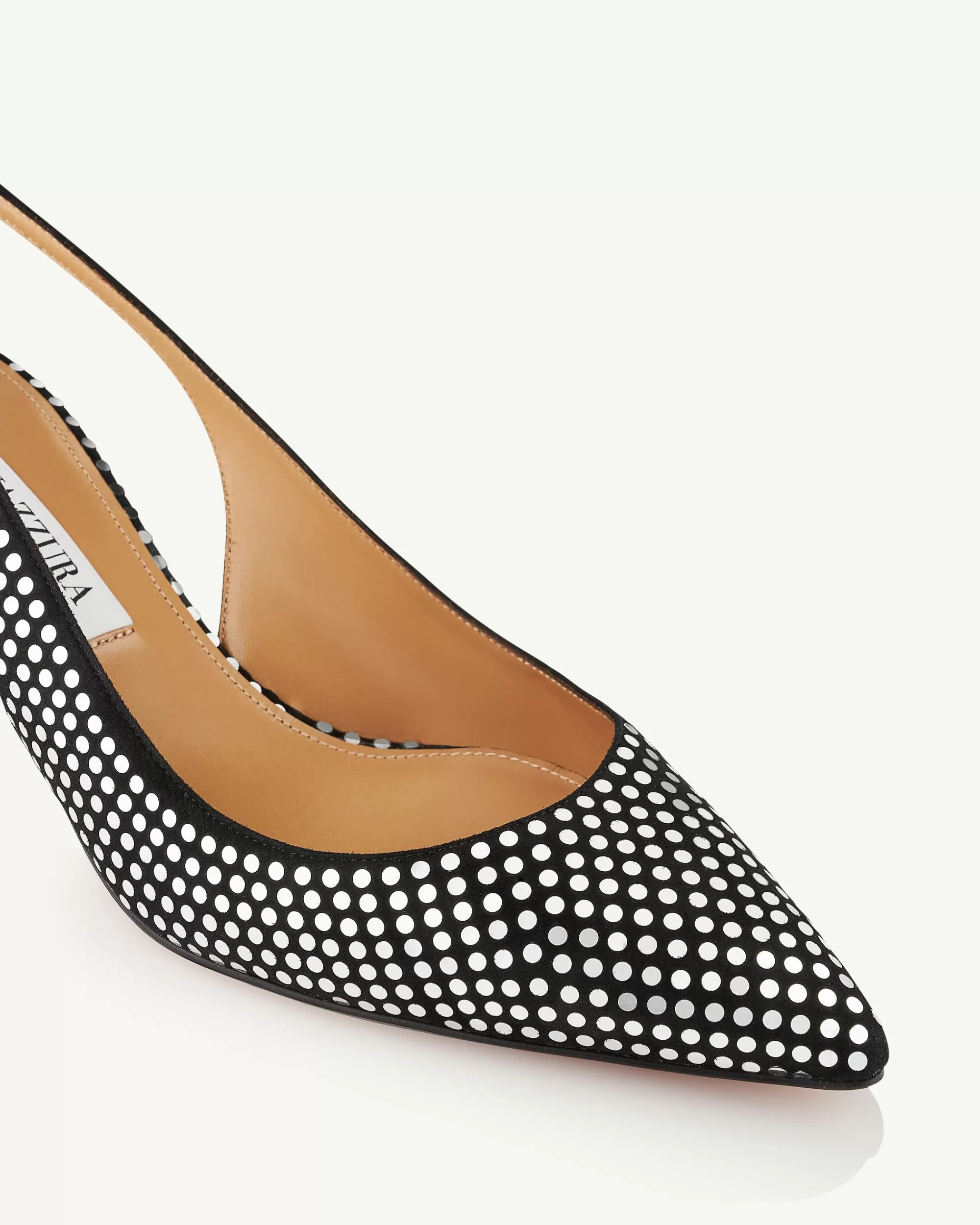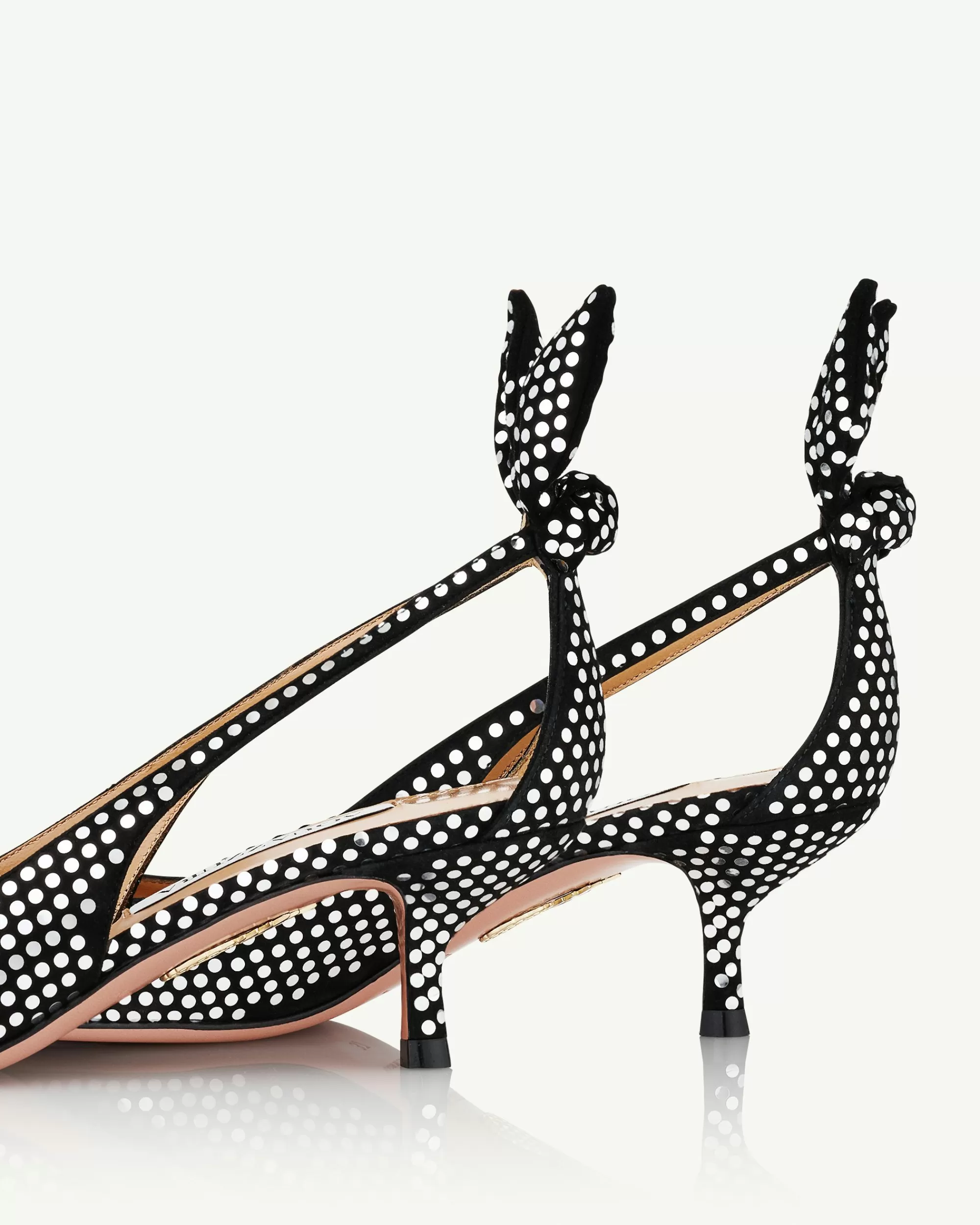 Amp up the comfort in our signature Bow Tie Pump. Set on 50 mm kitten heels, they are made in Italy from buttery black suede and feature a myriad of shiny mirror-effect discs, a playful nod to retro disco aesthetics. The style features a flattering pointed toe, skin-revealing side cutouts and a flirty bow at the back for an extra touch of panache.
