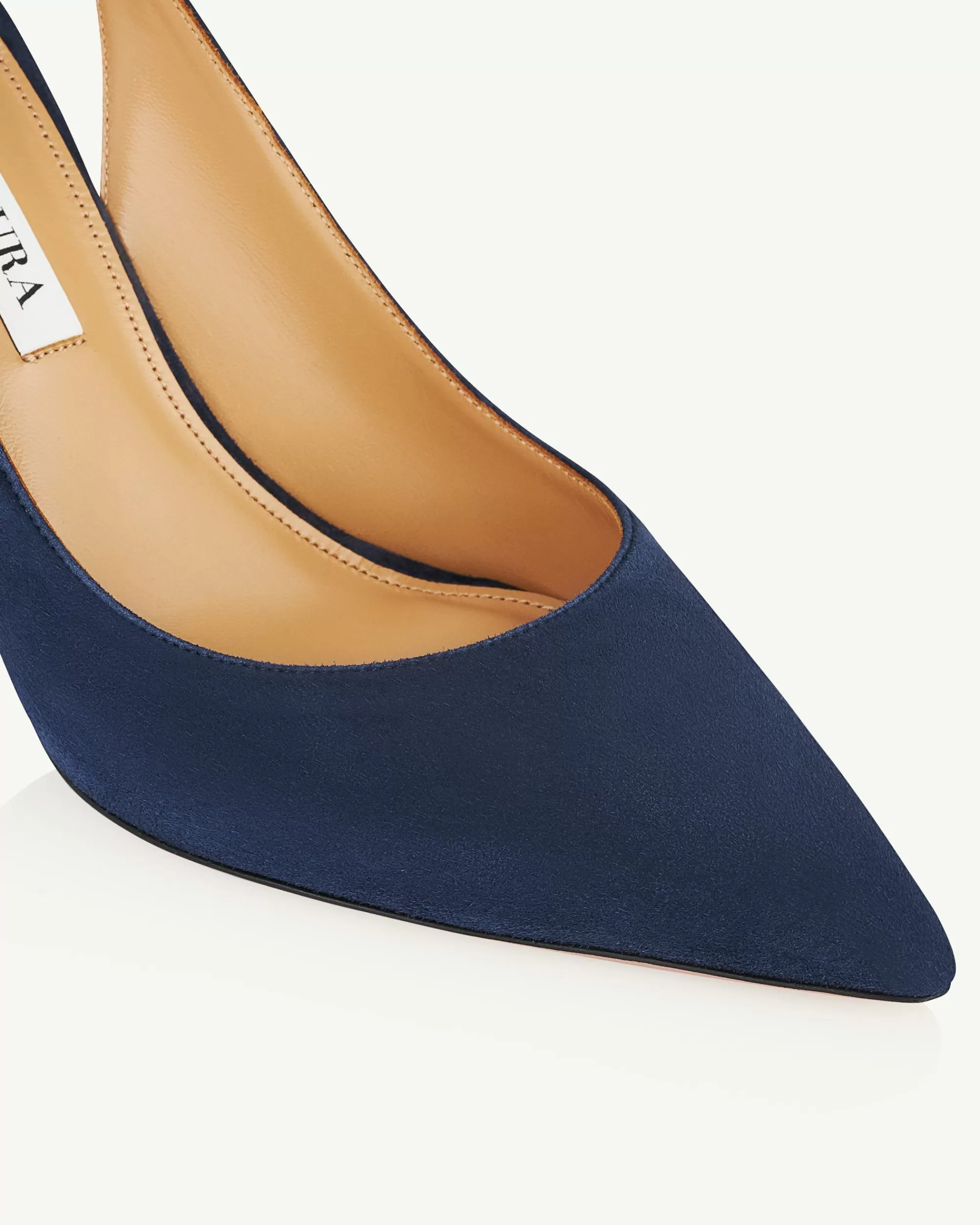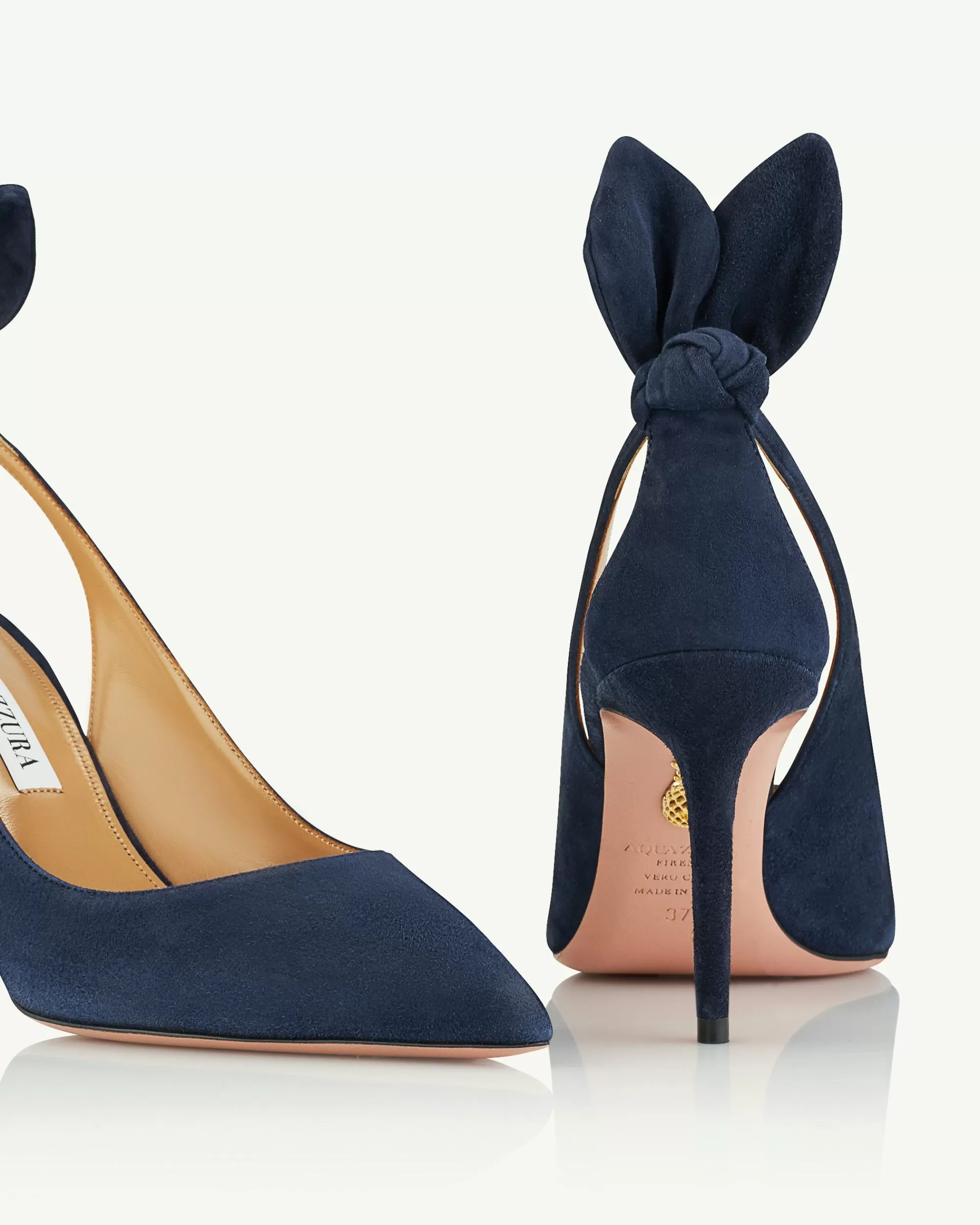 Step out in elegant style in our coveted Deneuve Pumps. Crafted in Italy from velvety suede in deep Midnight blue, this style features a pointed toe, skin-revealing side cutouts, and a flirty bow at the back for an extra touch of panache. The pair is finished on a mid heel for all-day comfort.
