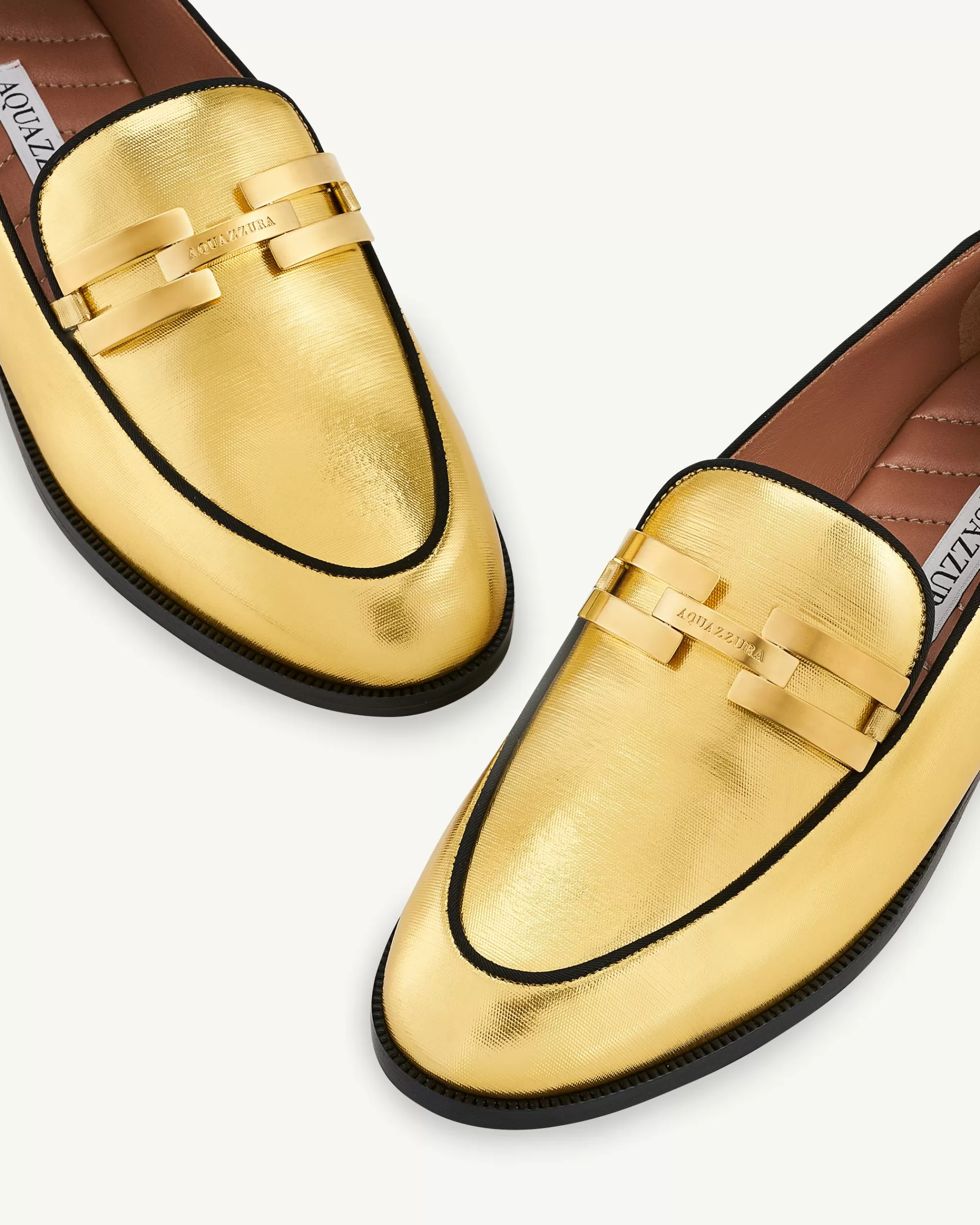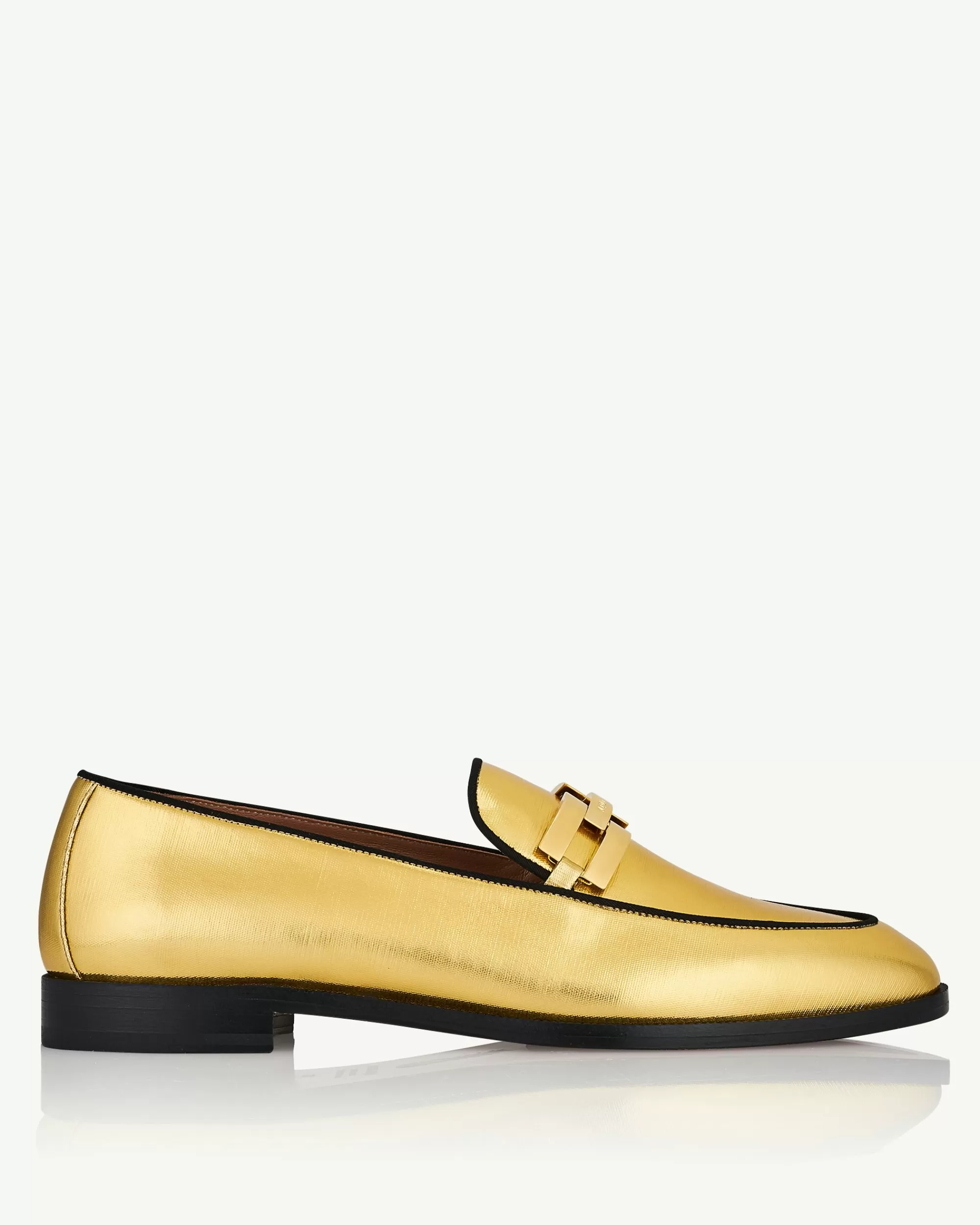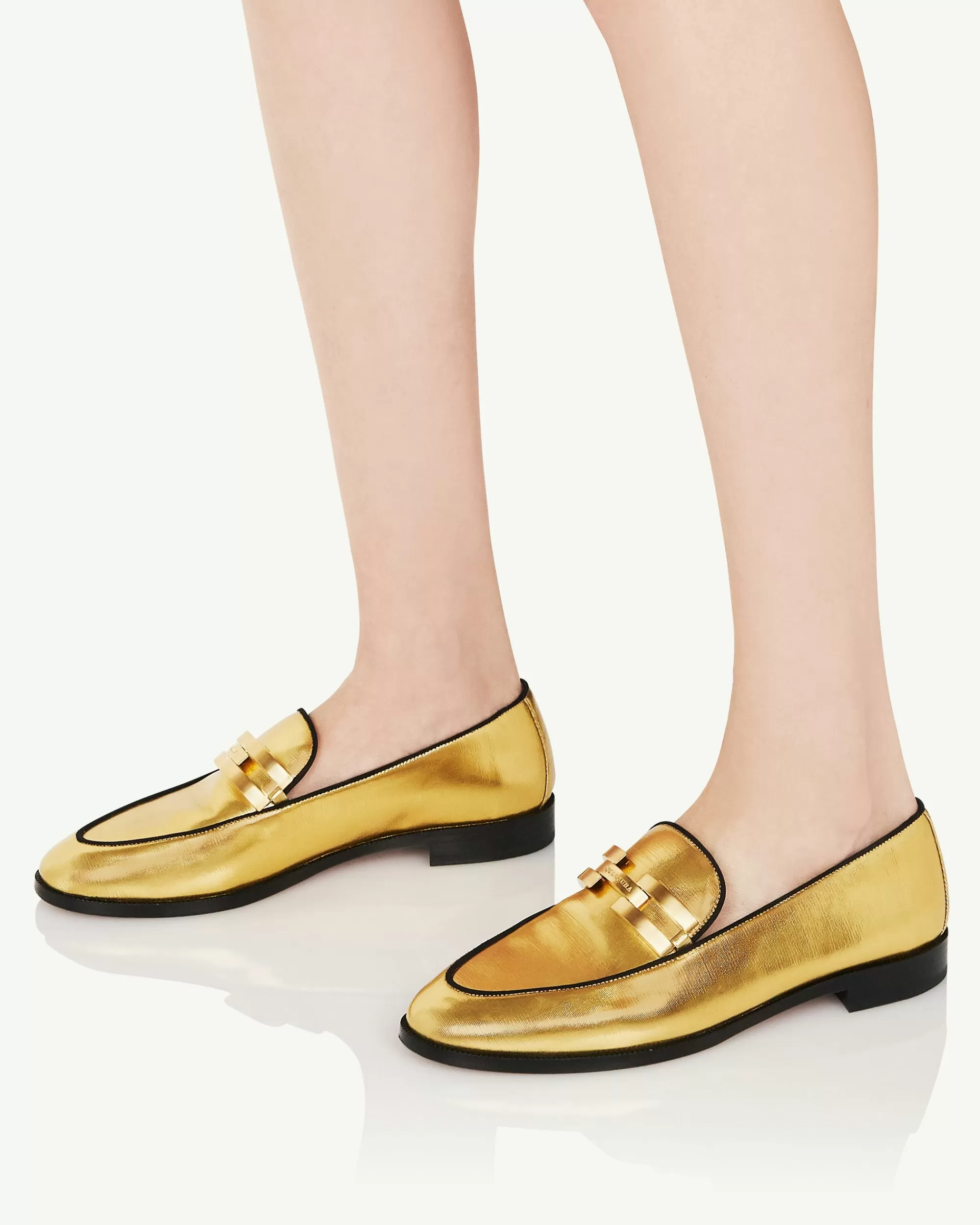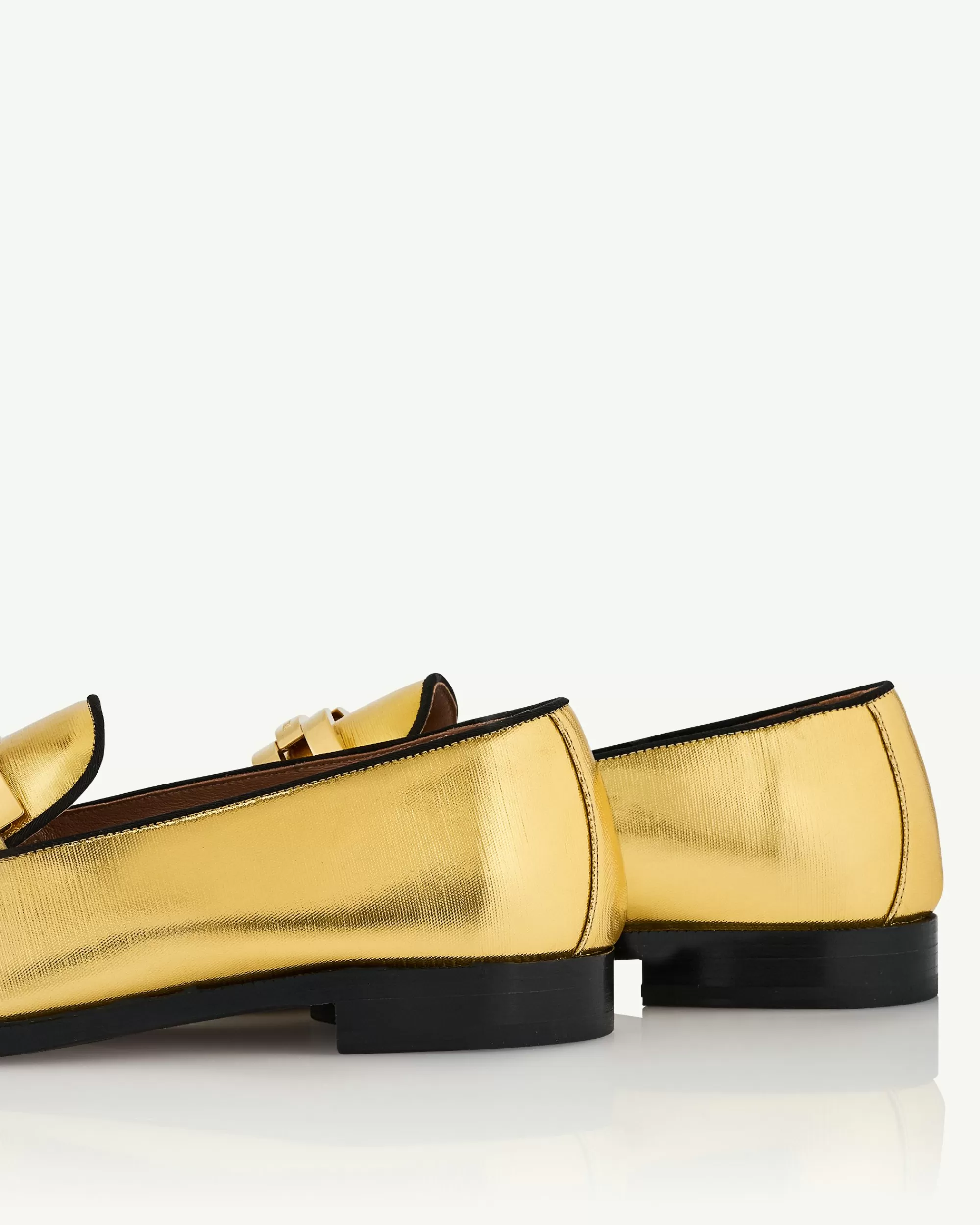 The Brandi Moccasins exude an effortless yet precious allure. Artfully crafted in Italy, they feature a high-octane metallic gold finish and gros grain trims. Sleek almond toes, slight heels and gold-tone hardware further elevate the understated silhouette.