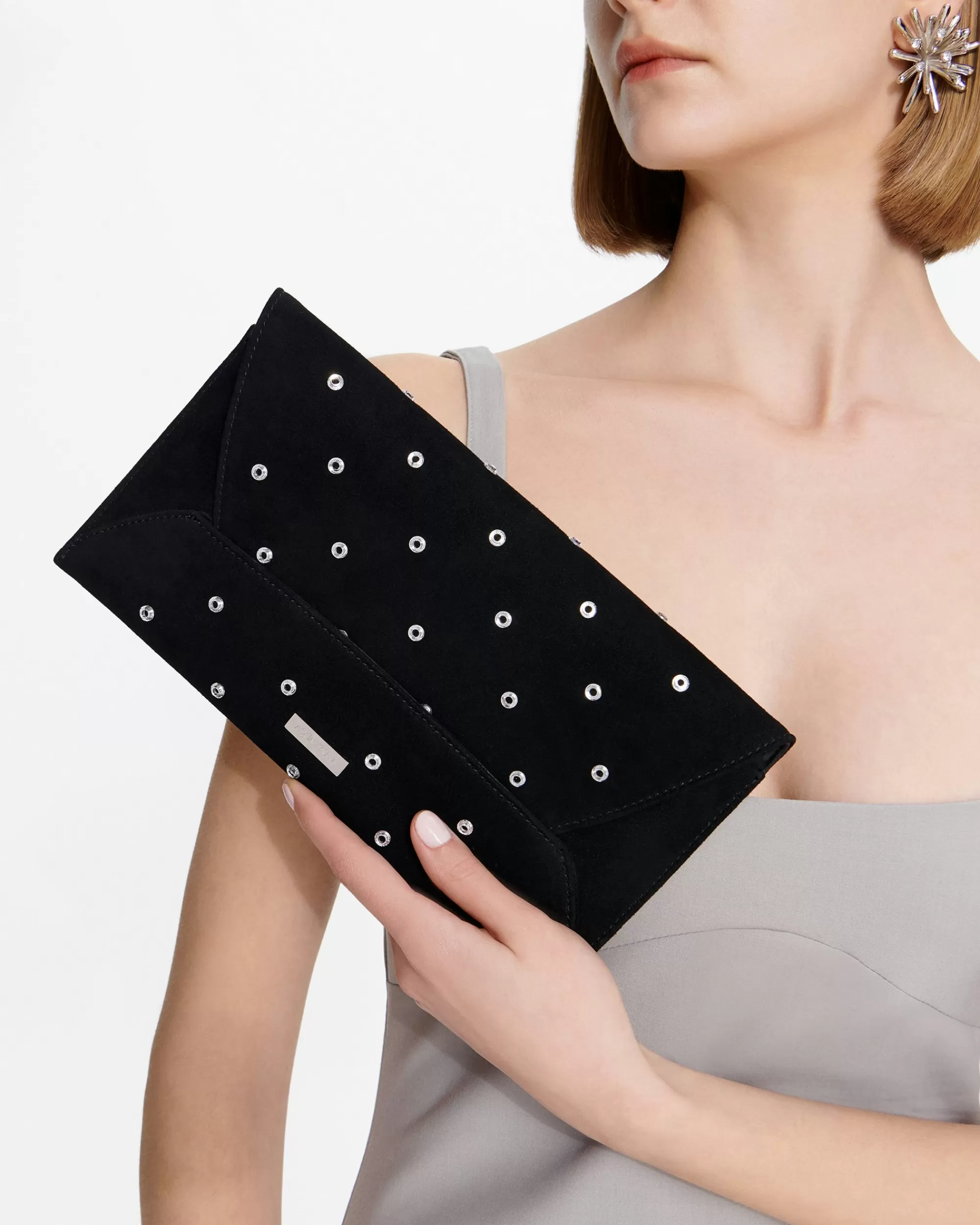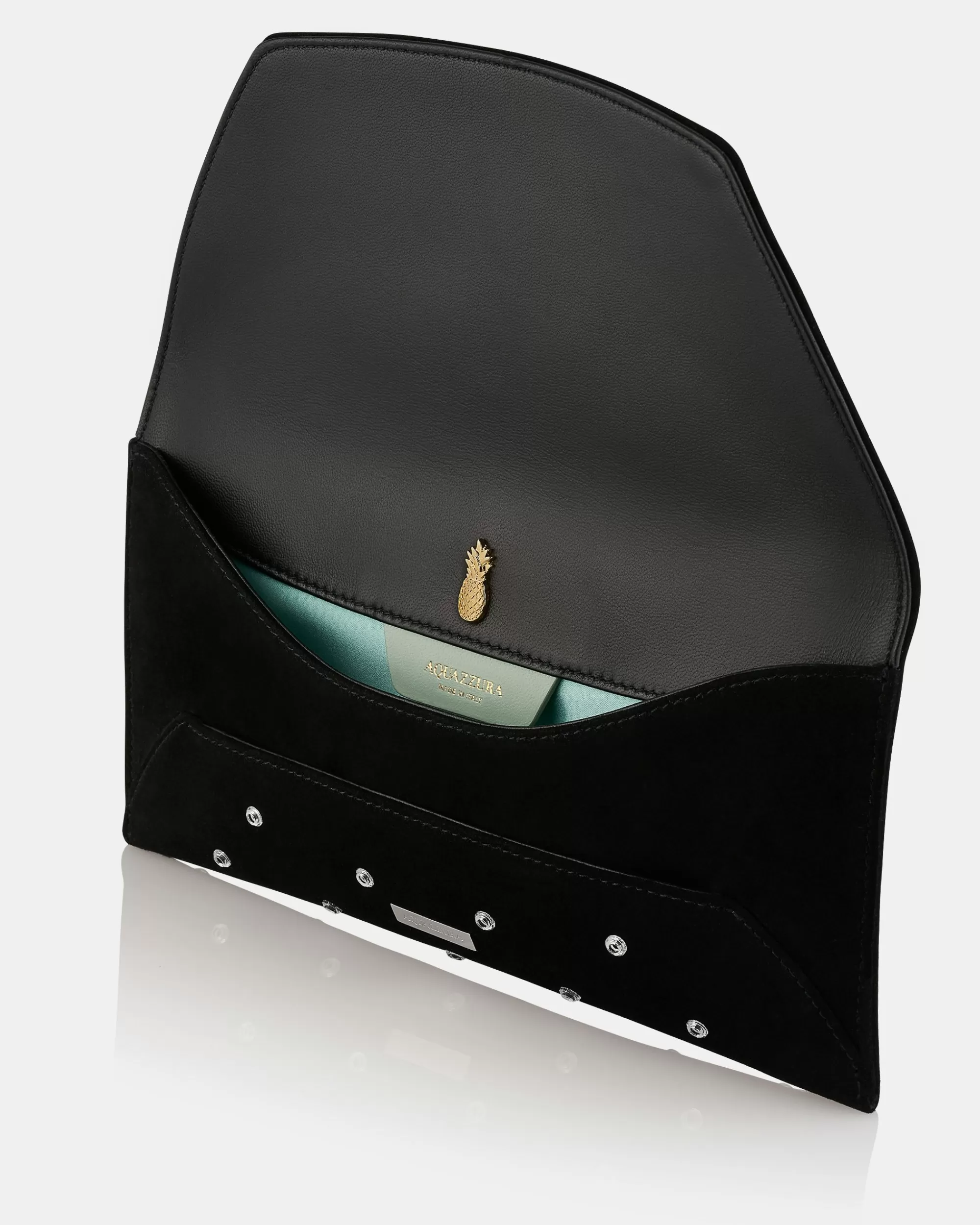 A minimalist design that whispers chic: our Envelope Crystal Clutch is crafted in Italy from black suede and leather in a petite, structured shape, punctuated with glistening gems. Tuck it under your arm if you need your hands free at parties.
