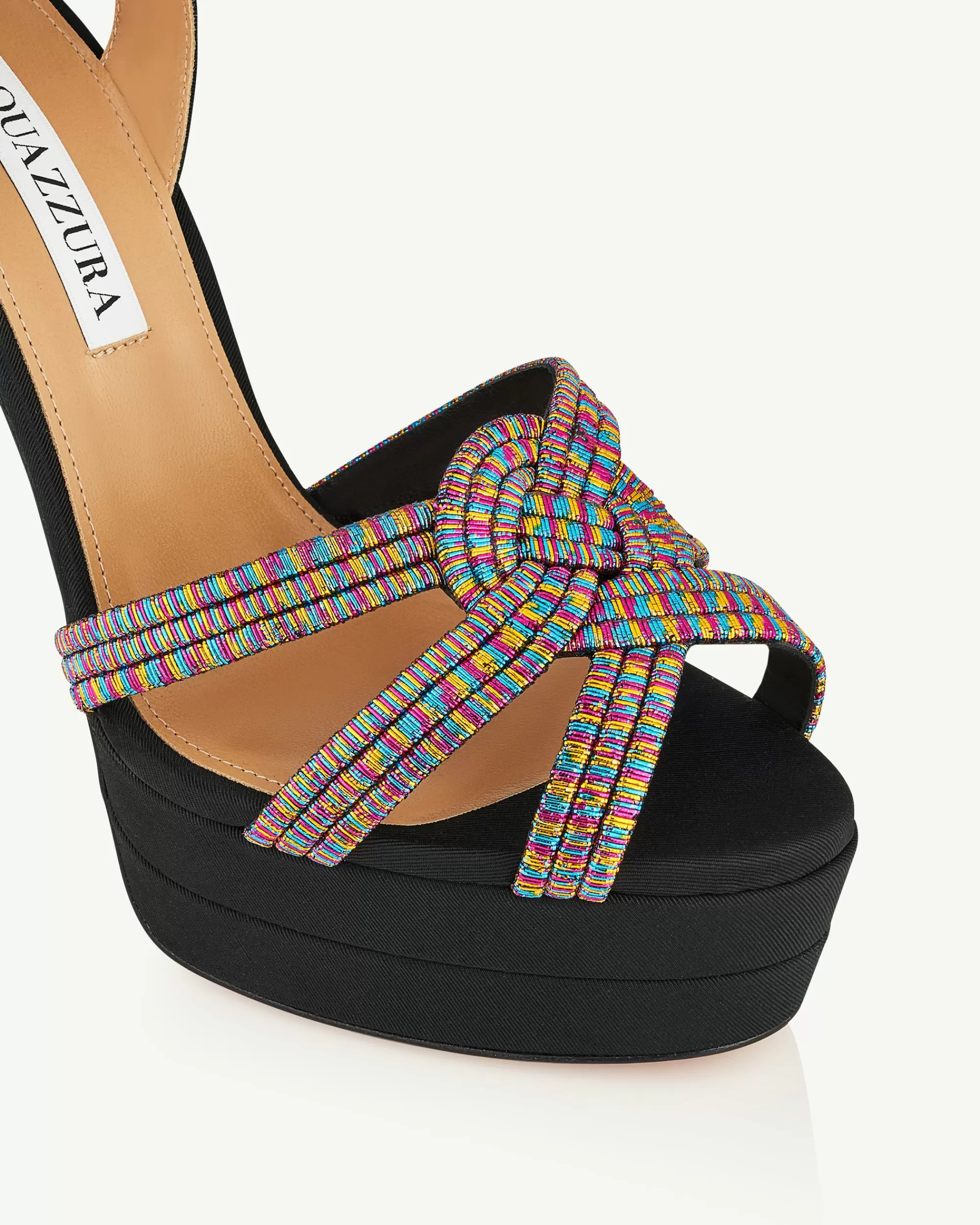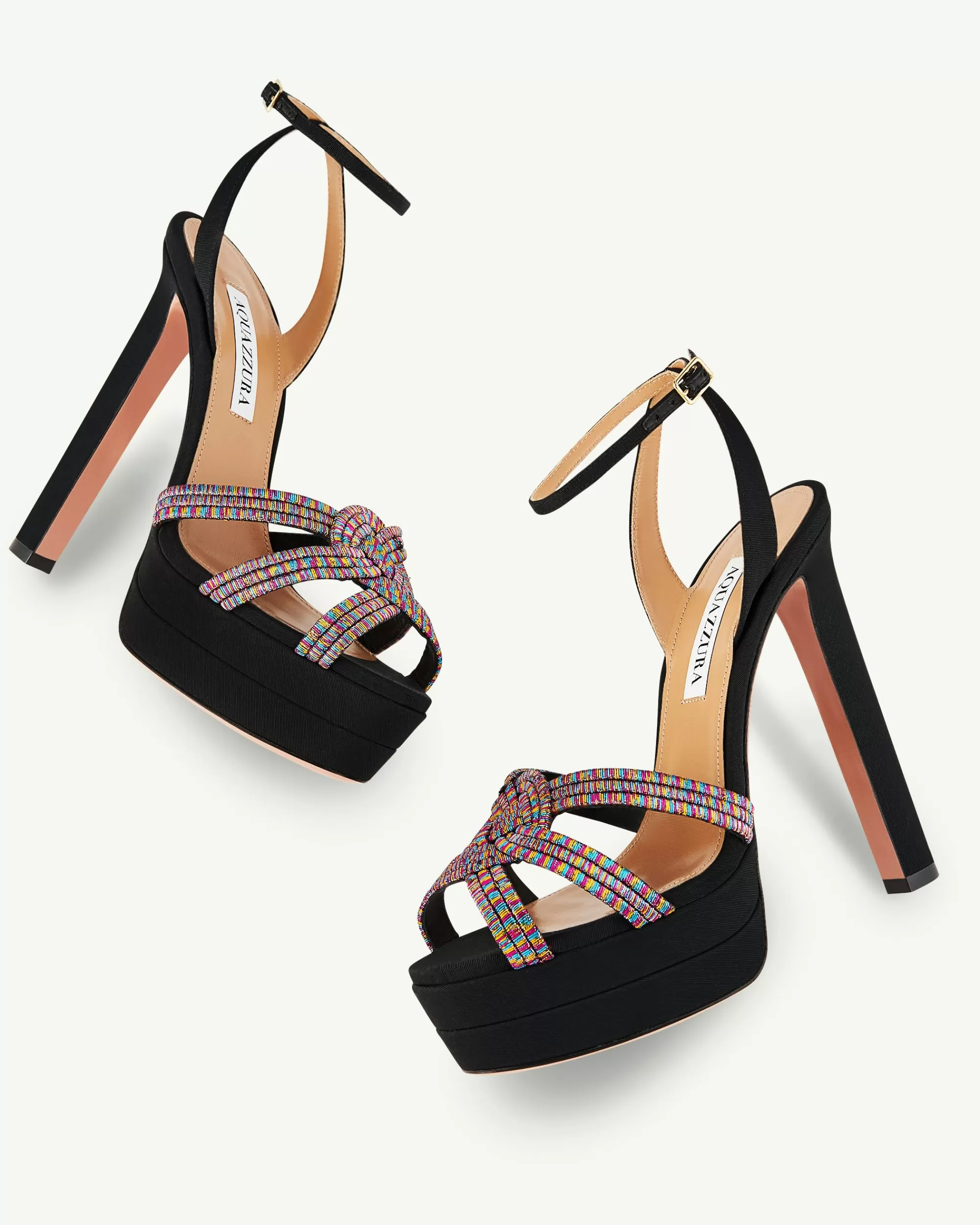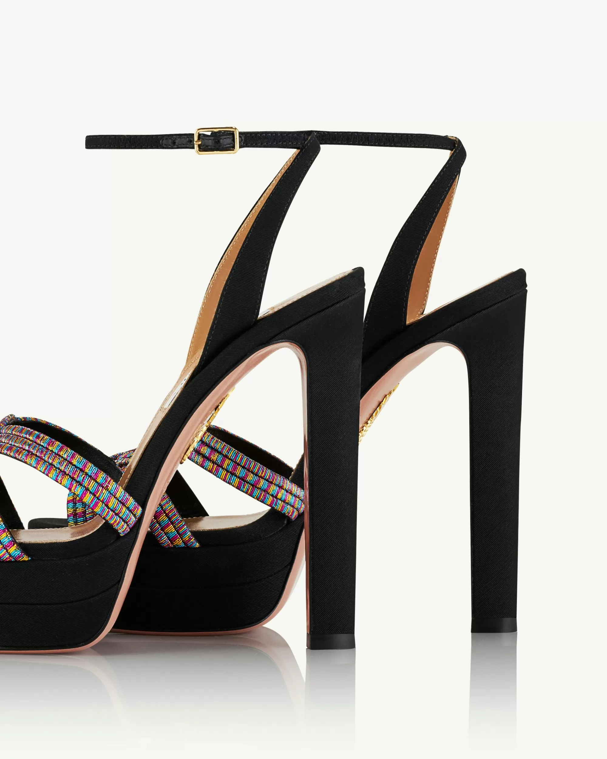 Decadent, sophisticated, irresistible: meet our Felix Plateau Sandals. The rainbow-hued, intricately woven upper is paired with smooth black grosgrain for a chic contrast. Expertly crafted in Italy, they have towering 130 mm heels, sturdy platforms and dainty ankle straps that make legs look slimmer.