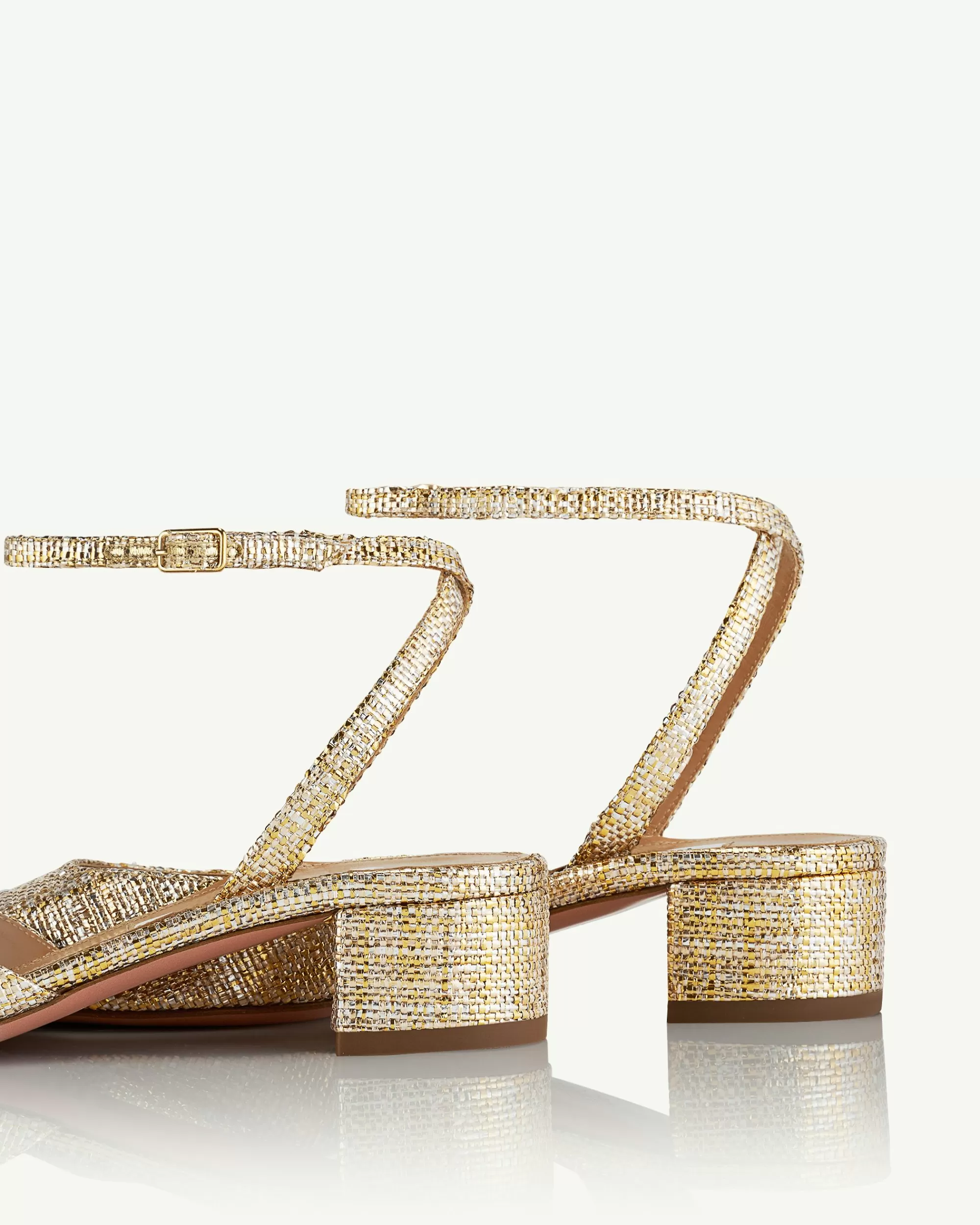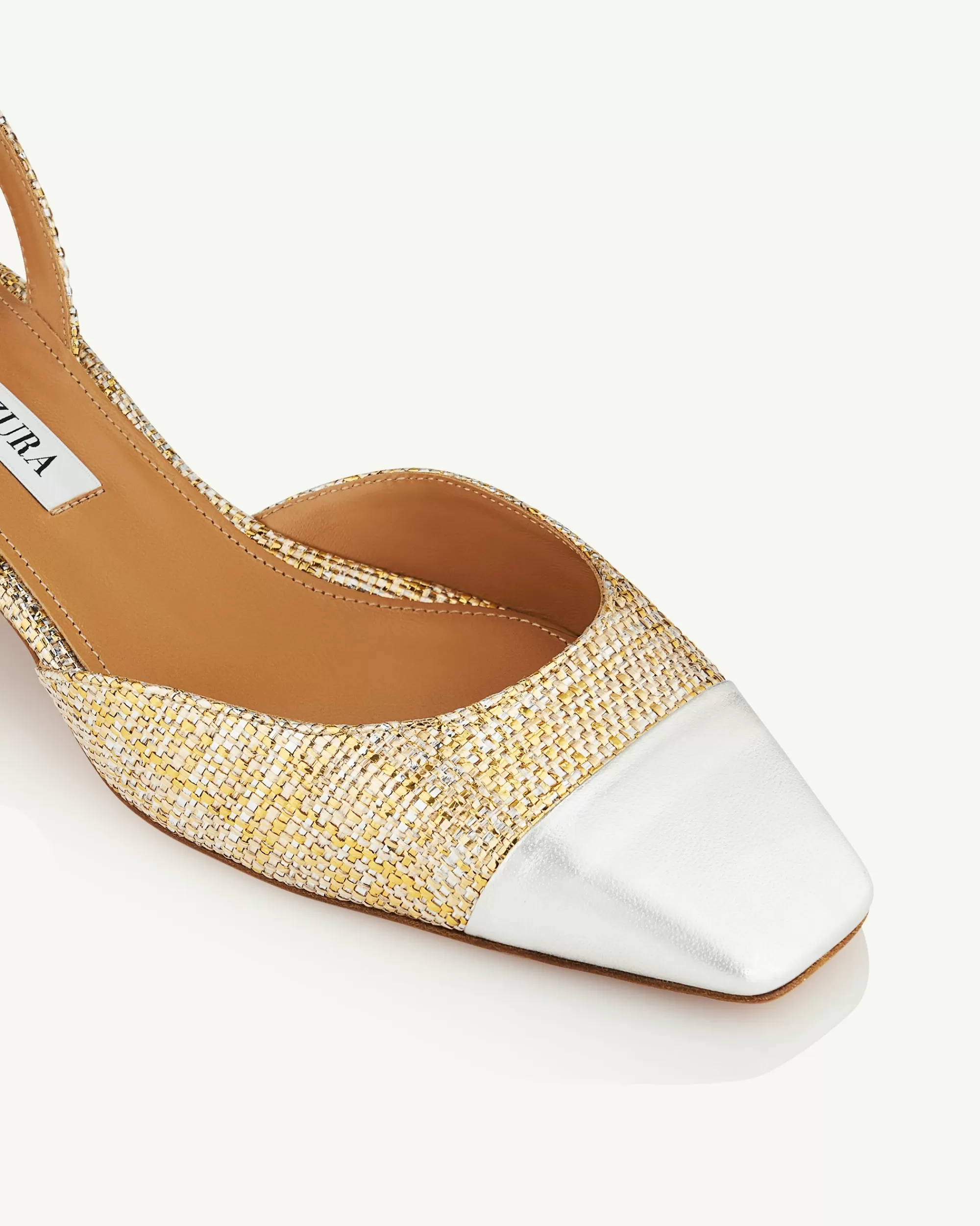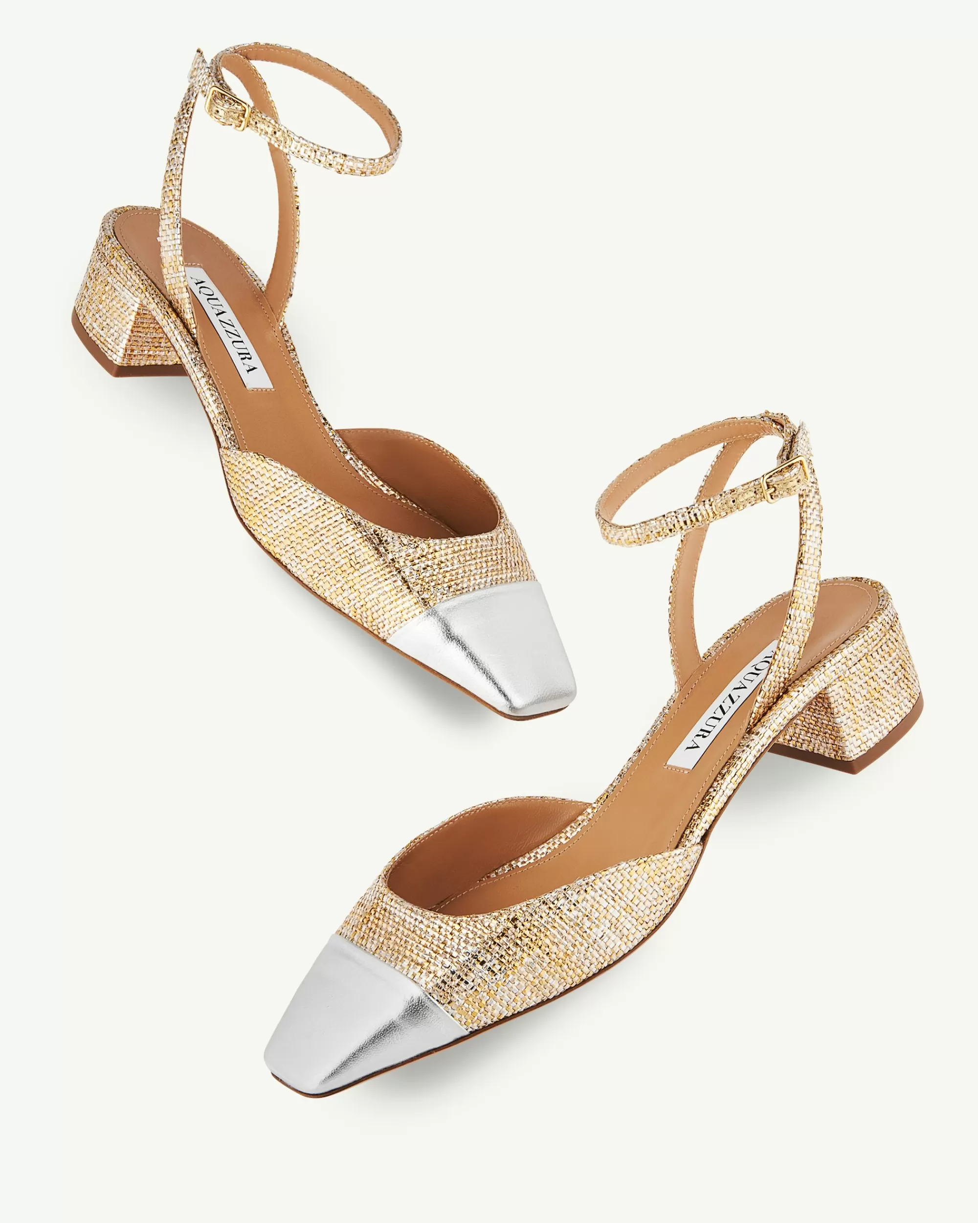 With their backless silhouette and contrasting toe caps, our French Flirt Pumps more than live up to their name. Theyre lifted on comfortable 35 mm block heels and have dainty ankle straps for support. This seasonal iteration showcases a modern mixed-metal finish, pairing textured gold panels with smooth silver leather.