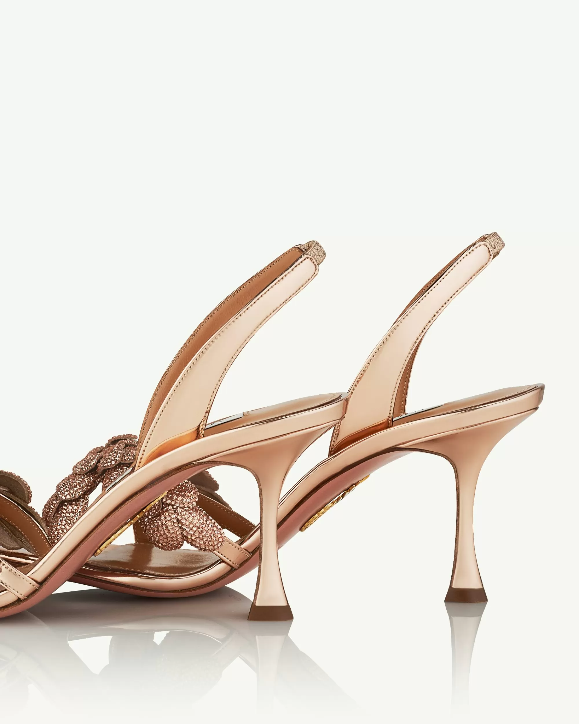 Our Galactic Flower Sandals will bring a touch of otherworldly sparkle to any look. The barely-there slingback silhouette is topped with glistening crystal-encrusted blooms and set on 75 mm heels that perfectly marry versatility and glamour. This exquisite pair is crafted from snakeskin-embossed leather and velvety suede in a romantic rose gold hue.