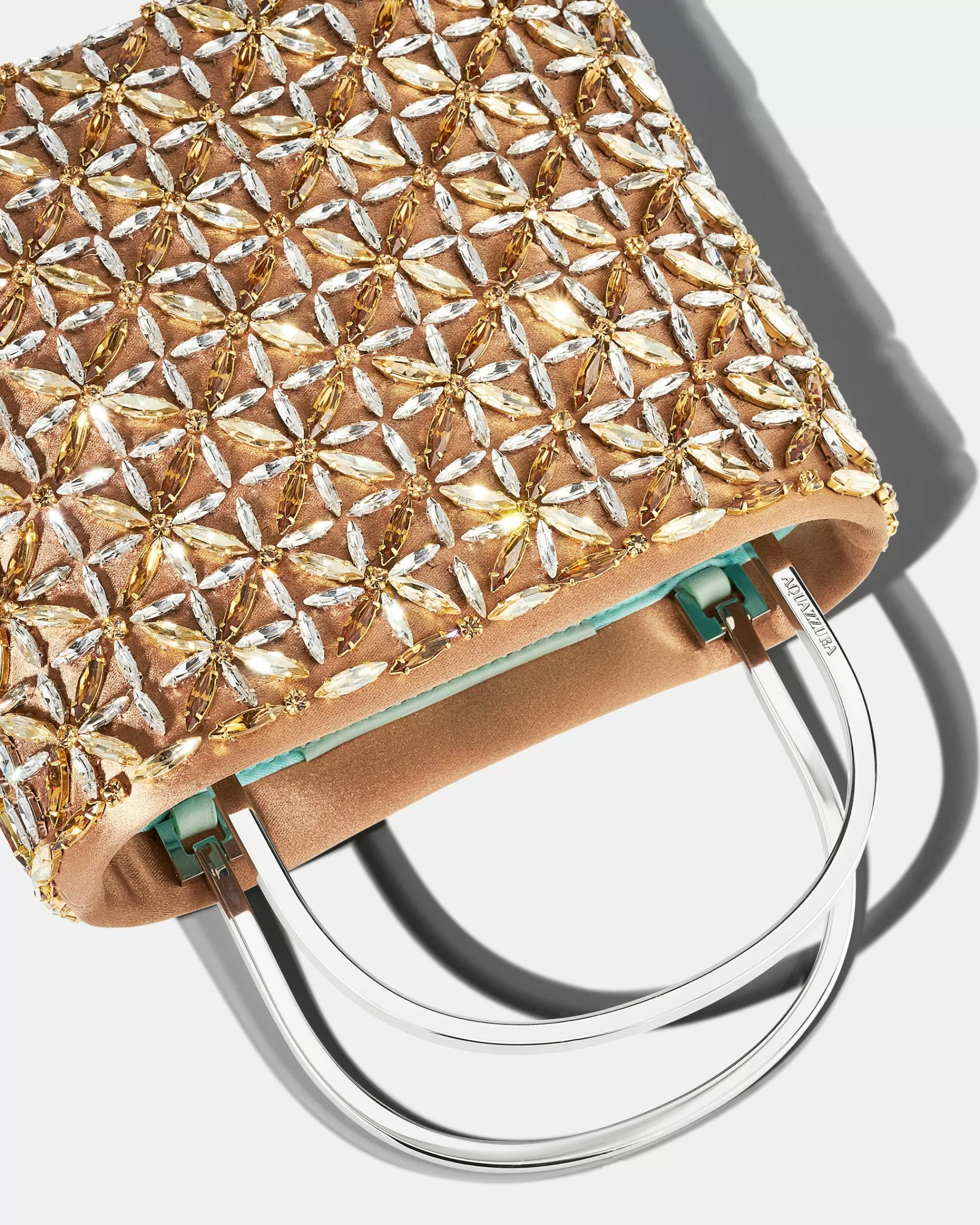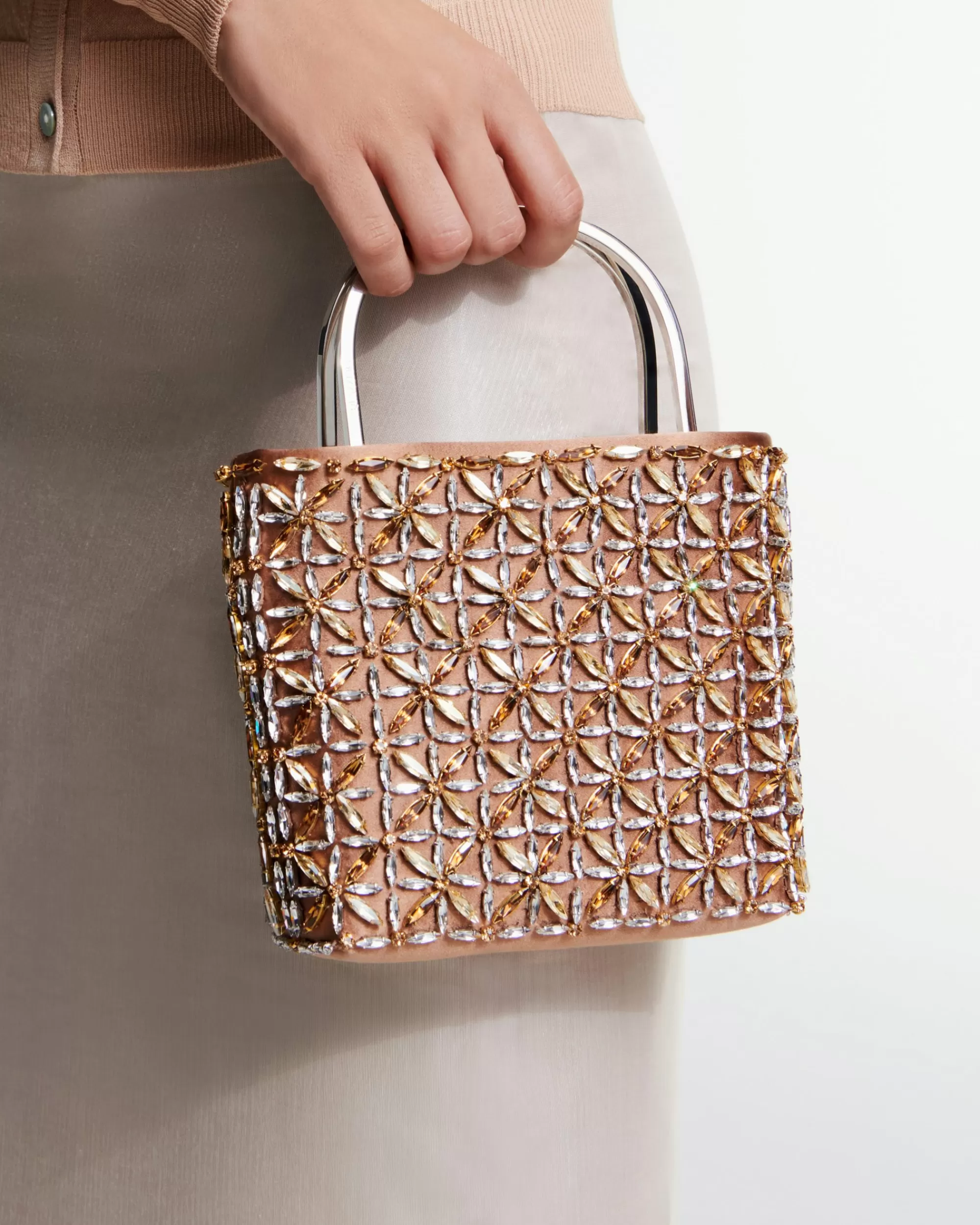 The perfect accessory to complete your after-dark looks, our Galaxy Mini Tote is embellished with crystals, intricately placed in floral formations. The luminous satin base in a neutral Topaz hue works with pretty much any colour, while the palladium-tone metal top handles give it a minimalist, modern twist.