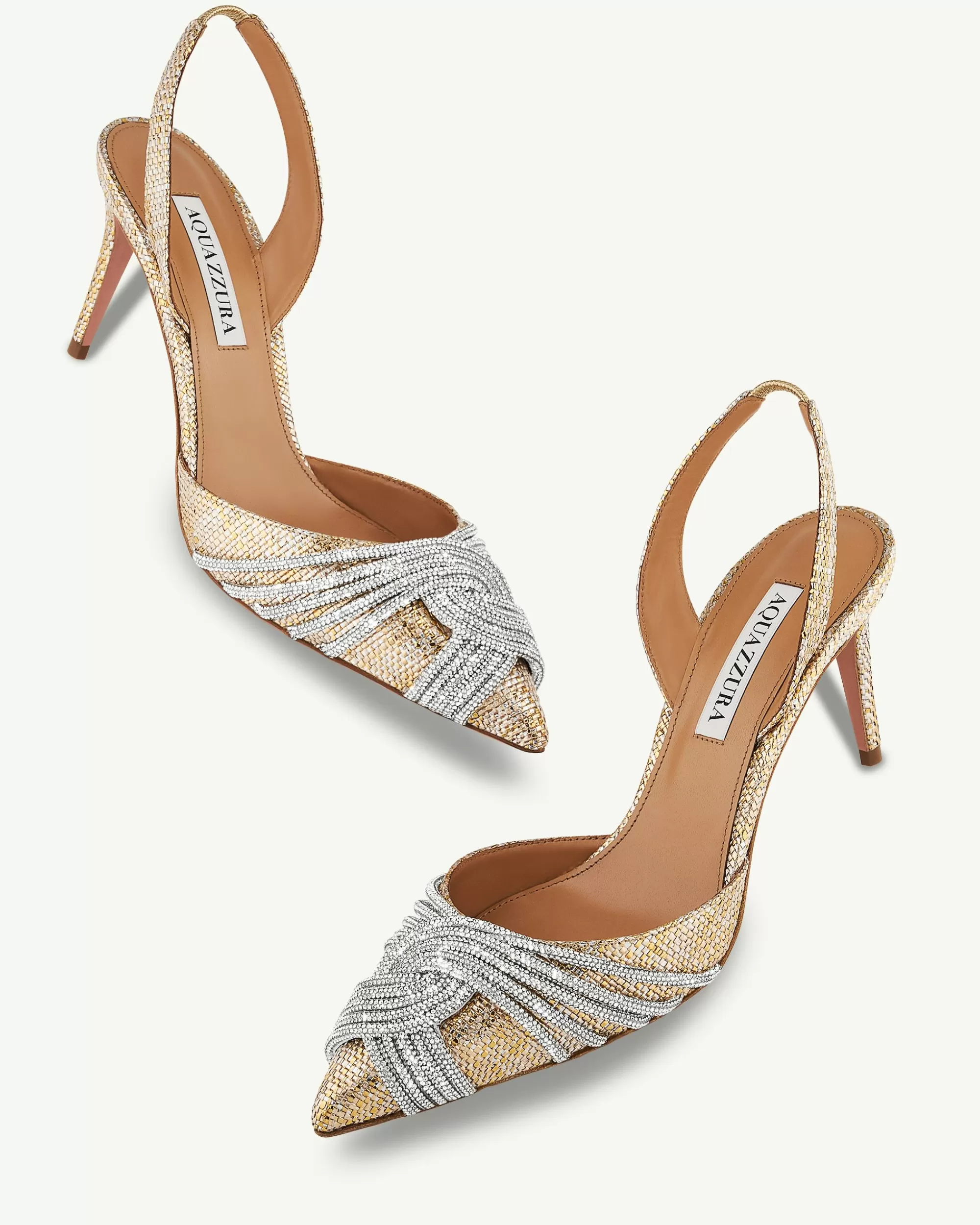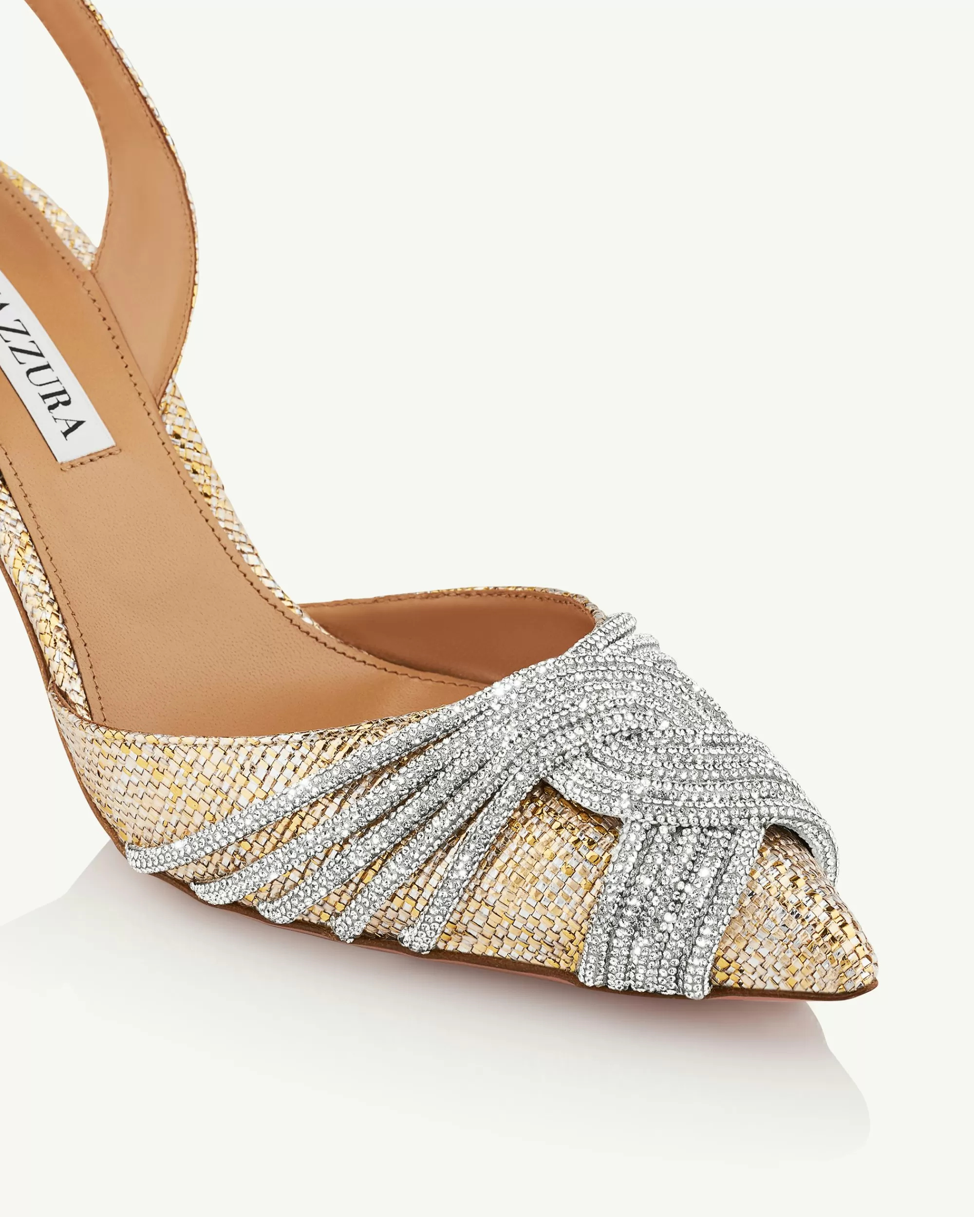 Our Gatsby Sling pumps prove that the next Roaring Twenties are right around the corner. This seasonal iteration combines an intricately woven texture with a subtle gold hue. Designed with a sharp pointed toe and topped with crystal embellishments for an extra dose of glamour, they have a 75 mm heel that makes them comfortable enough to dance all night.
