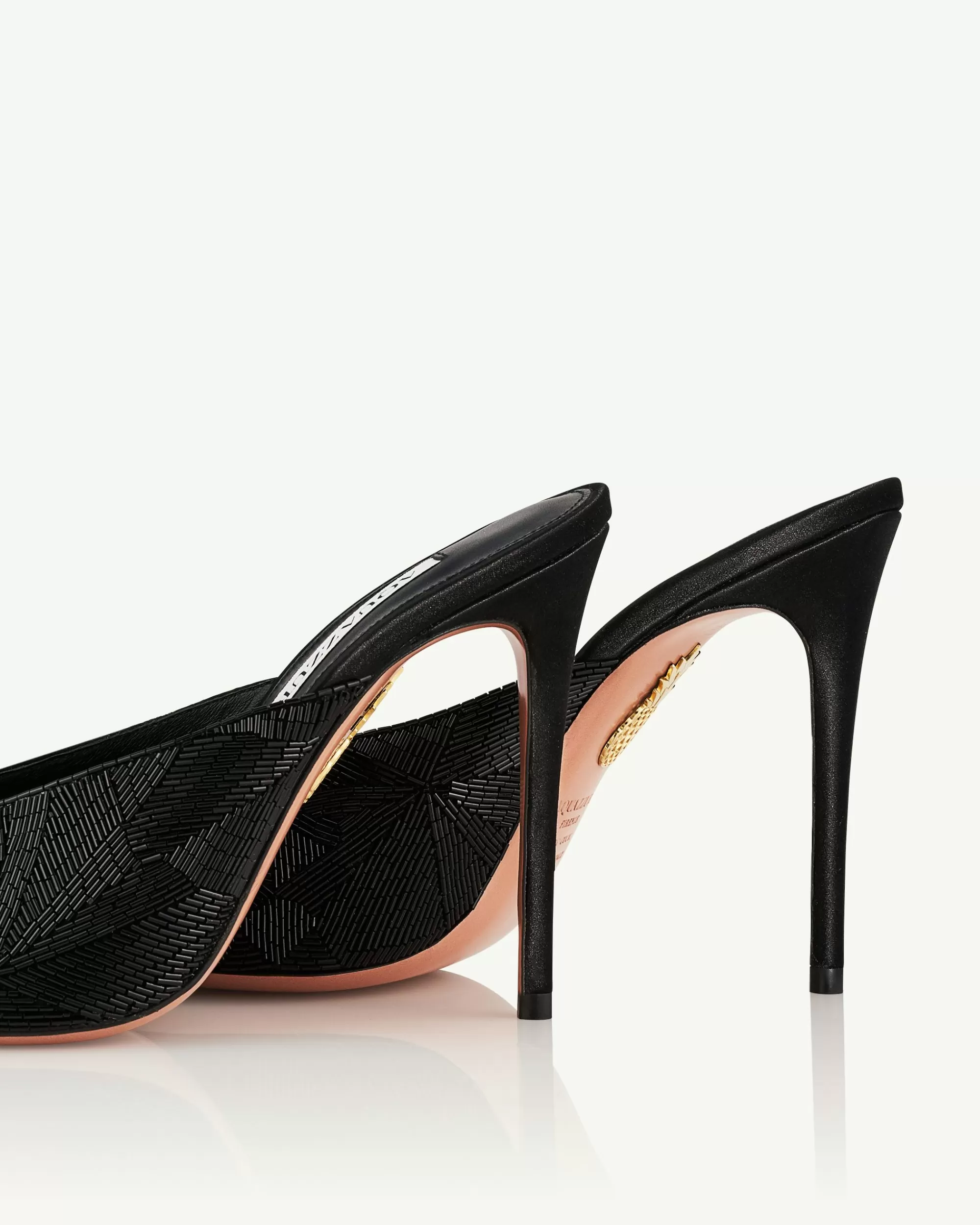 Dare to step into the spotlight in our La Nuit Mules. Designed with a 90s-inspired minimalist profile and elegant peep toes, theyre crafted from lustrous black satin that softly catches the light. The 105 mm stiletto heels encapsulate Aquazzuras signature seductive appeal.