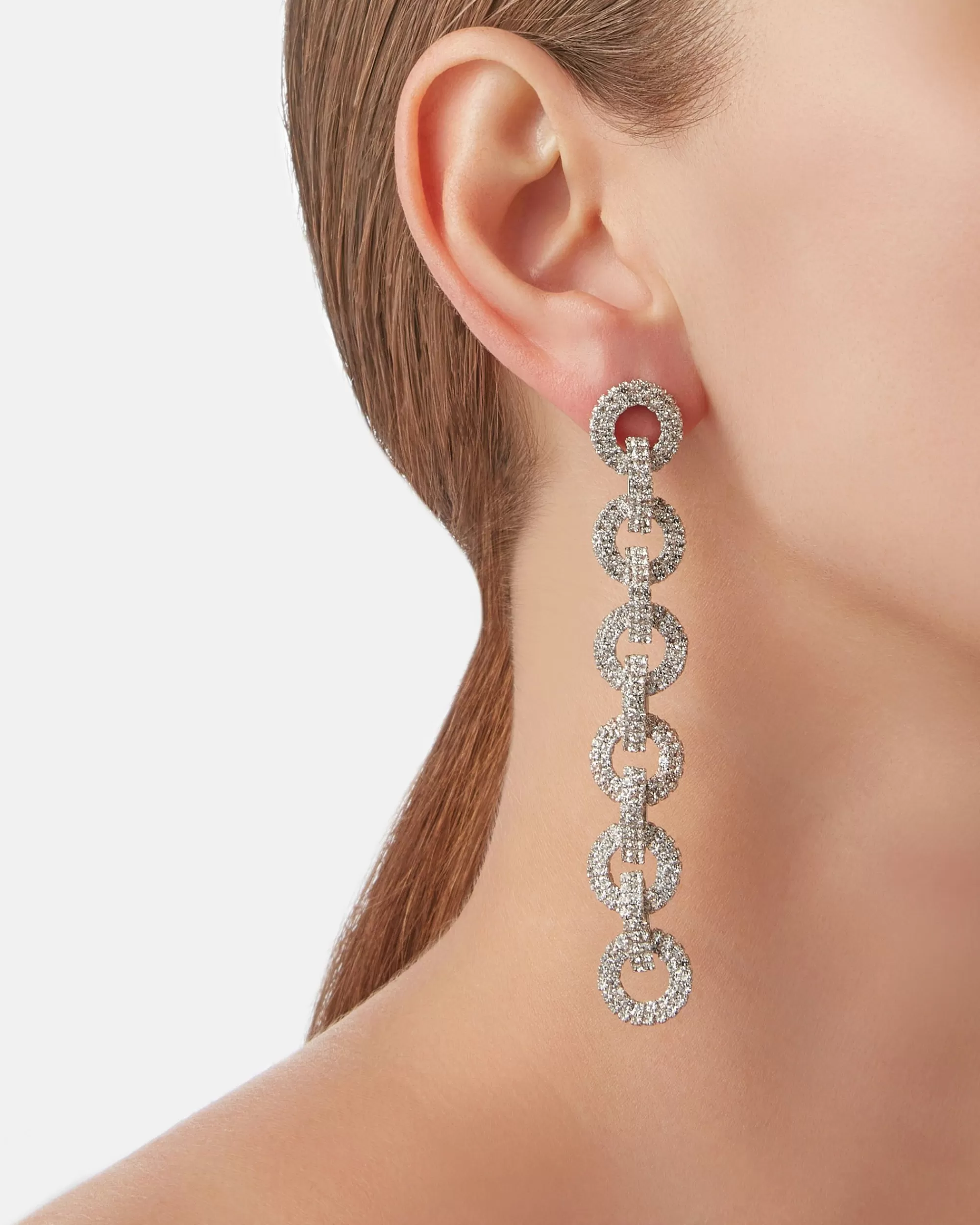 Our Love Link Earrings will be the focal point of your outfit. Crafted from glossy strass and brass in shimmery silver, the style is embellished with crystals for additional sparkle. They secure with fasteners for pierced ears.