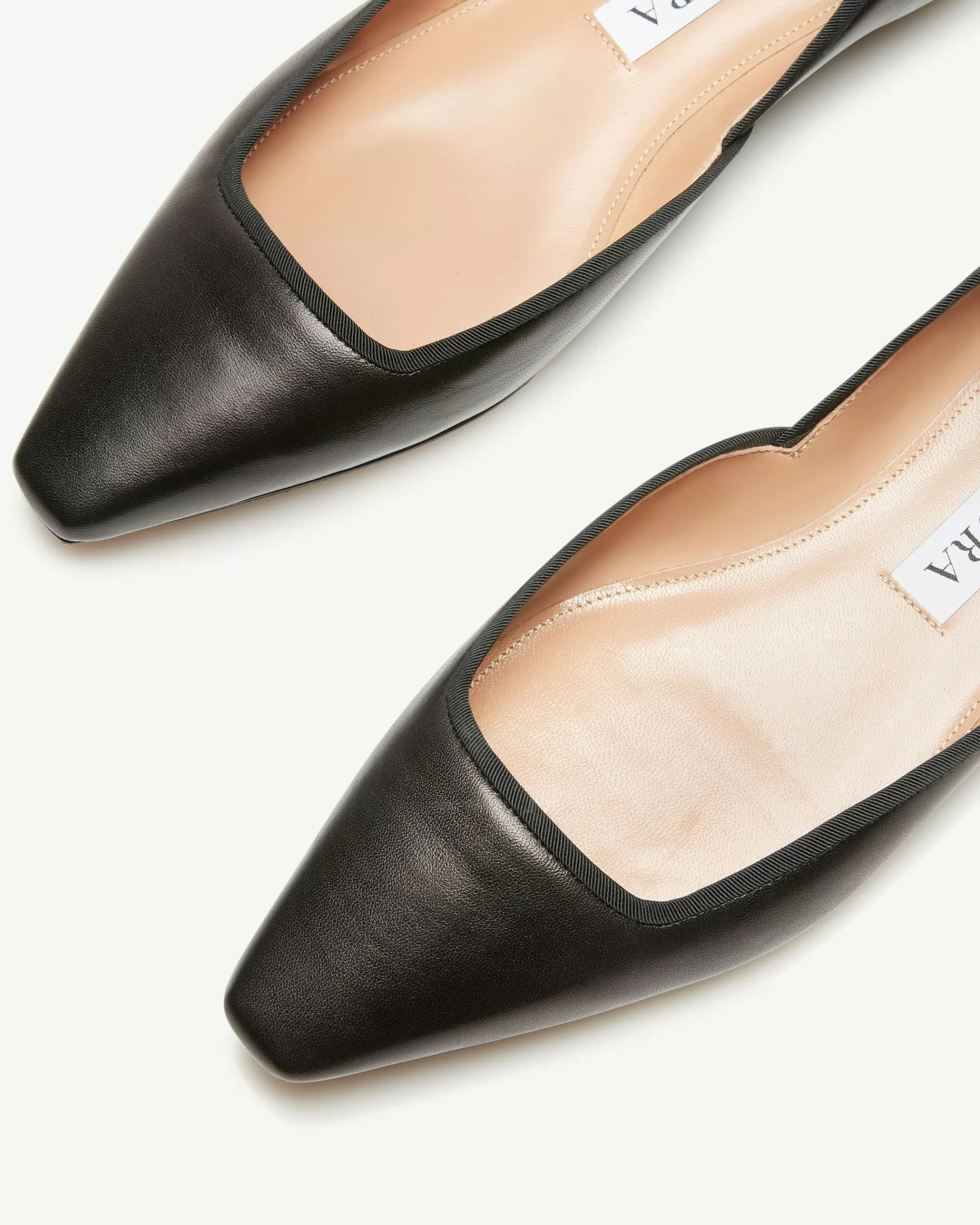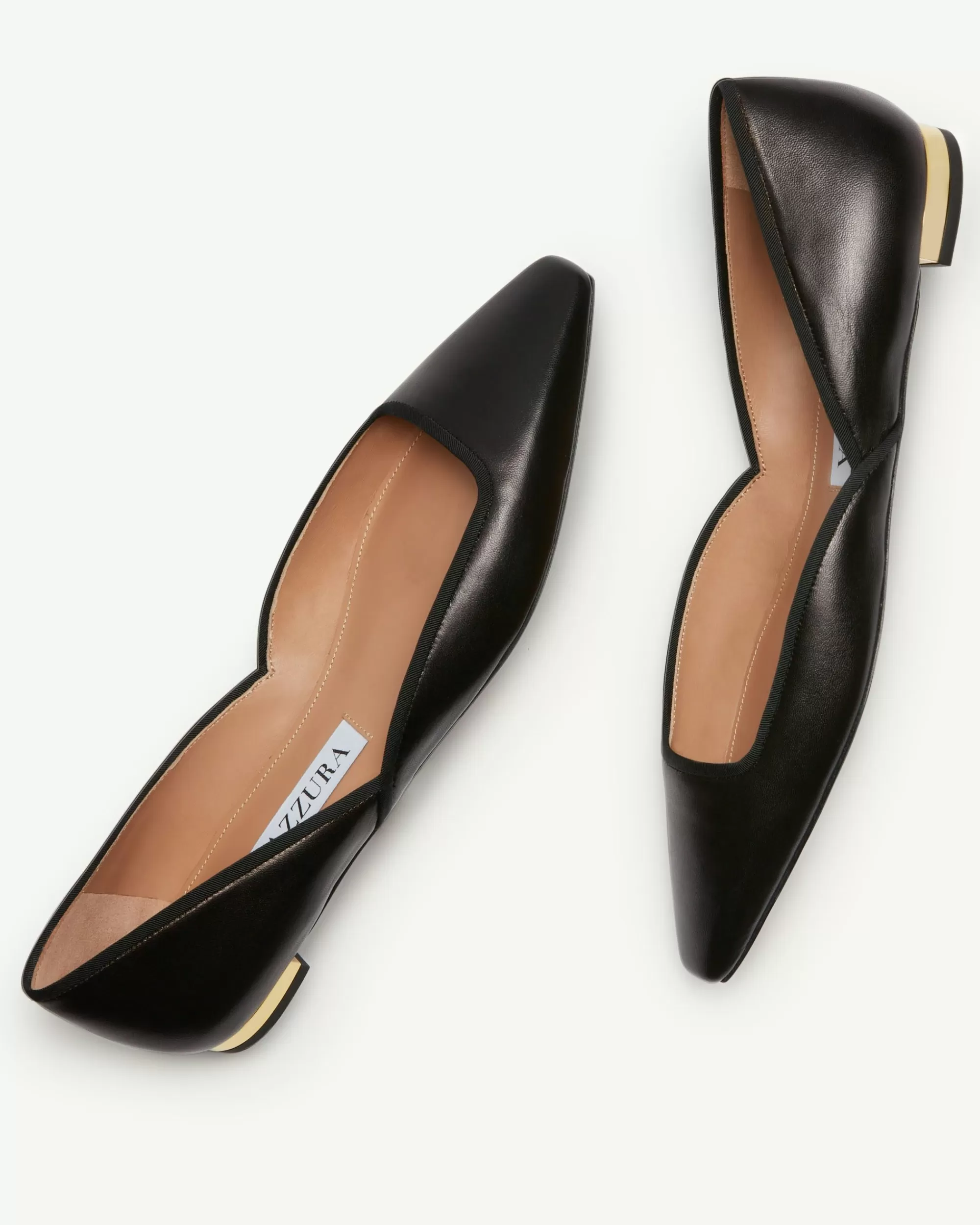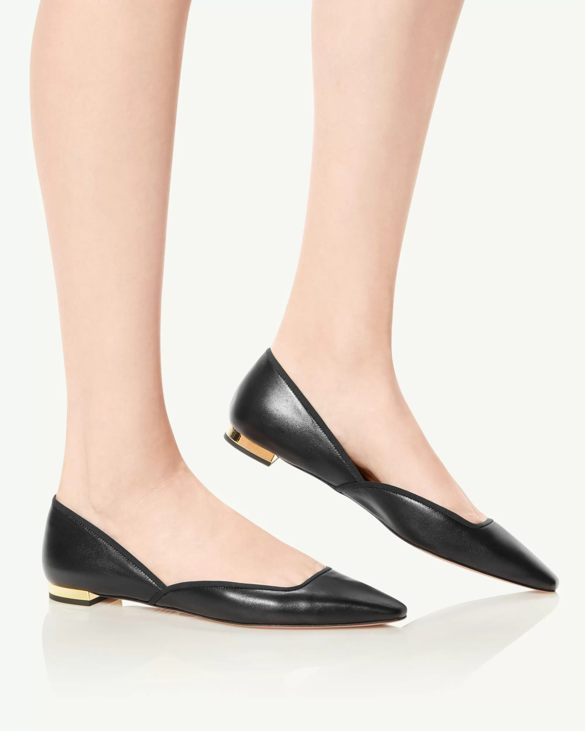Our Maia Flat will add a timeless and elegant addition to any ensemble. Made in Italy from supple nappa and grosgrain trim in rich black, the pointy toe pair features sensual side cut outs, a feminine sharp toe and is finished on a flat, metallic heel.