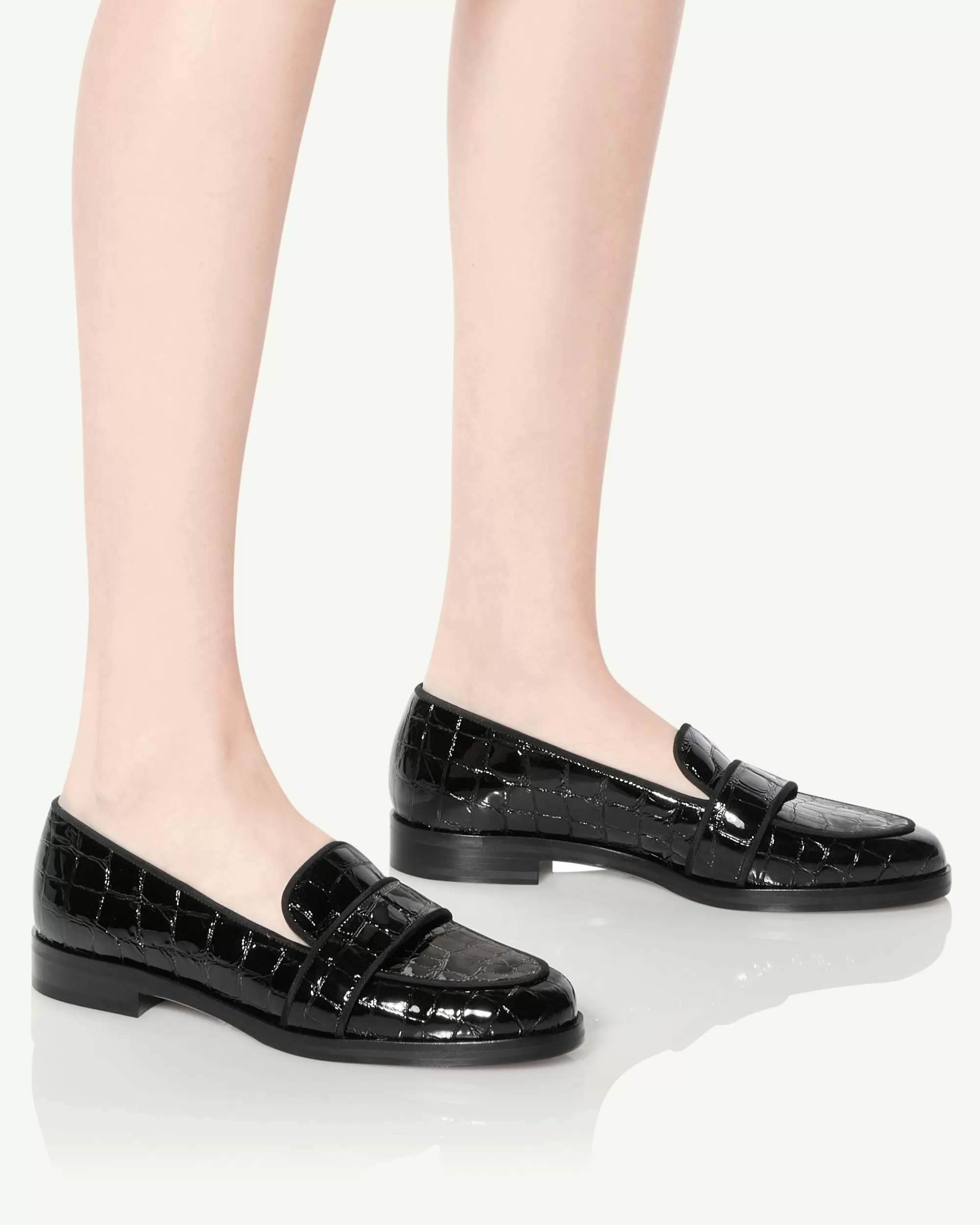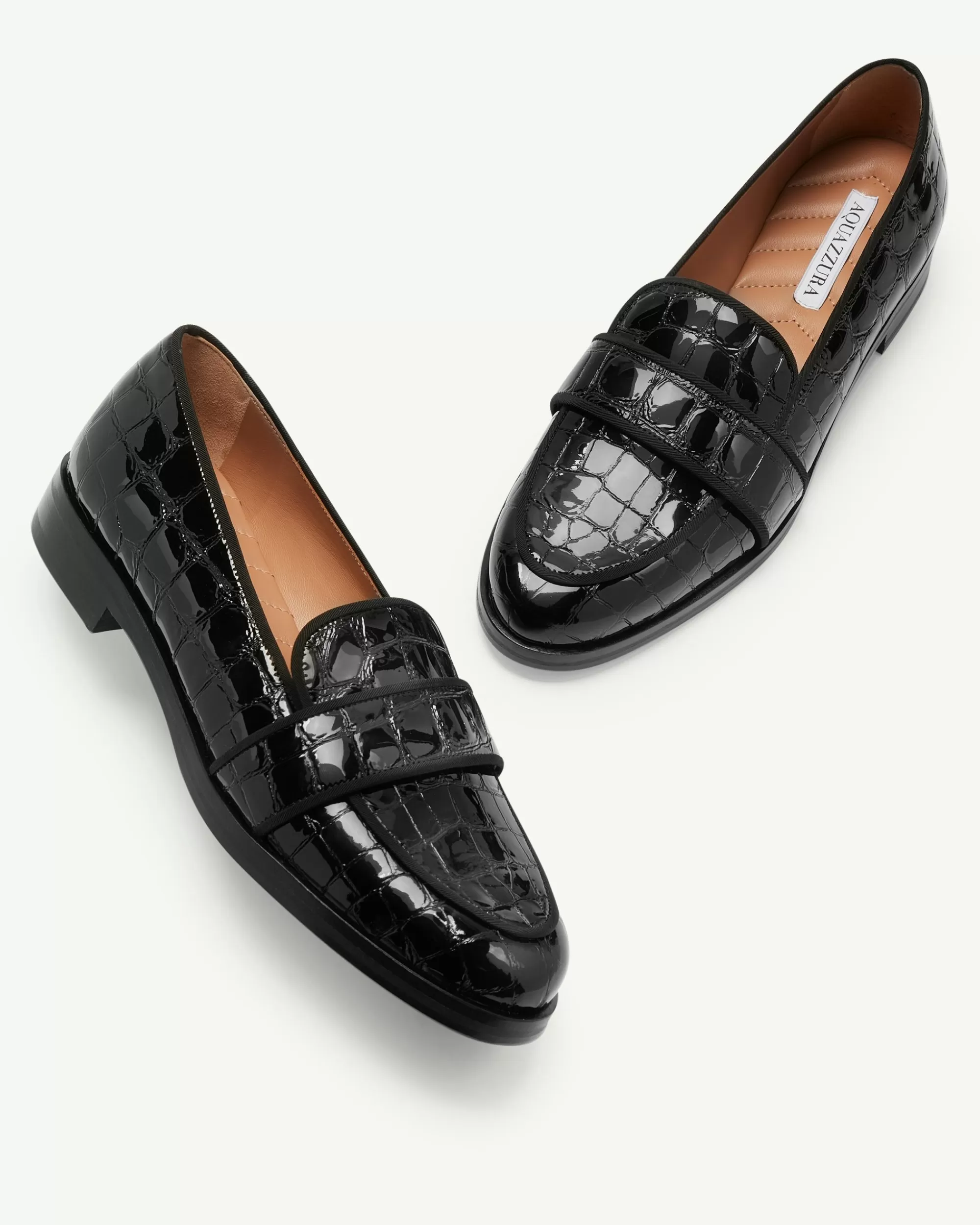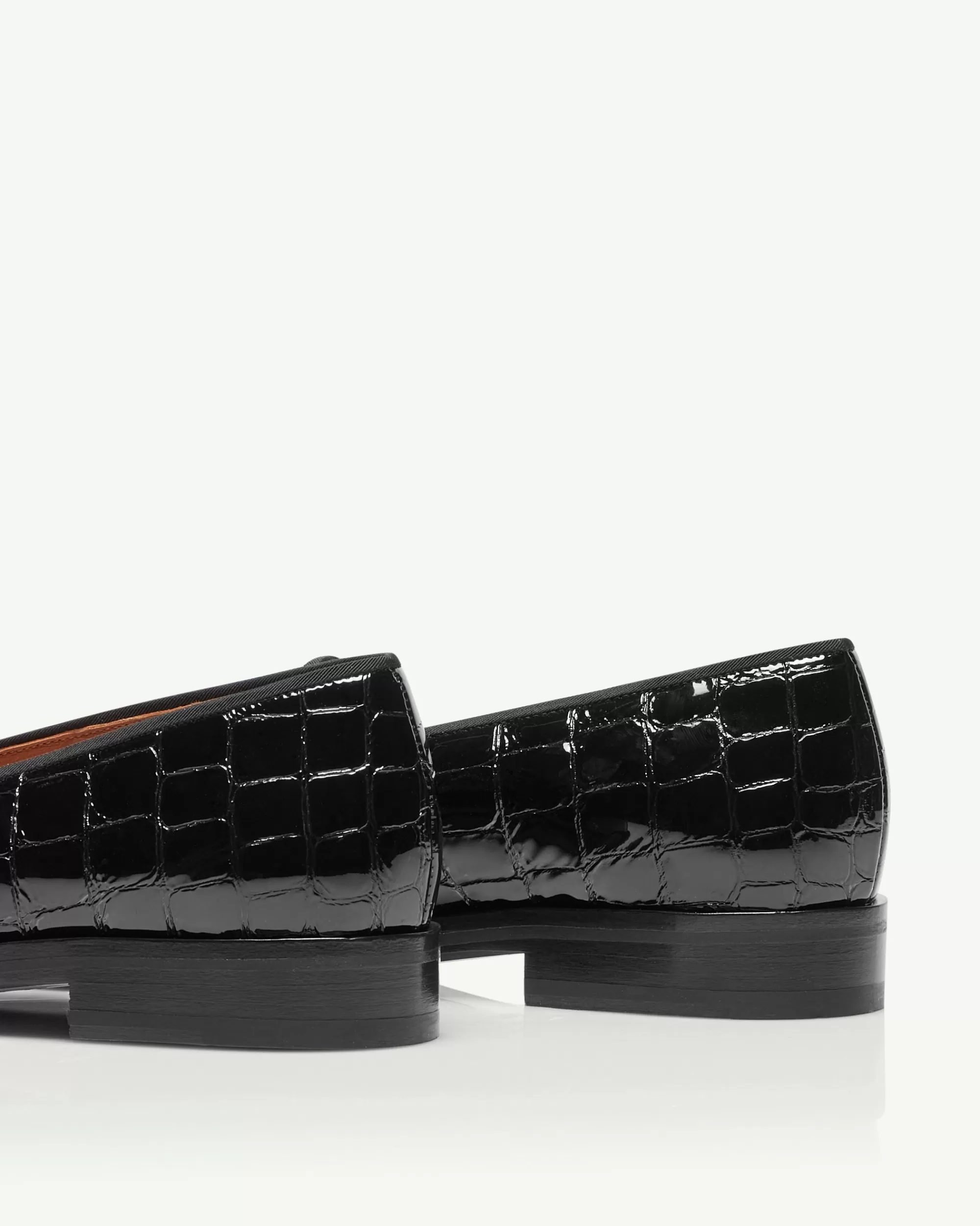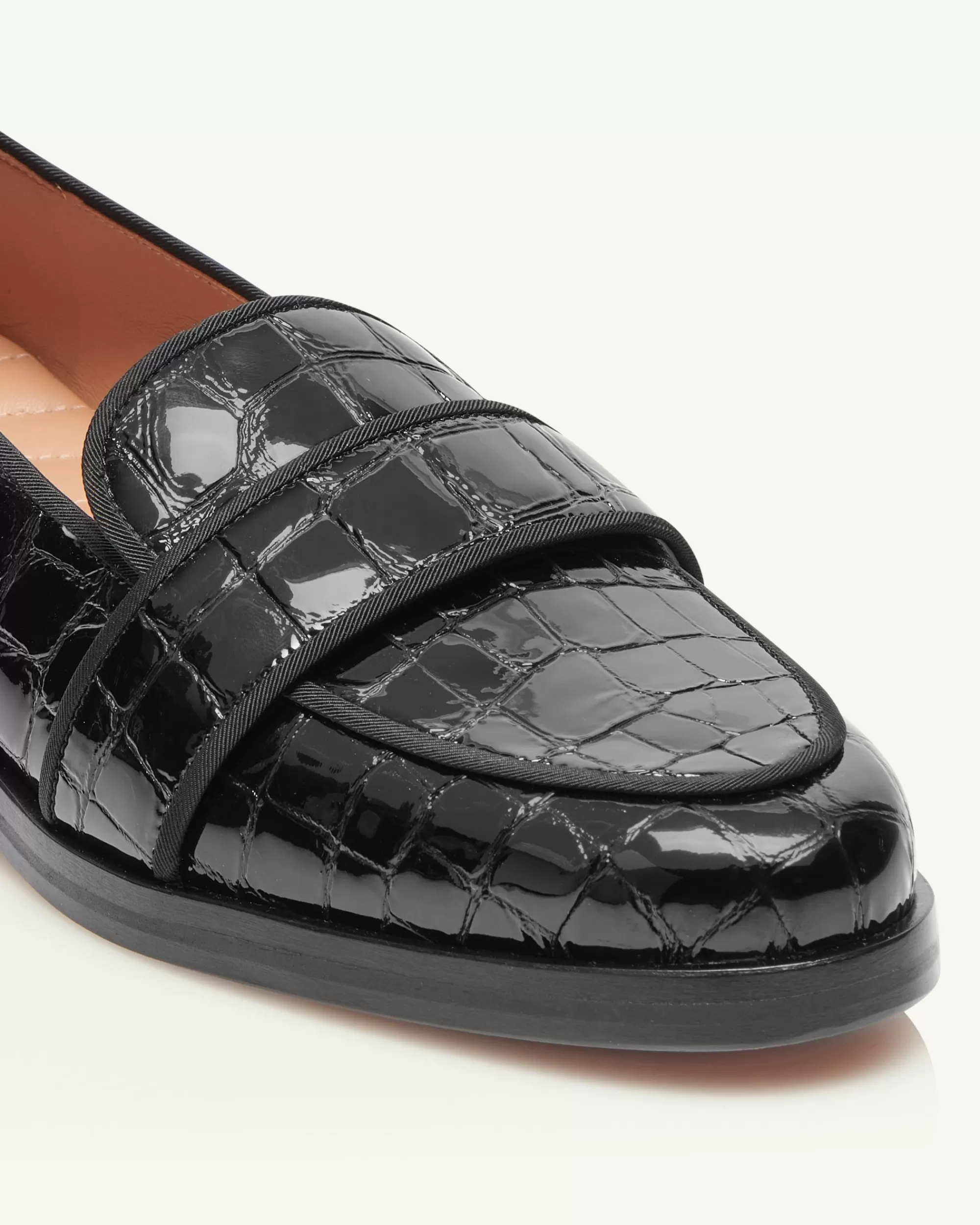 Every women’s wardrobe should include a classic pair of loafers. Our Martin Mocassins are made in Italy from sleek coco lux and grosgrain in rich black. The easy to wear style has a notched vamp, rounded toe and is finished on a comfortable, flat sole.
