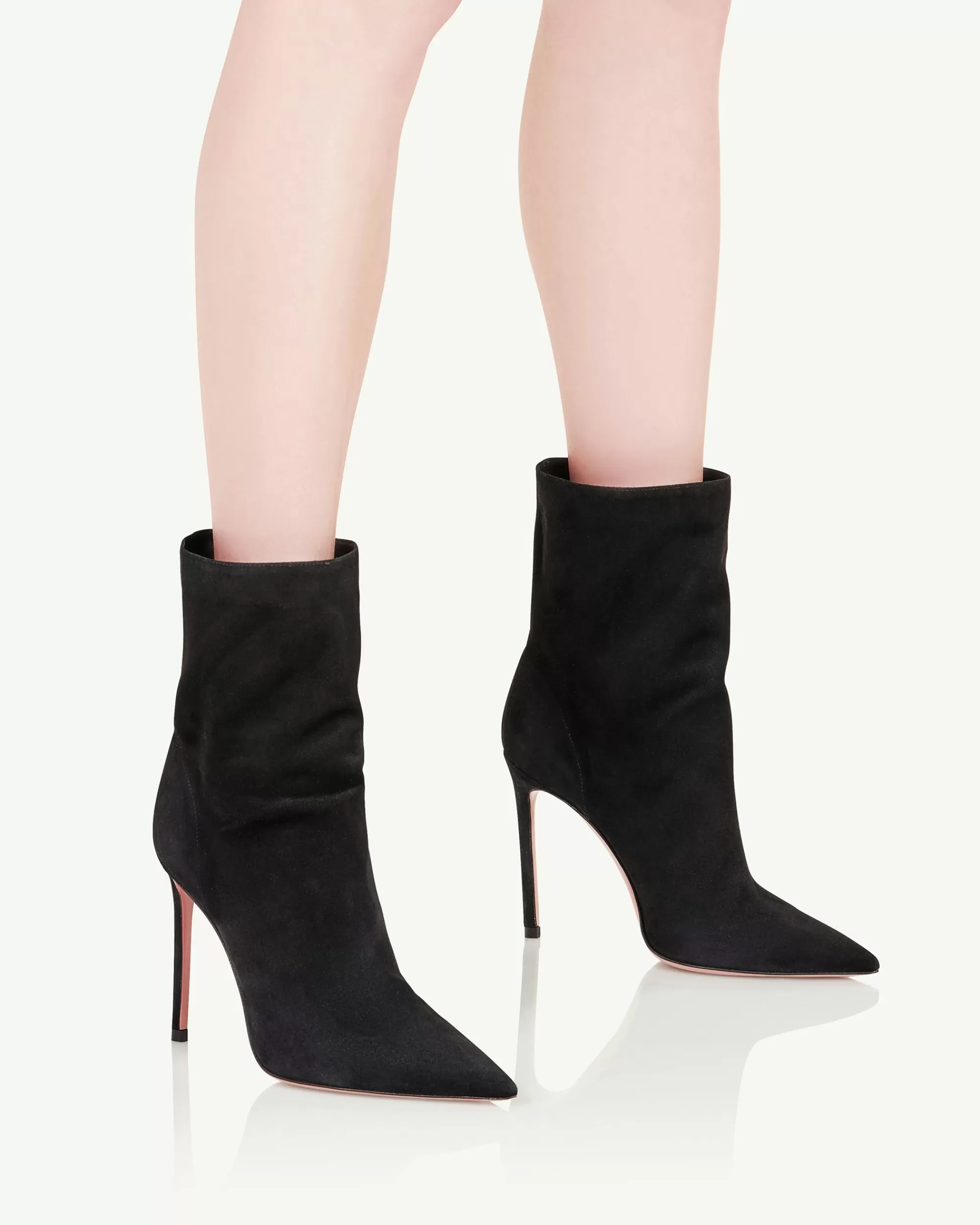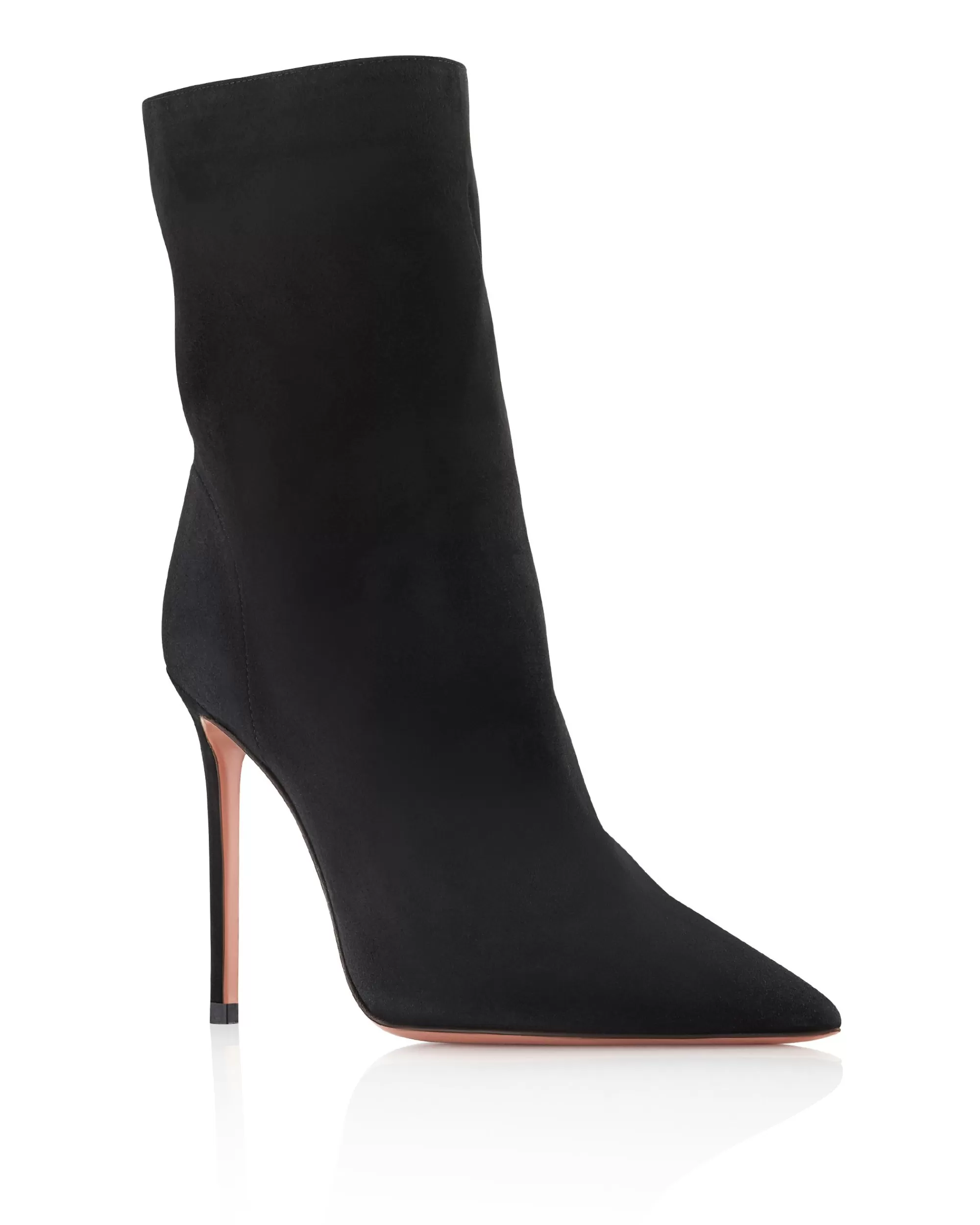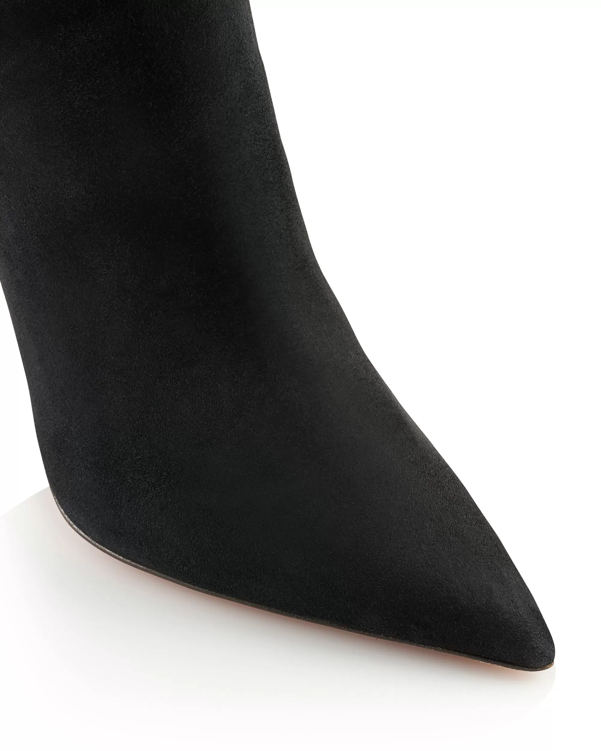 Our Matignon Booties will add a classic yet edgy addition to your closet. Made in Italy from our coveted buttery suede in rich black, the design is shaped to piercing pointy toes and is balanced on a pin-thin stiletto heel. Pair with a chic little black dress.