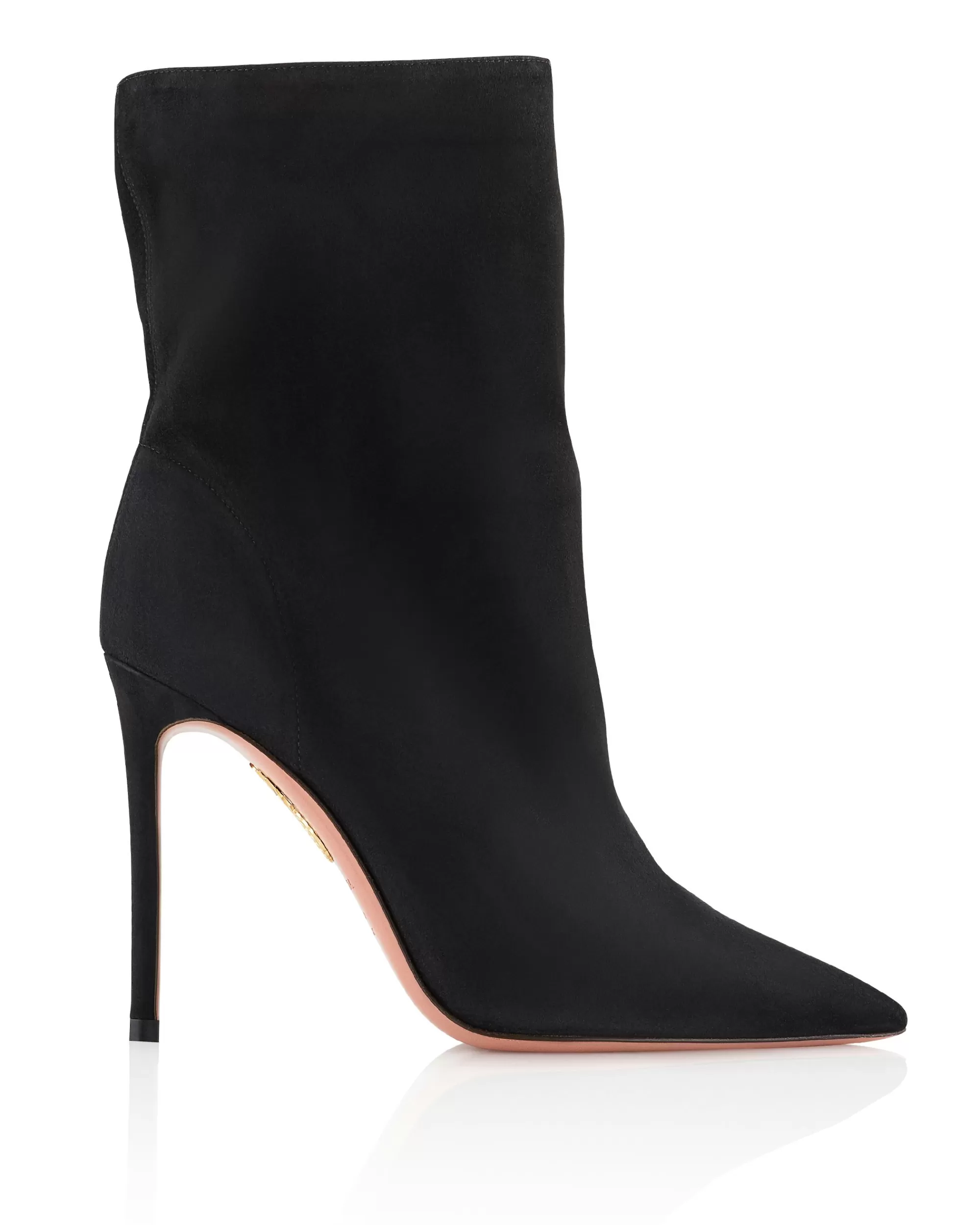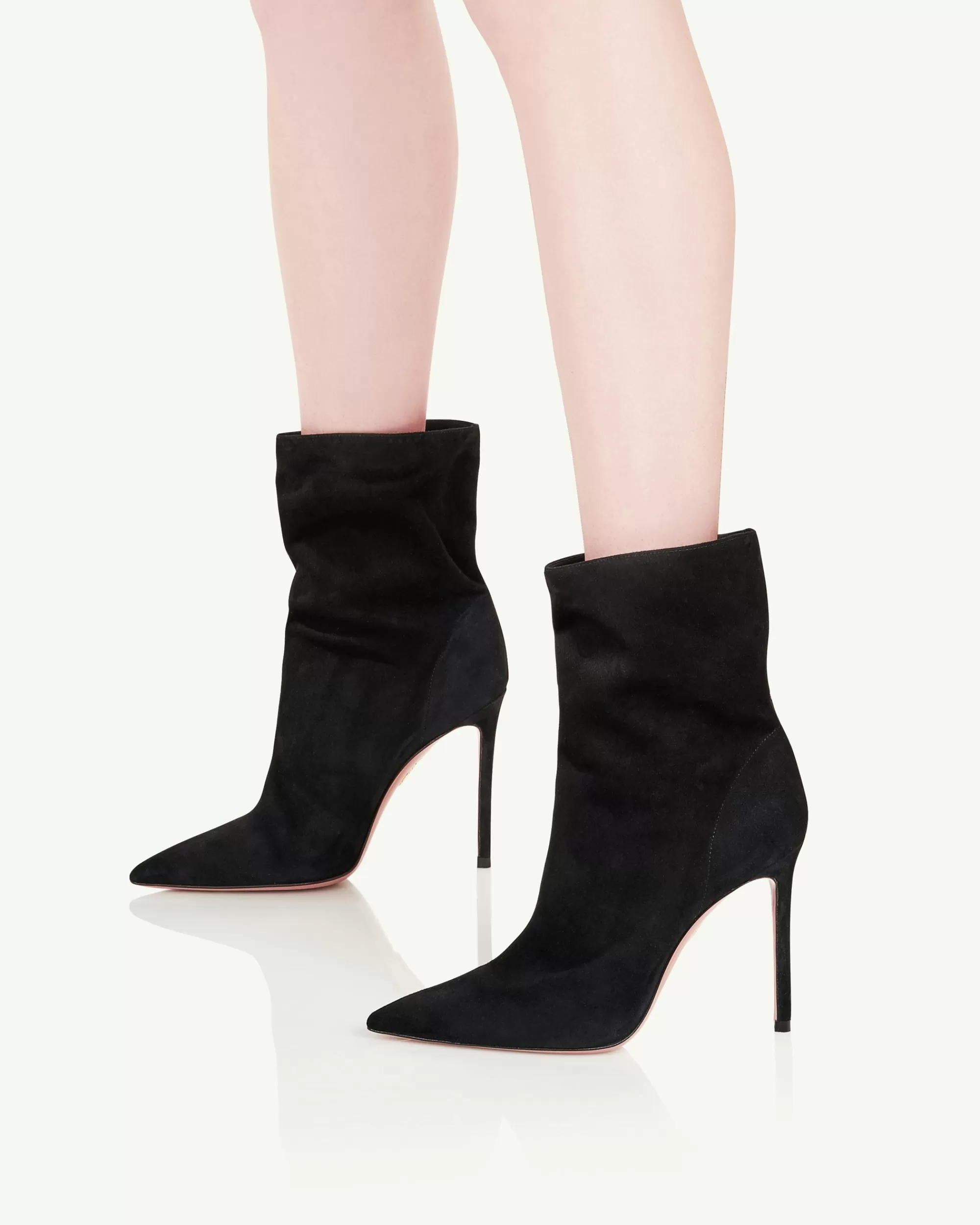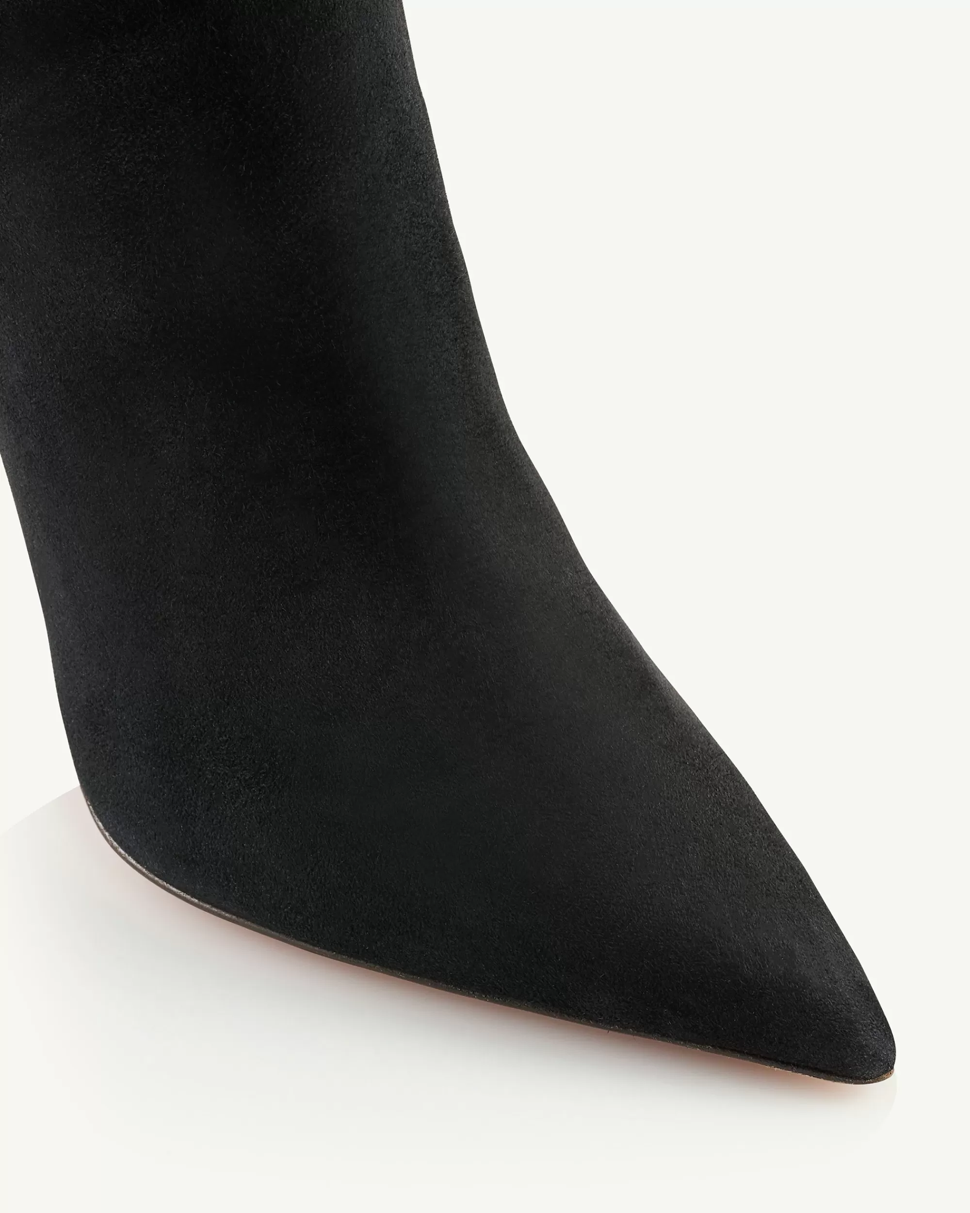 Our Matignon Booties will add a classic yet edgy addition to your closet. Made in Italy from our coveted buttery suede in rich black, the design is shaped to piercing pointy toes and is balanced on a pin-thin stiletto heel. Pair with a chic little black dress.