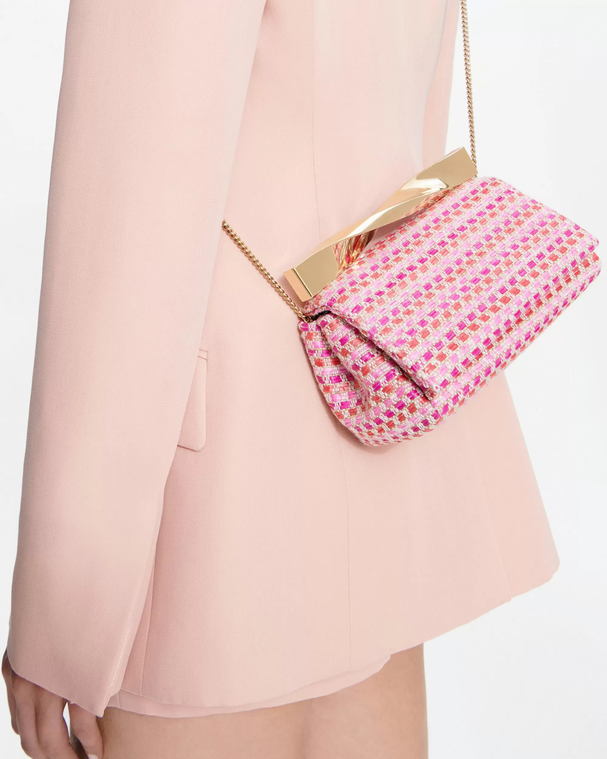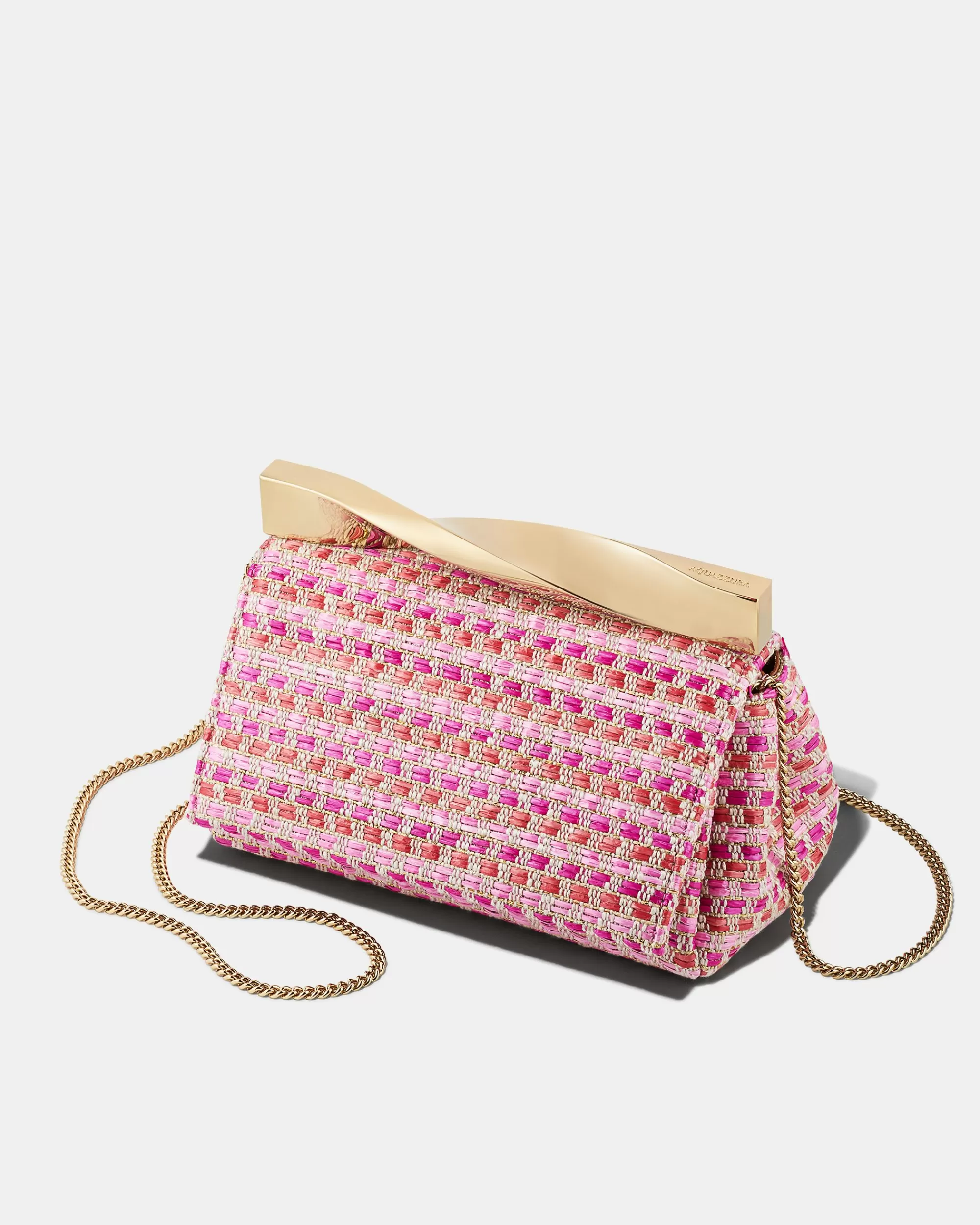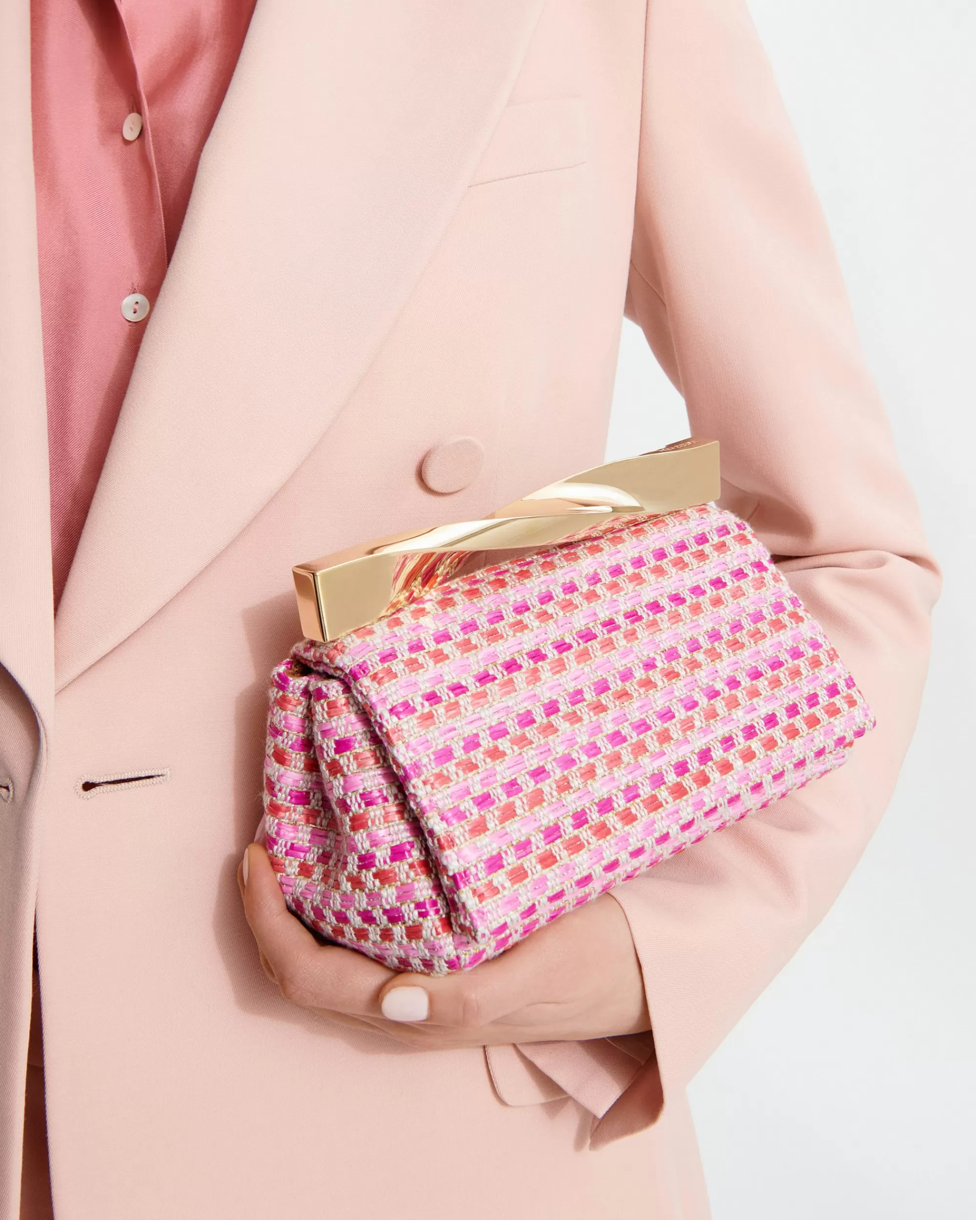 Our signature Twist Clutch downsized to mini proportions. This joyful iteration is made from woven raffia in pink and re…