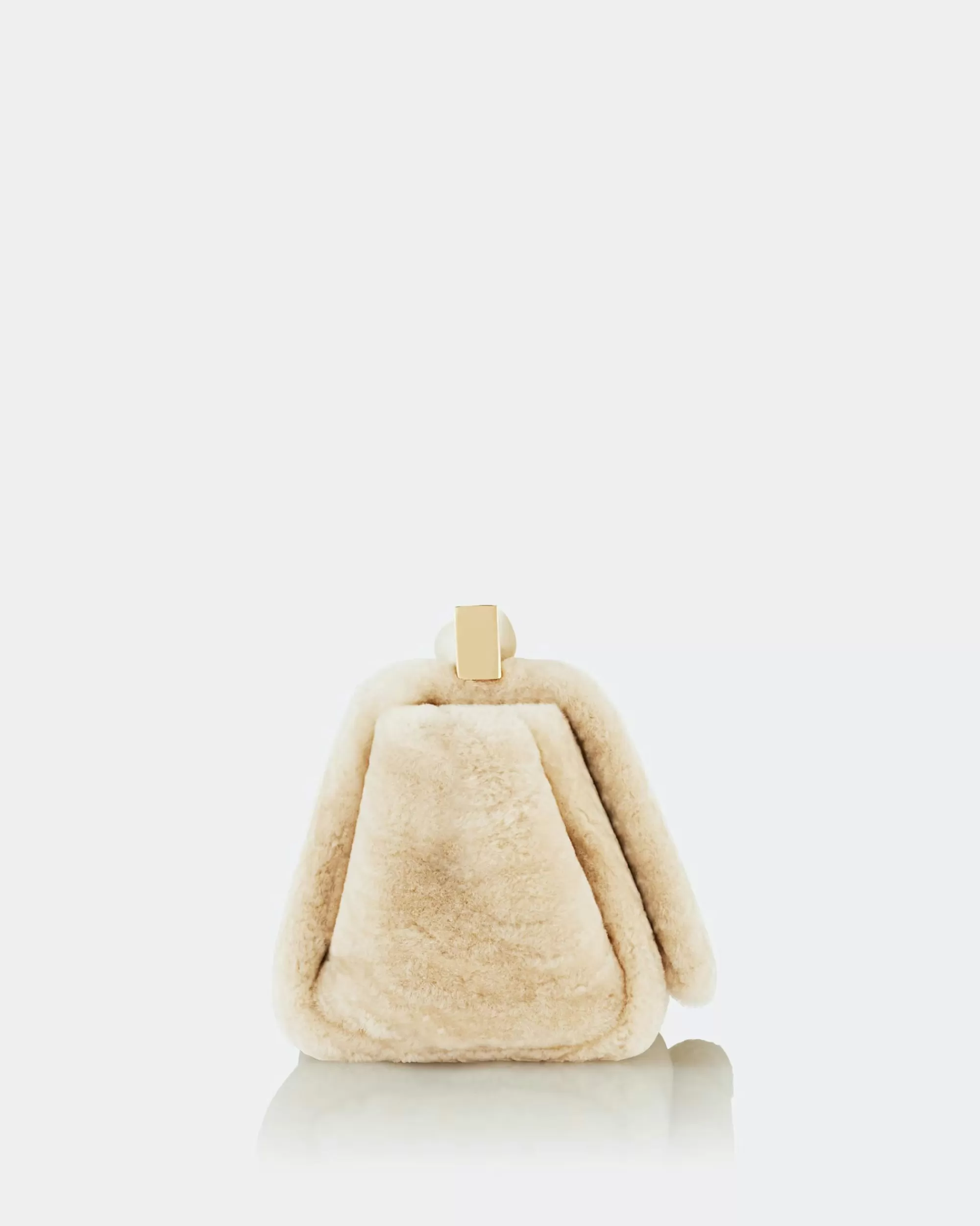Our signature Twist Clutch downsized to mini proportions. Made from plush shearling and tan leather, this playful iteration is topped with a sculptural metal clasp in a light gold-tone shade. An unexpected addition to elegant evening ensembles.