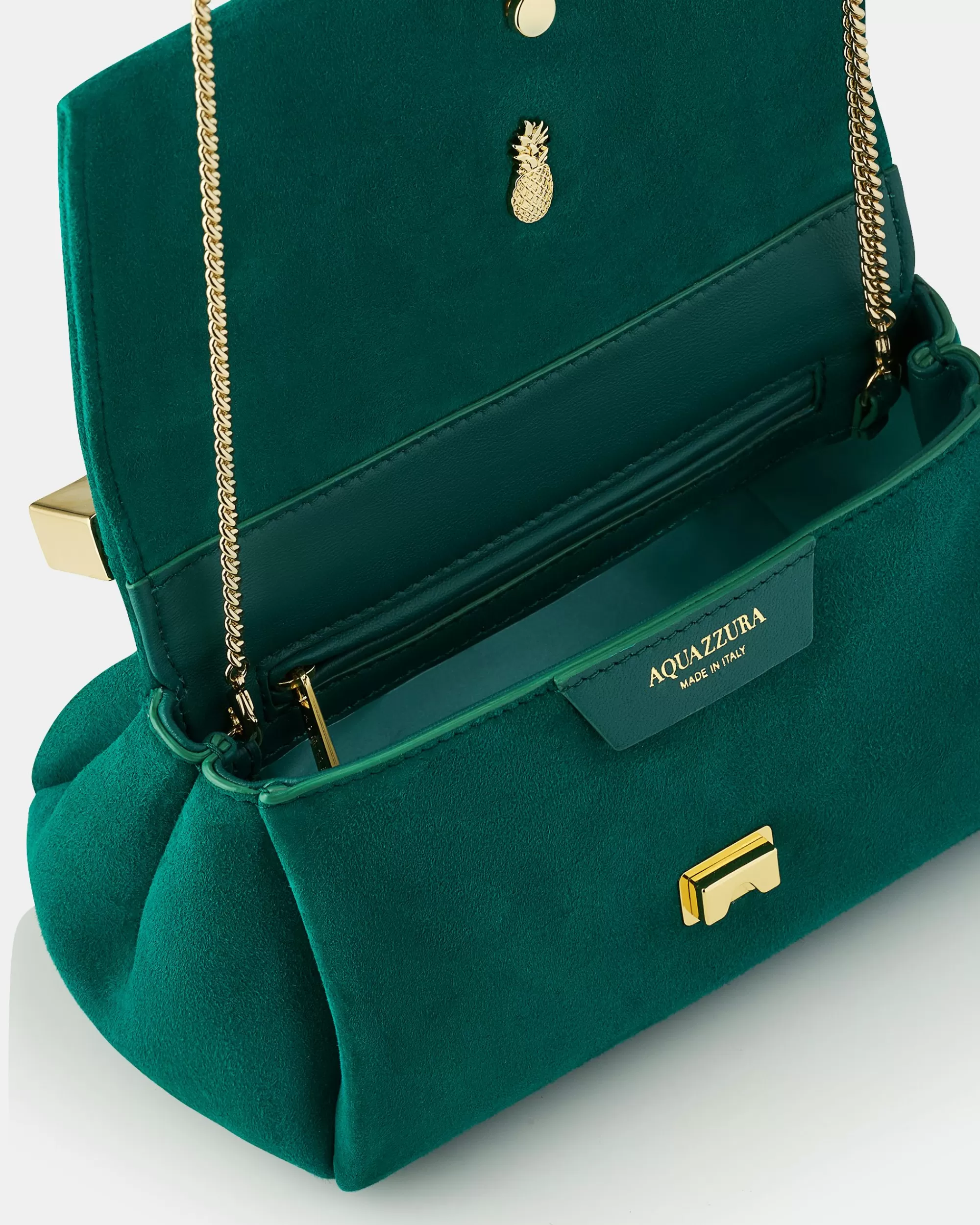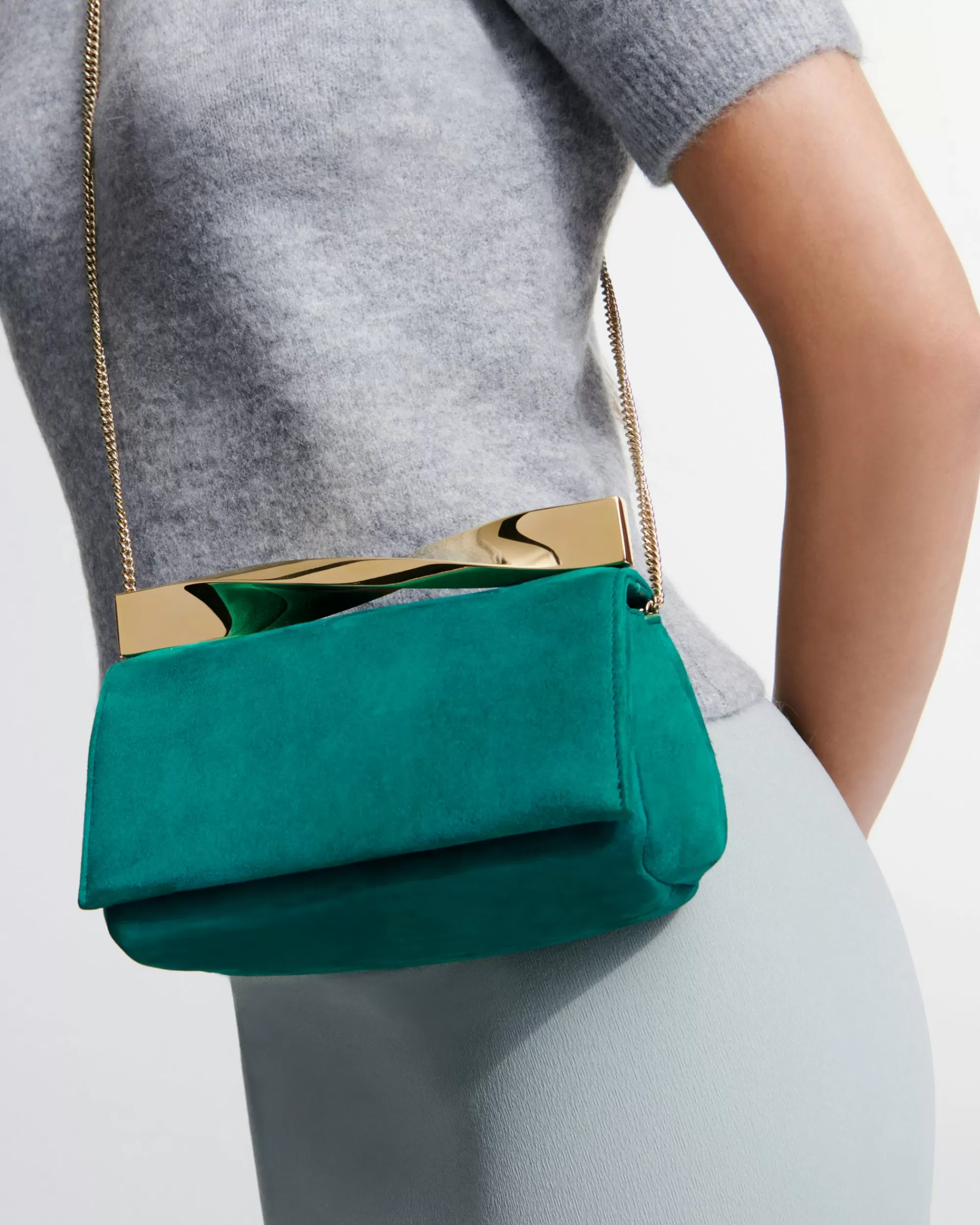 Reimagined in a smaller size for when you just need to carry your essentials, this Mini Twist Clutch is a downsized version of our signature bag. Its crafted from supple suede in a fresh Alpine green hue and topped with a sculptural metal clasp in a light-gold-tone shade. Both the texture and colorway are ideal to pair with sleek Fall Winter outfits.