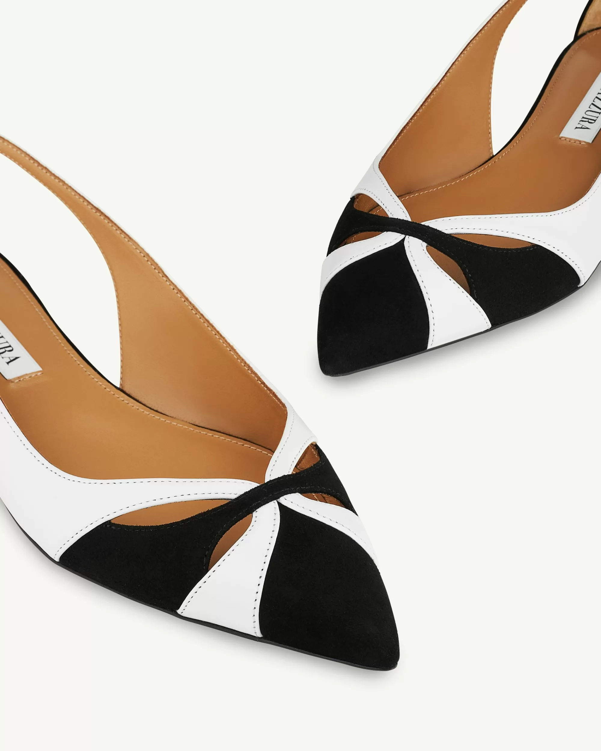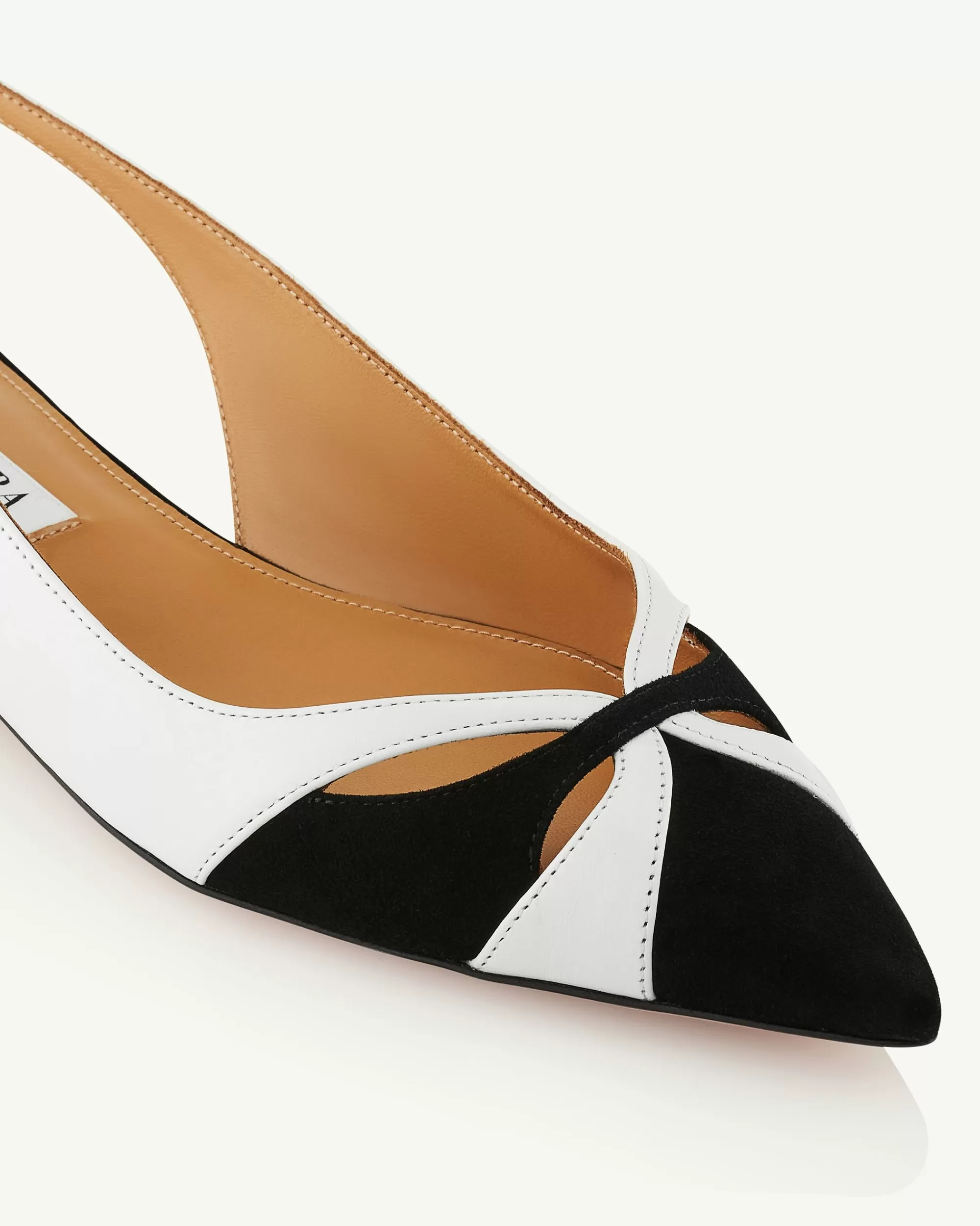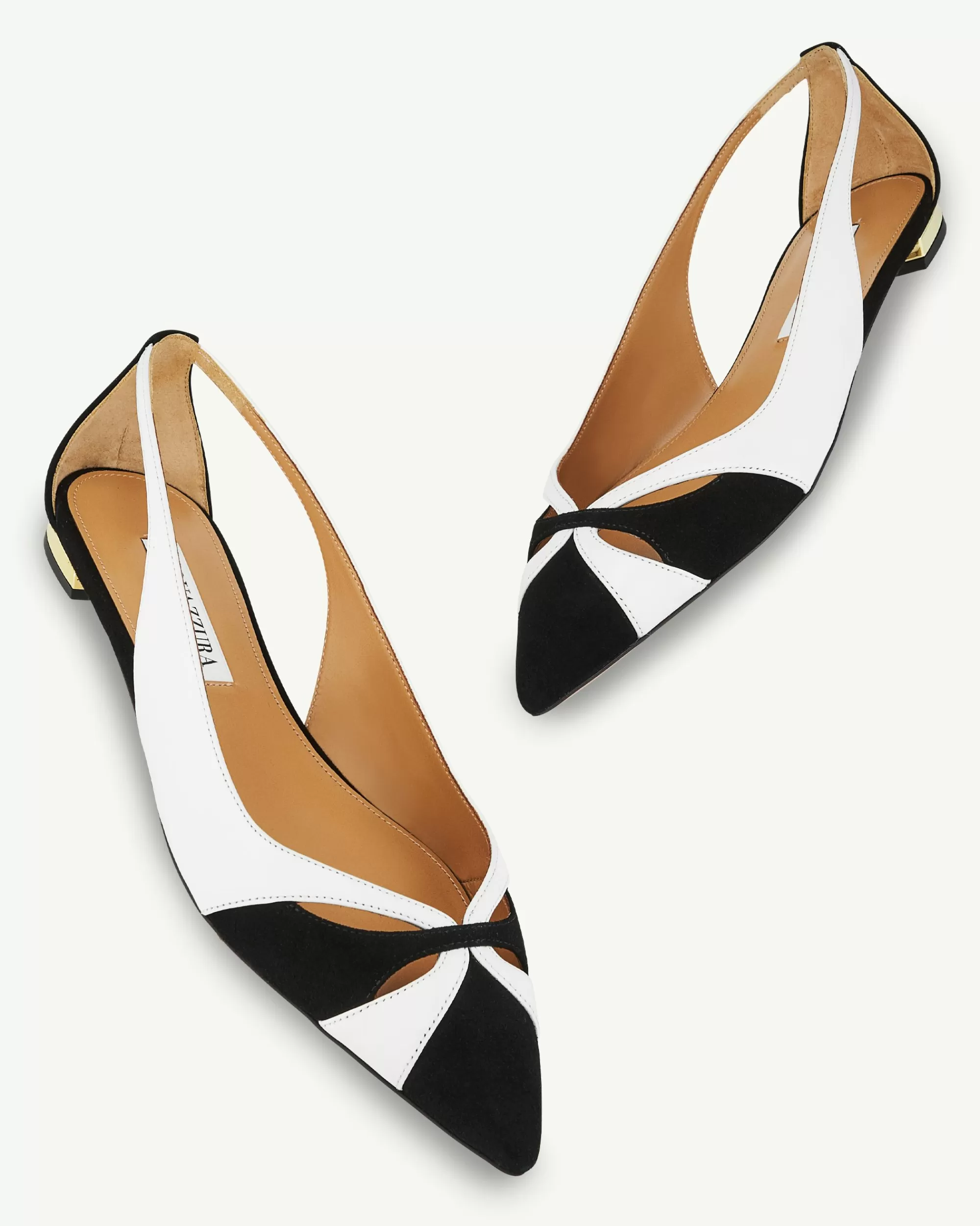Irreverent aesthetic and meticulous craftsmanship meet in these Moves Ballet flats. Made in Italy from panels of shiny calf leather and plush suede, this black and white pair features sleek pointed toes that elongate your legs and slight 10 mm metallic heels.