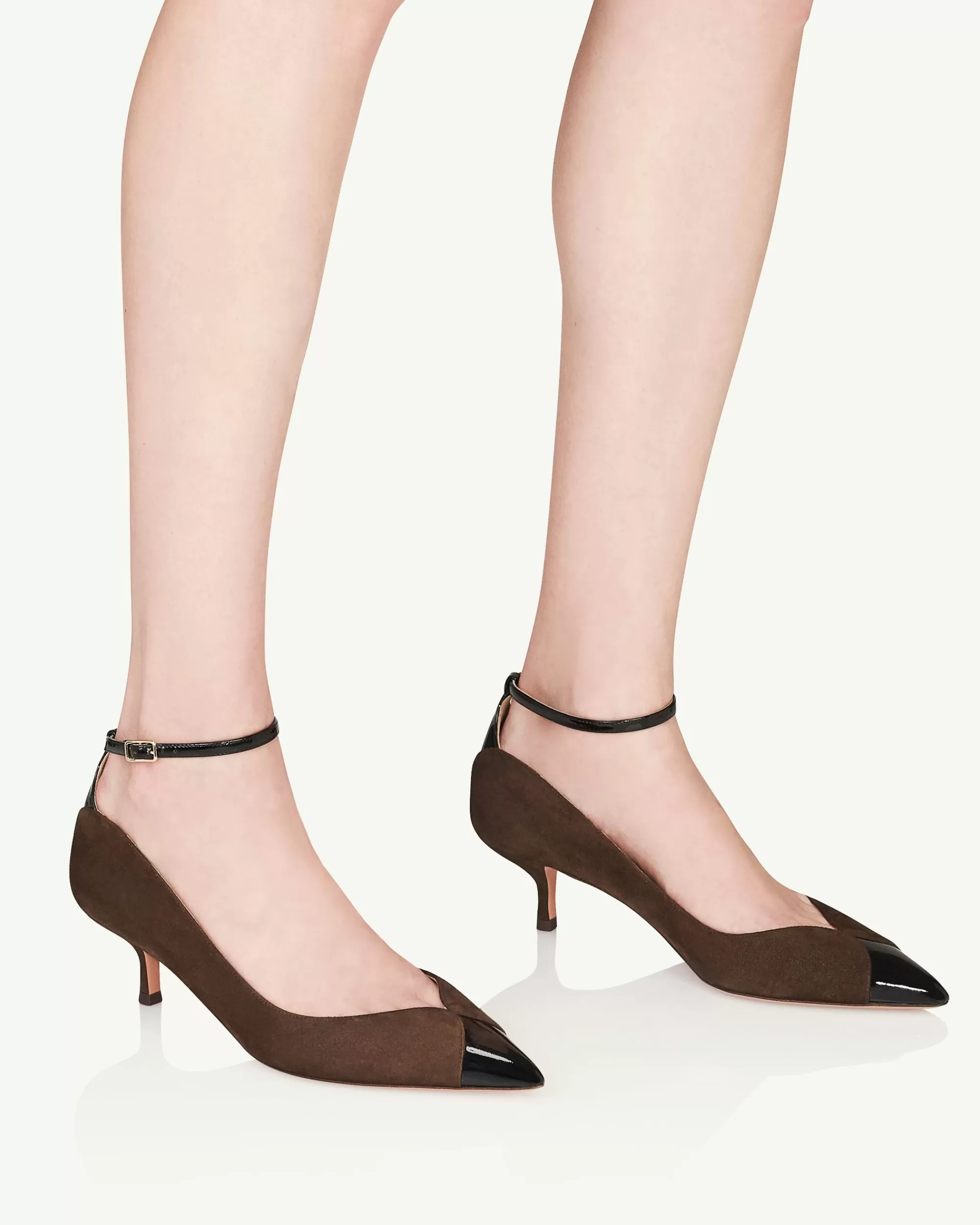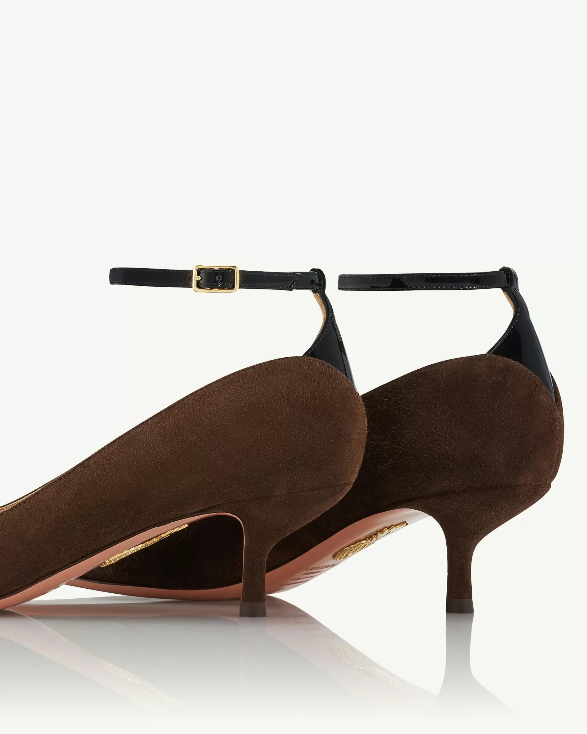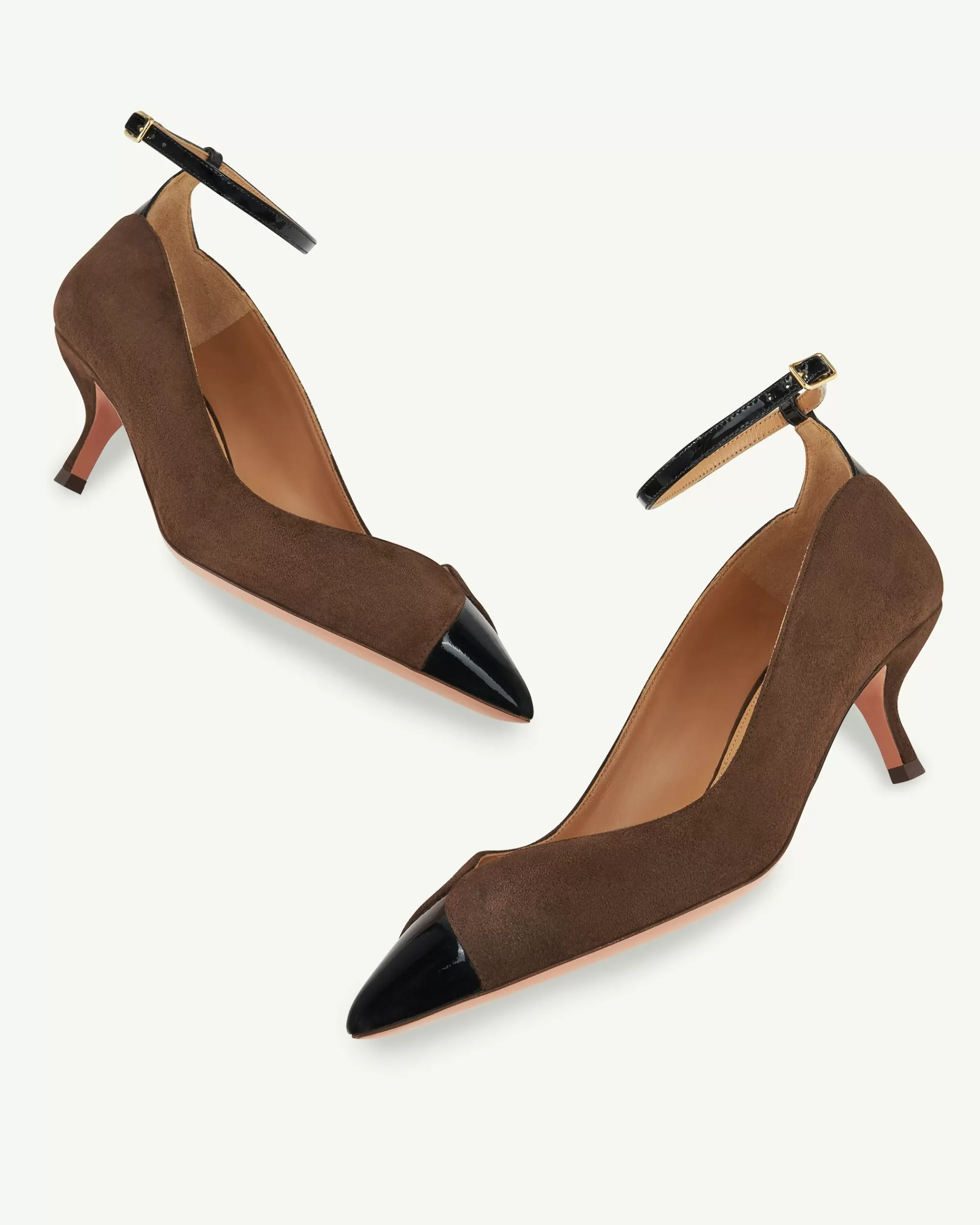Our Pinot Pumps give the timeless silhouette a new lease of life – courtesy of the sharp pointed toes, contrasting black toe caps and beautifully sculpted sides. Made in Italy from velvety suede in a rich ‘Espresso’ hue, they’re finished with 50 mm kitten heels and delicate ankle straps that keep them securely in place.