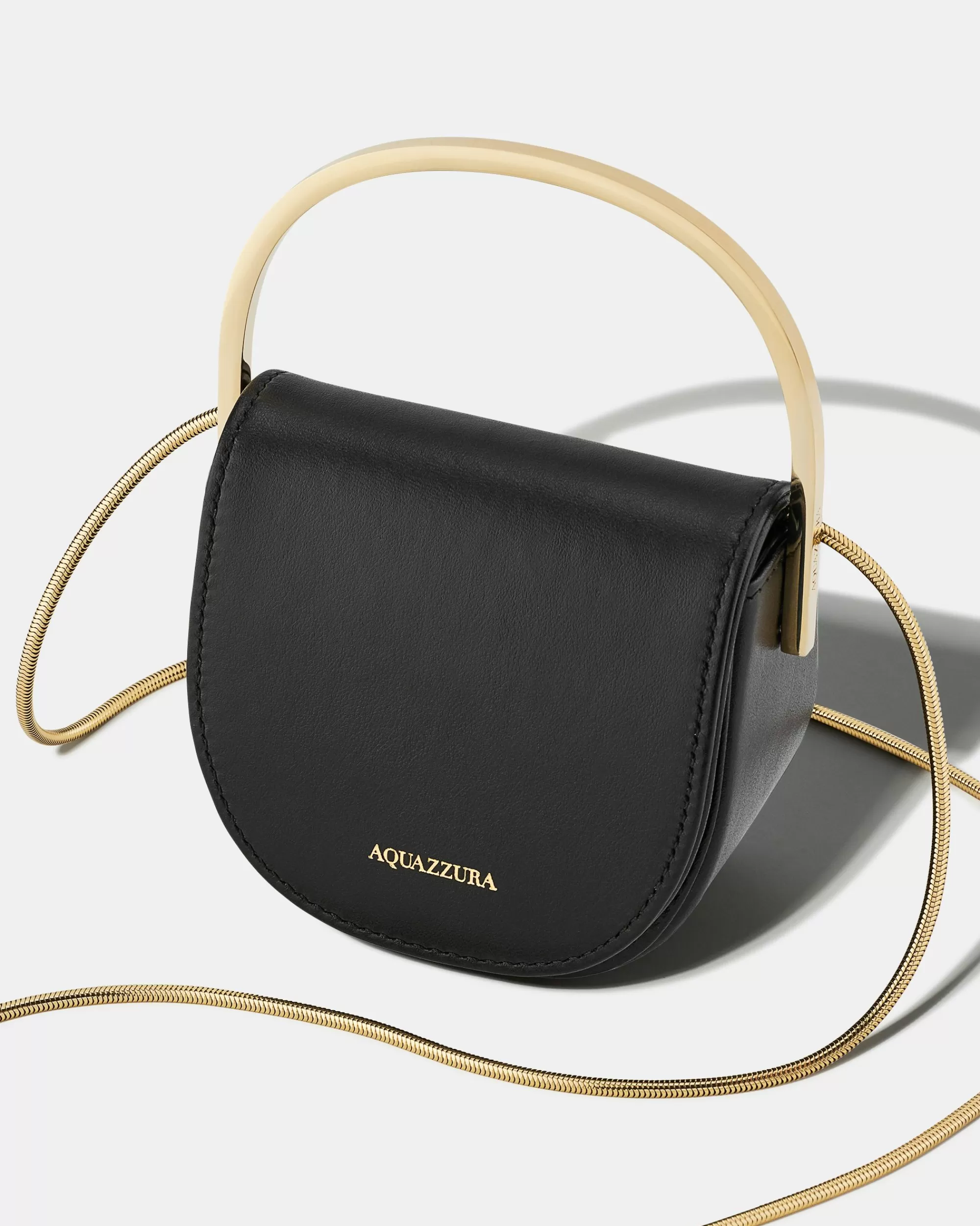 A mini-sized rendition of the Purist hobo, Aquazzura’s Purist Micro Bag is defined by the sculptural metal handle in light gold-tone metal. The smooth, curved silhouette is crafted in Italy from black calf leather, making for a versatile yet impactful accessory that will compliment any look.