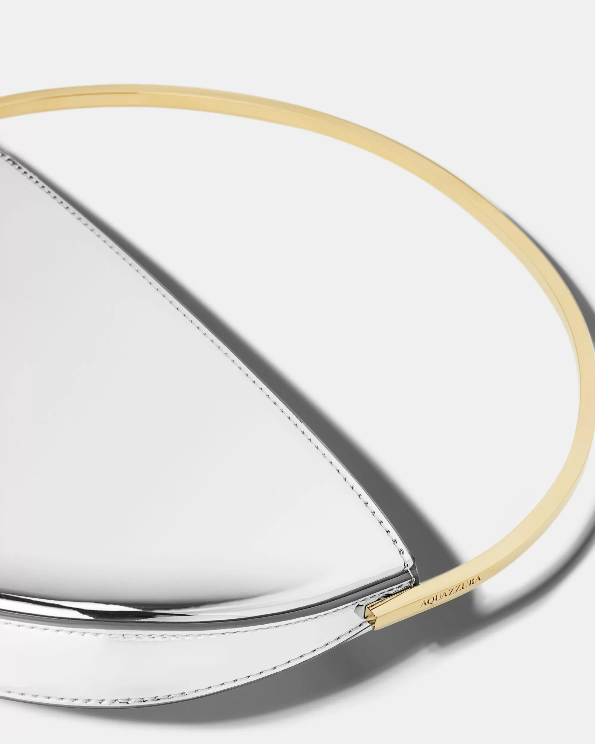 The Purist Mini Pouch bridges the gap between form and function. Crafted in Italy, this high-shine compact handbag in silver features a geometric half-moon shape mirrored by the curved handle in light gold-tone metal that can be folded under the bag to carry it as a clutch. The sculptural silhouette is complimented by a mirror-effect finish.