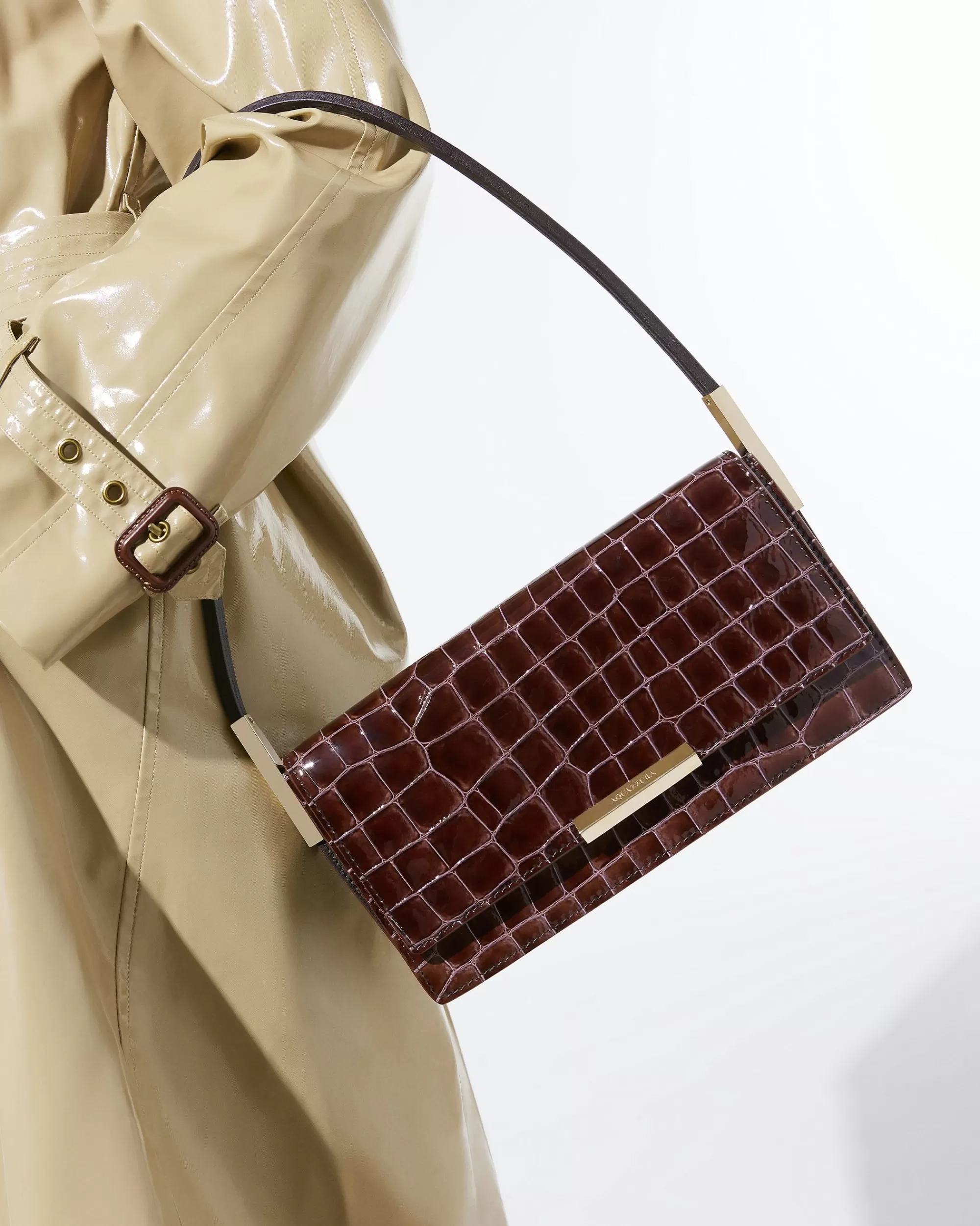 With a clean, minimal design that’s exquisitely crafted in Italy, the Purist Shoulder Bag is a contemporary addition to any wardrobe. Designed to sit under the arm, this rectangular design is made from crocodile-effect nappa leather in a rich ‘Espresso’ brown hue, and accented with light gold-tone hardware.
