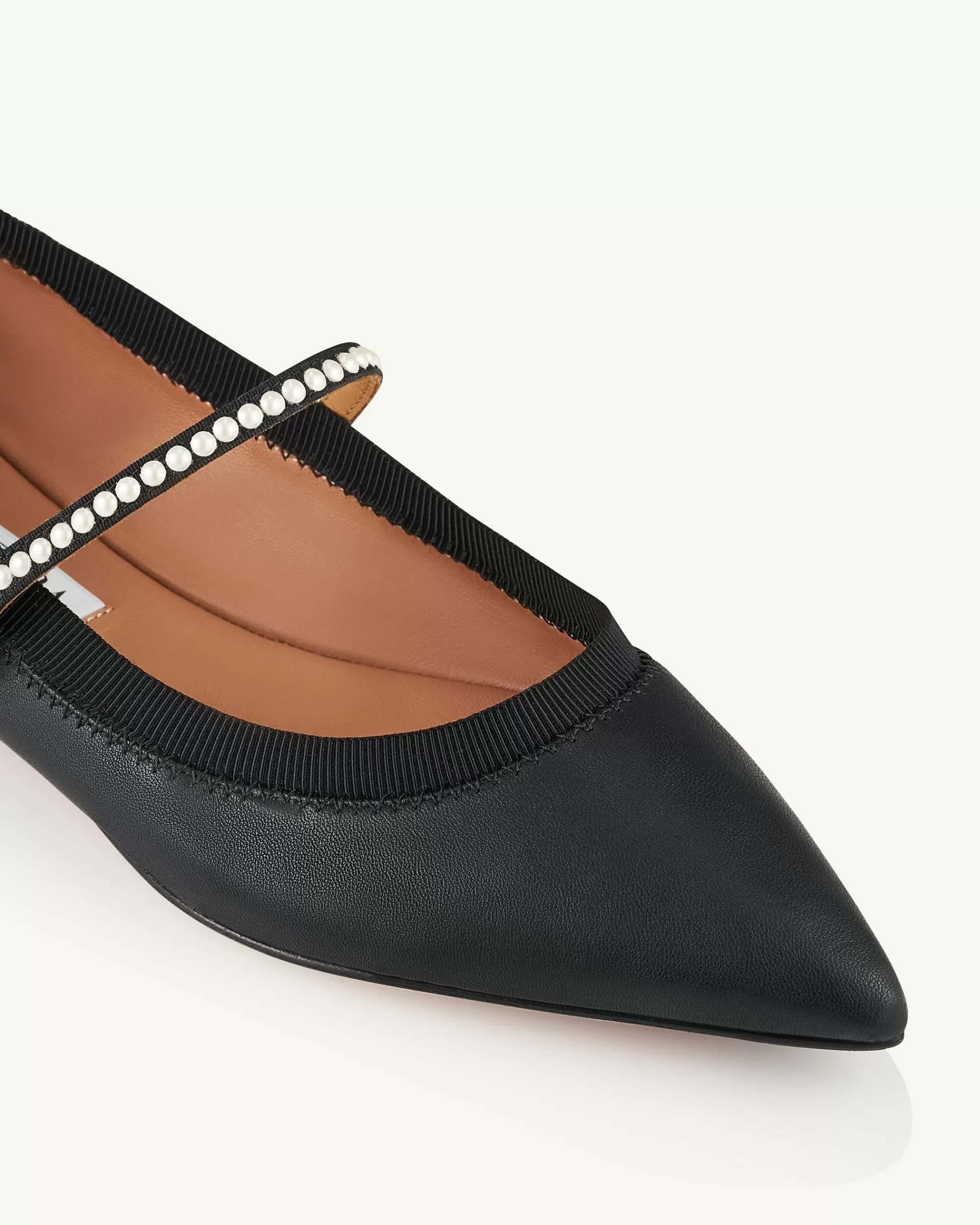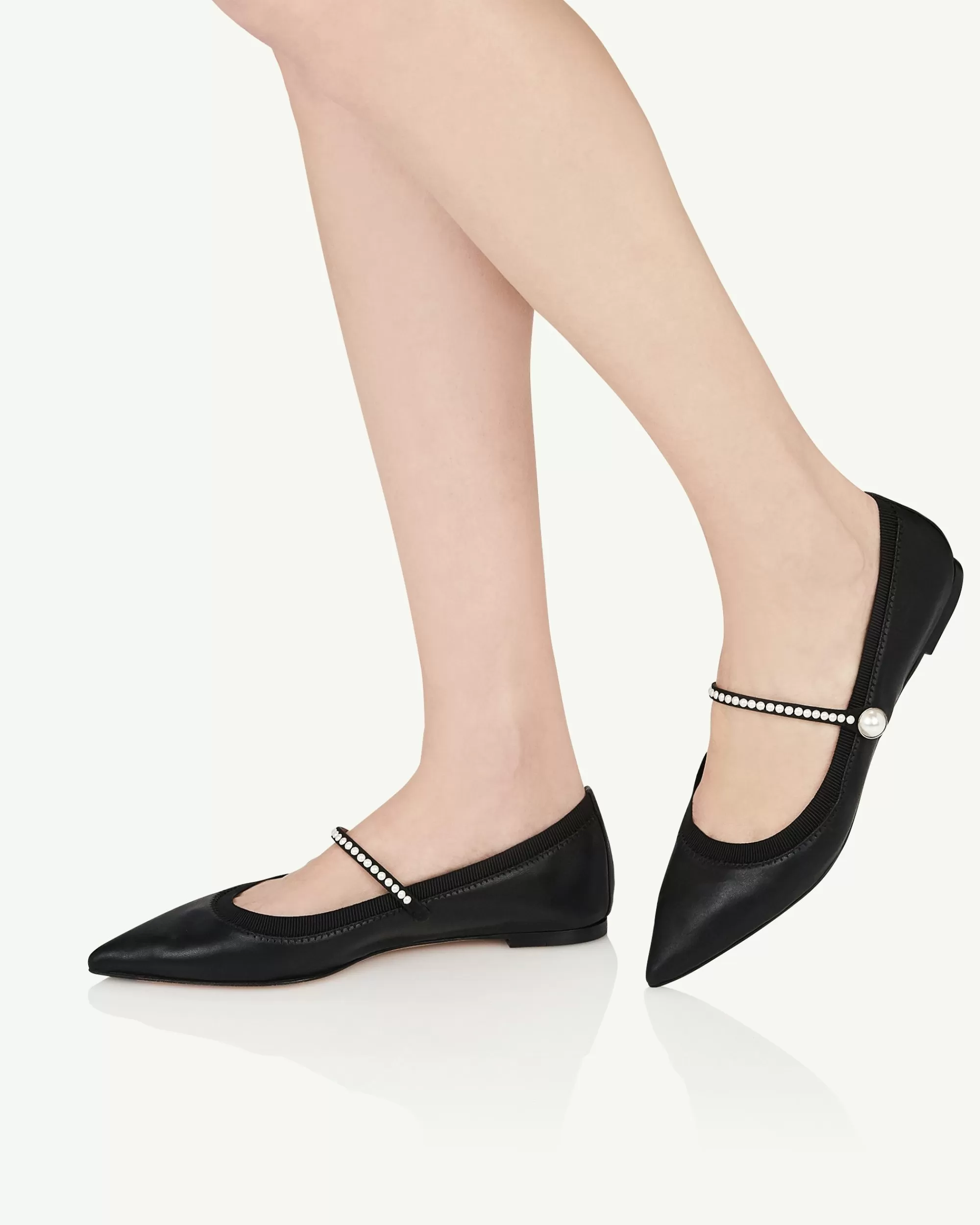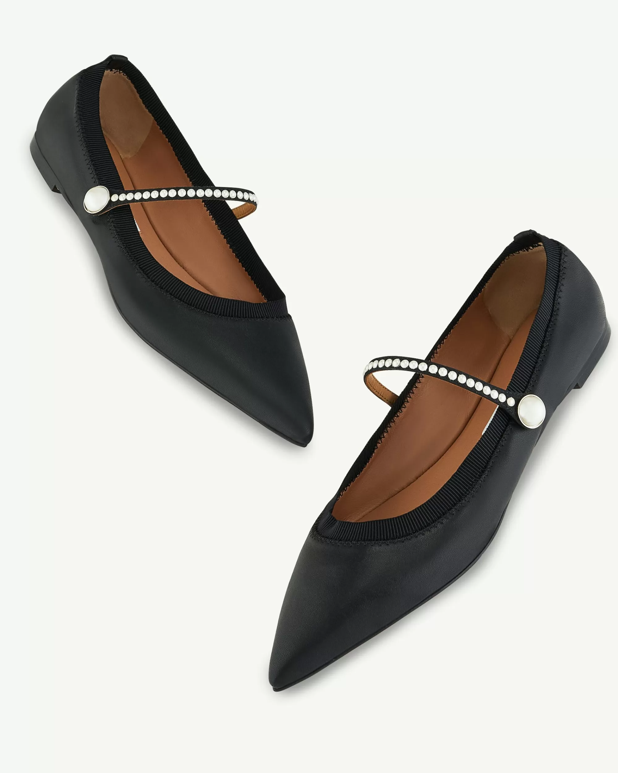 Mary Janes may be having a moment, but invest in these timelessly chic Romy Pearl Flats, and youll cherish them for years. Crafted from black leather and trimmed with grosgrain for comfort, they have elegant pointed toes and delicate pearl embellishments that trace the thin straps – subtle yet statement-making.