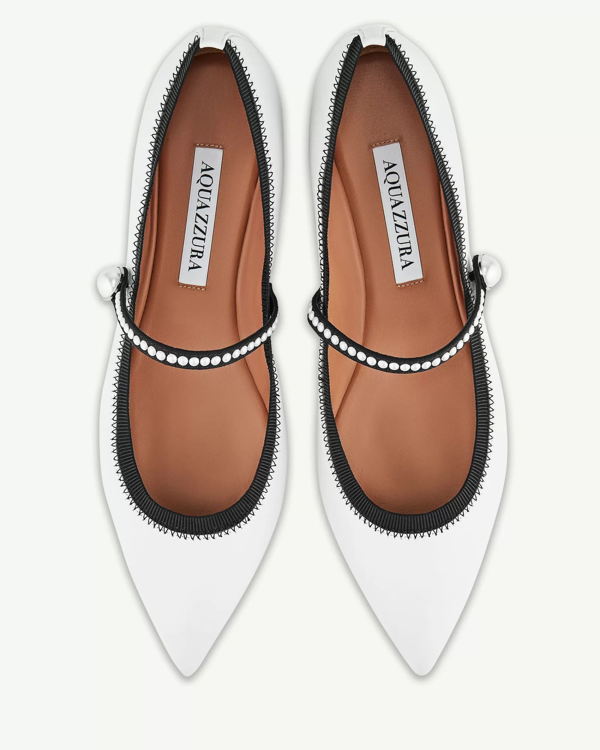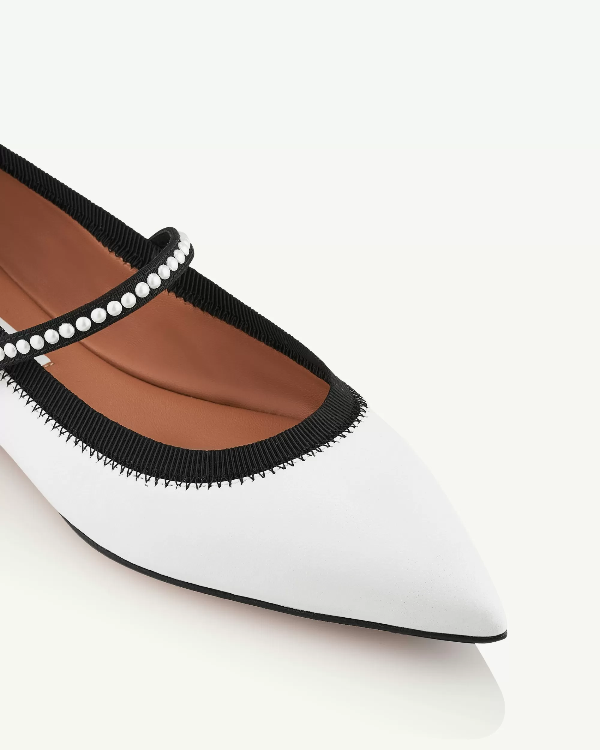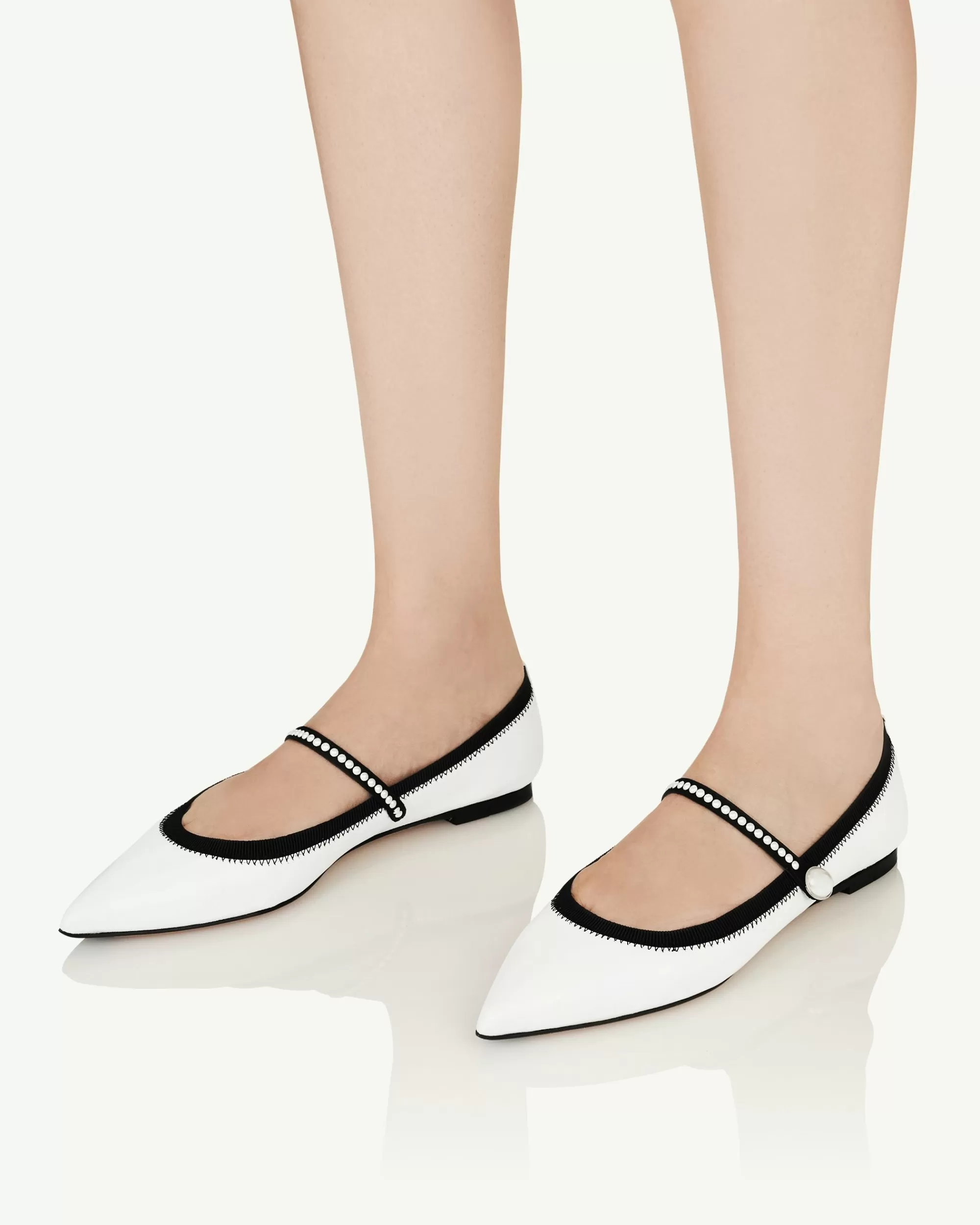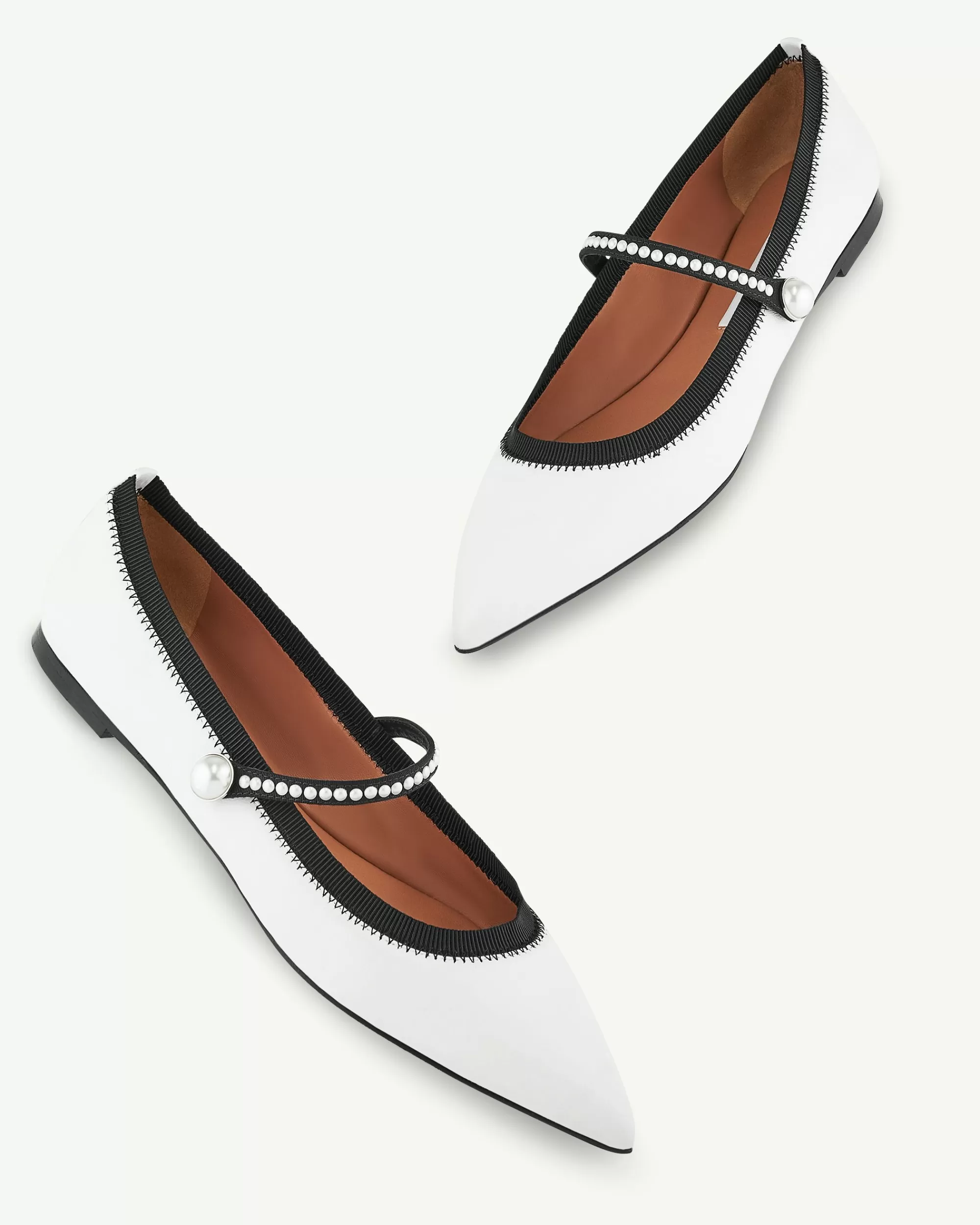 Mary Janes may be having a moment, but invest in these timelessly chic Romy Pearl Flats, and youll cherish them for years. Crafted from white leather and trimmed with grosgrain for comfort, they have elegant pointed toes and delicate pearl embellishments that trace the thin straps – subtle yet statement-making.
