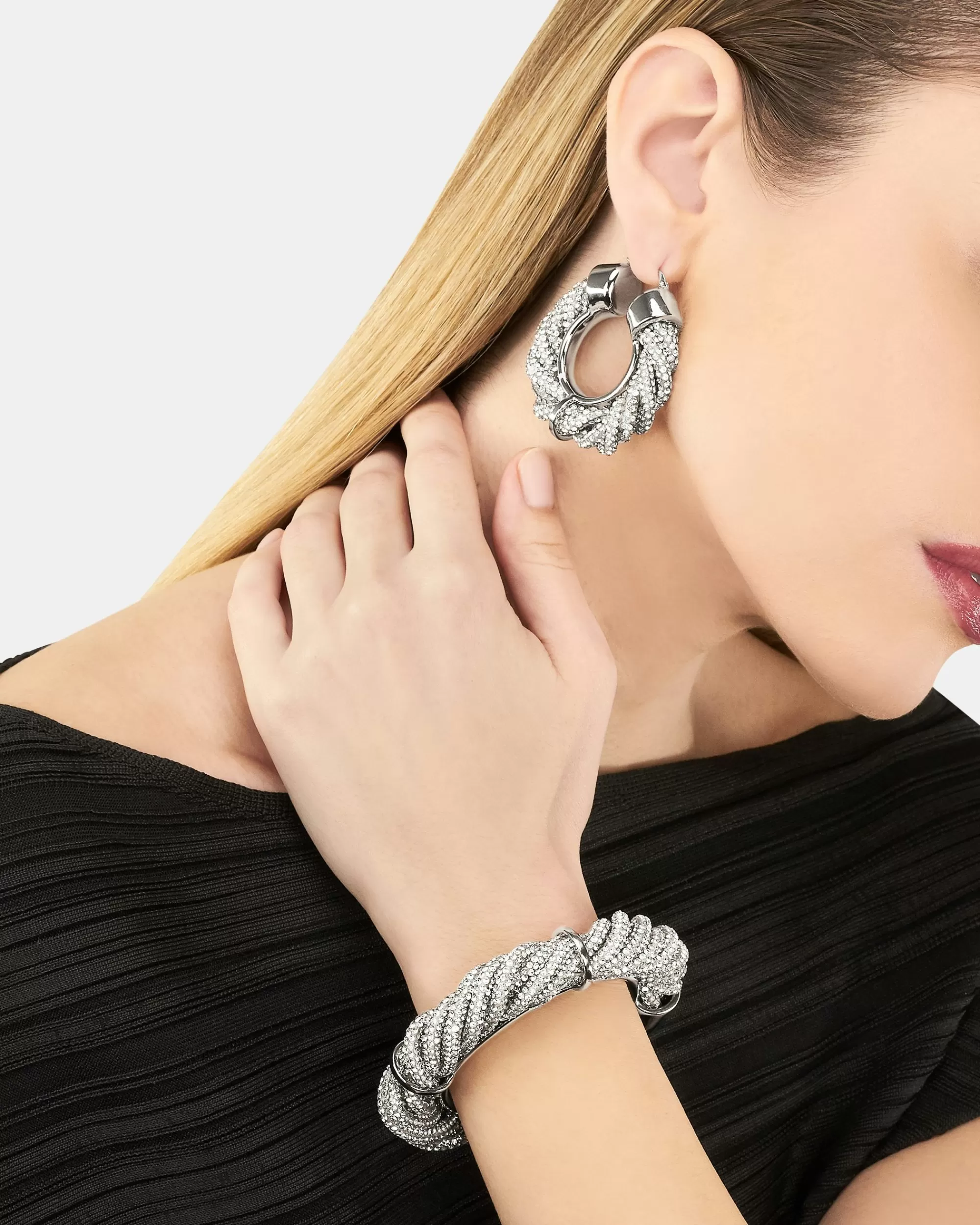 With its braided texture and shimmering embellishments, the Scintilla Crystal Bangle is perfect for parties. Its made in Italy from a mix of palladium-tone brass and resin with a comfortable, lightweight feel. Style yours with the matching hoops for a chic statement.