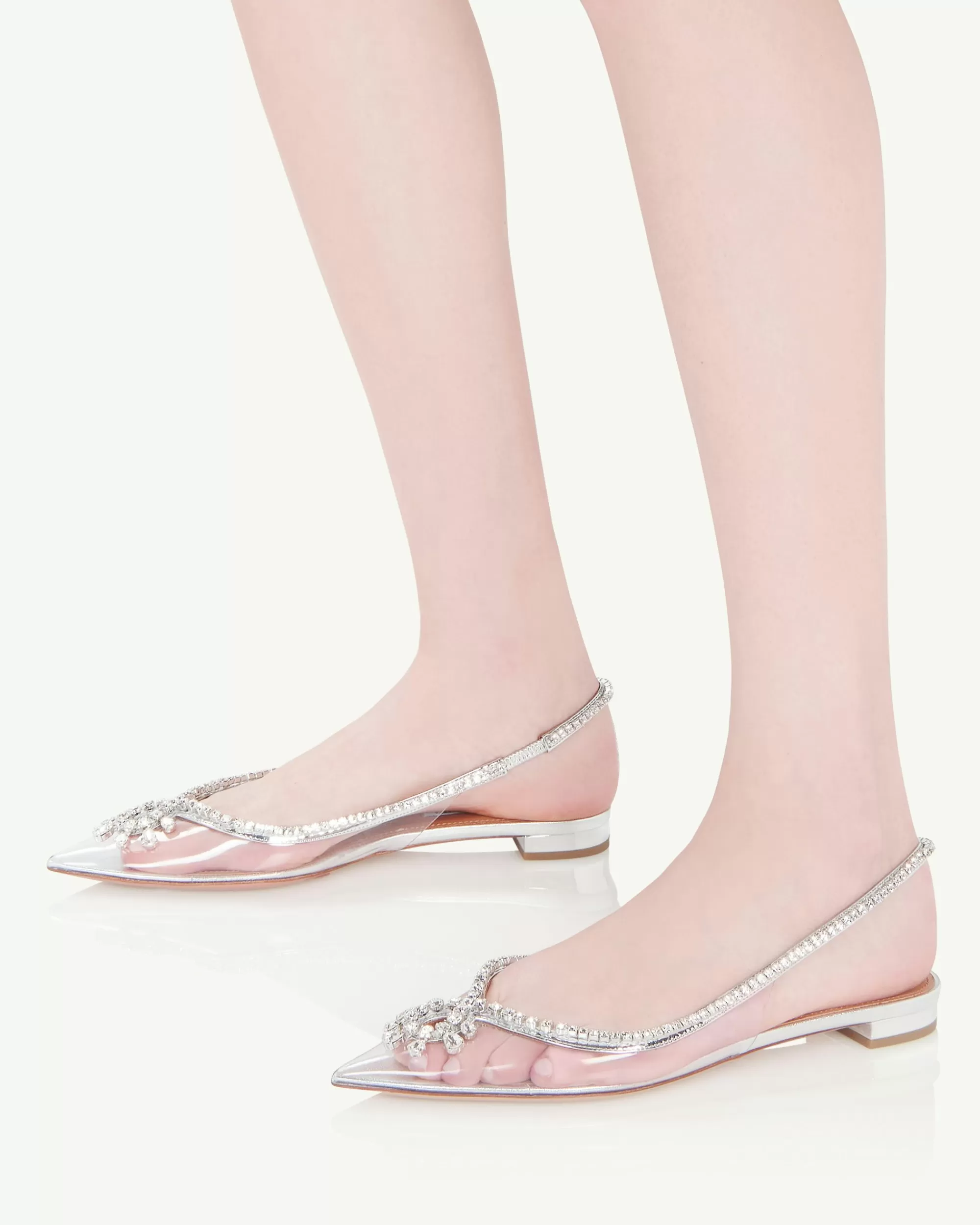 Add feminine flair to your day or evening edits. Our Seduction Crystal Sling Flat is Italian-crafted from polished specc…