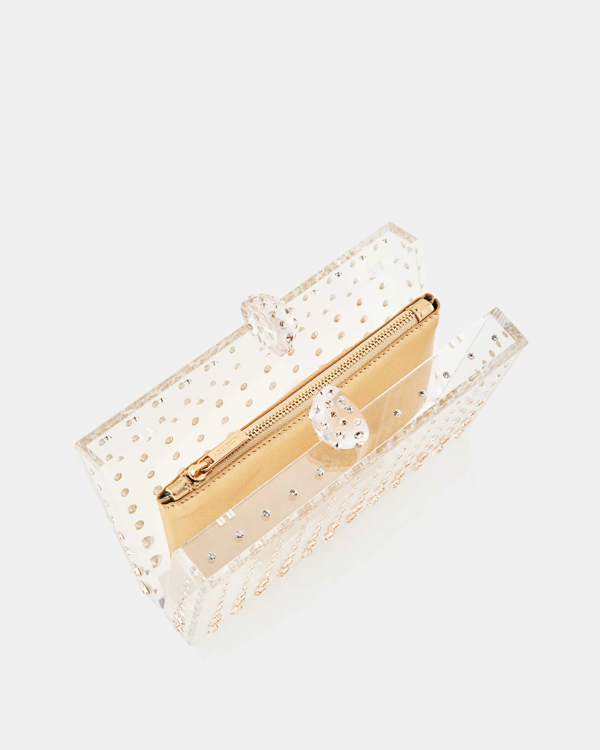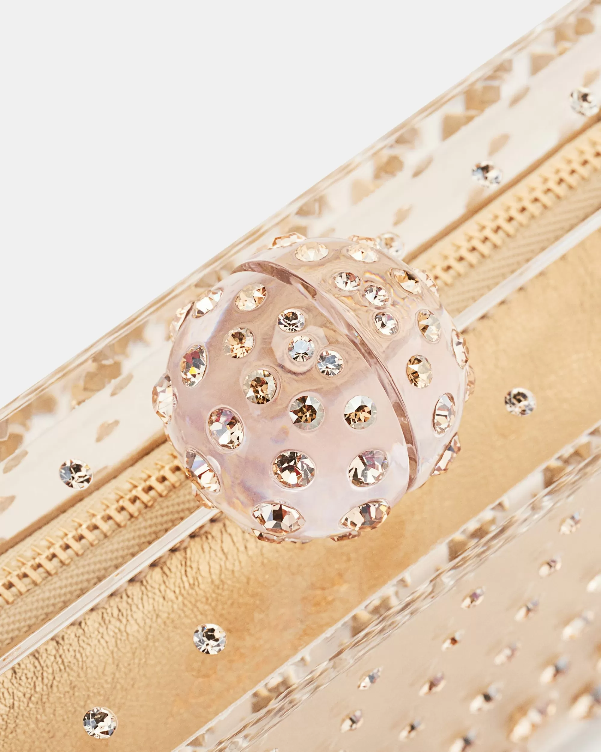 Our Tequila Clutch is a must-have, after-dark accessory. Italian-crafted in shades of transparent gold, the style is embellished with glistening gems and finished with a dazzling clasp fastener. The vibrant design will hold your favorite lipstick and small essentials.