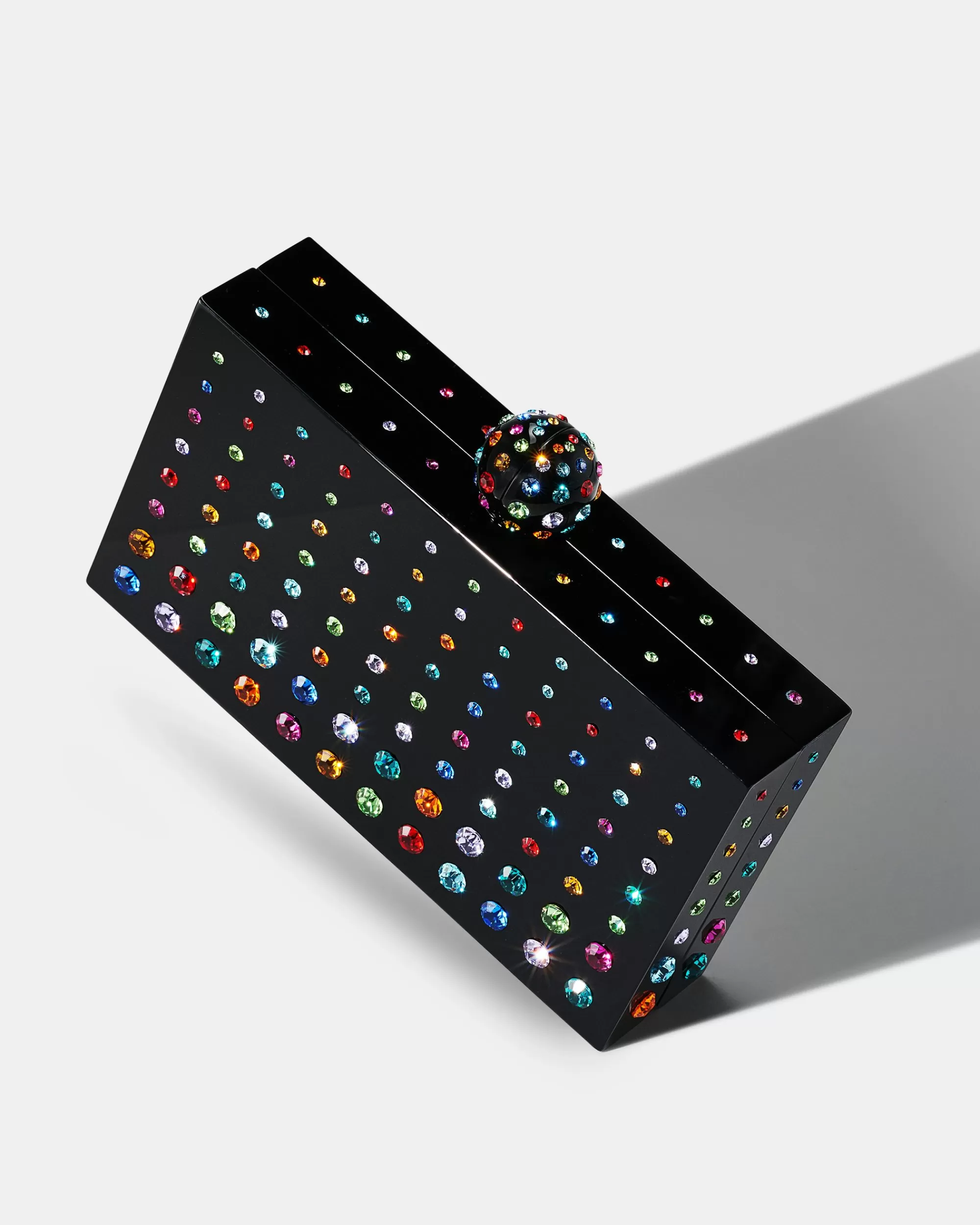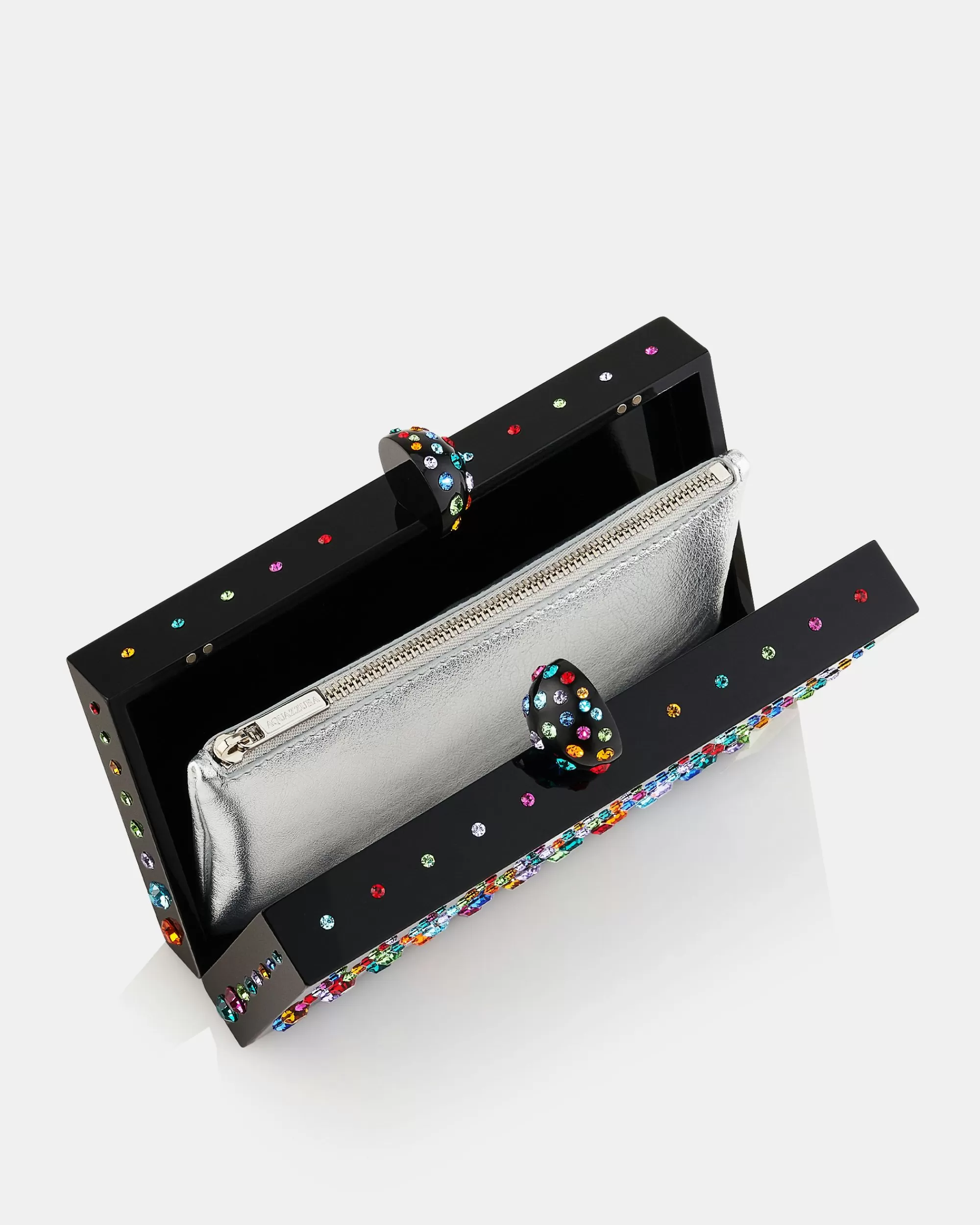 Our Tequila Clutch is the quintessential after-dark accessory. The stunning black version presented here is crafted in Italy from a mix of leather, resin and silver-toned brass decorated with luminous rainbow-hued crystals. A seamless blend of finesse and fun, it’s perfectly sized to carry your lipstick, phone and small essentials.
