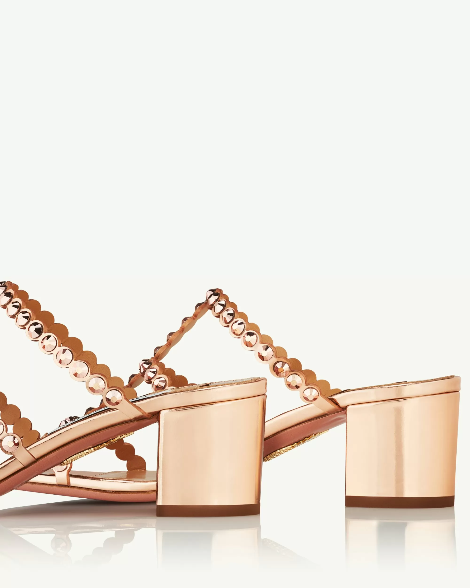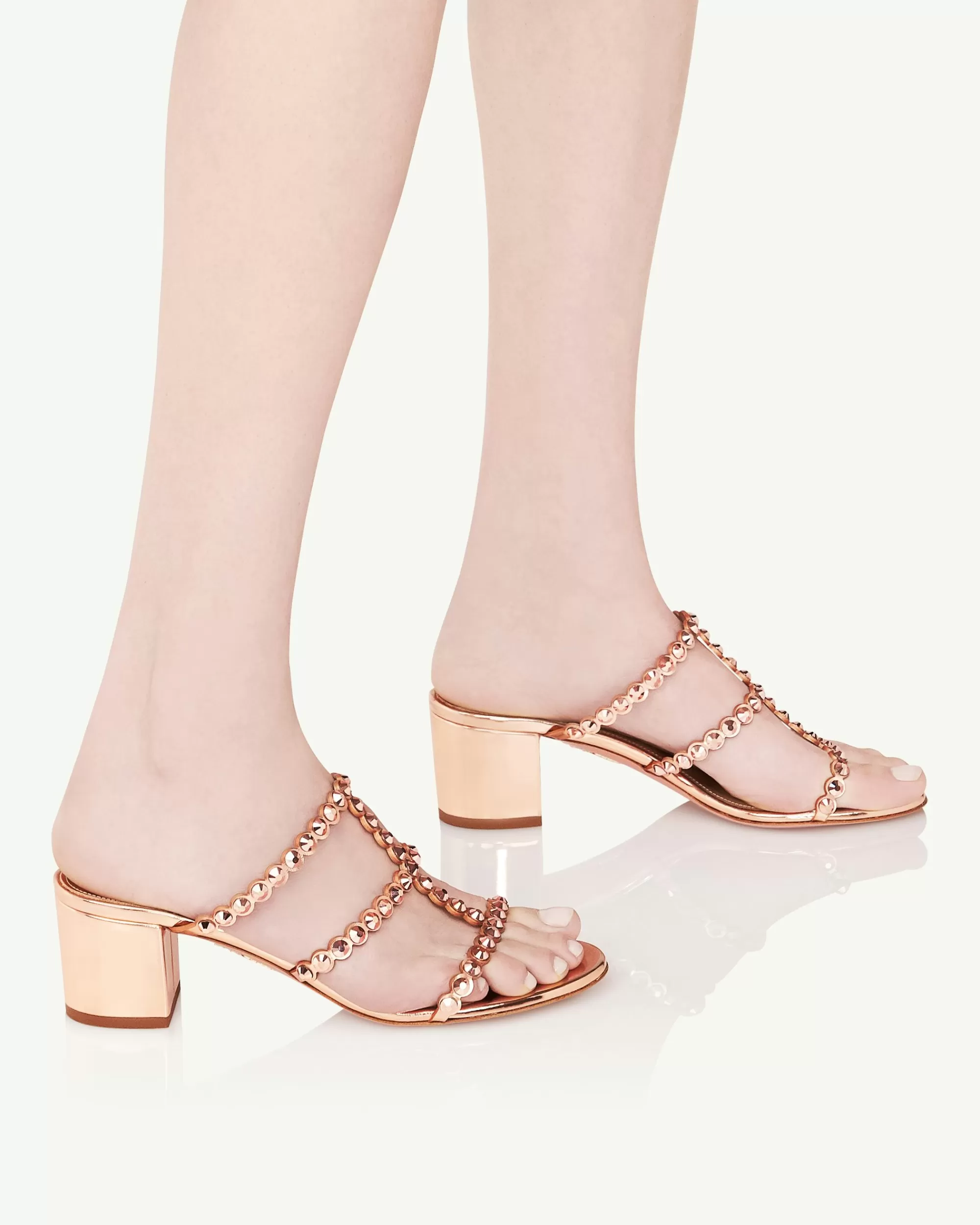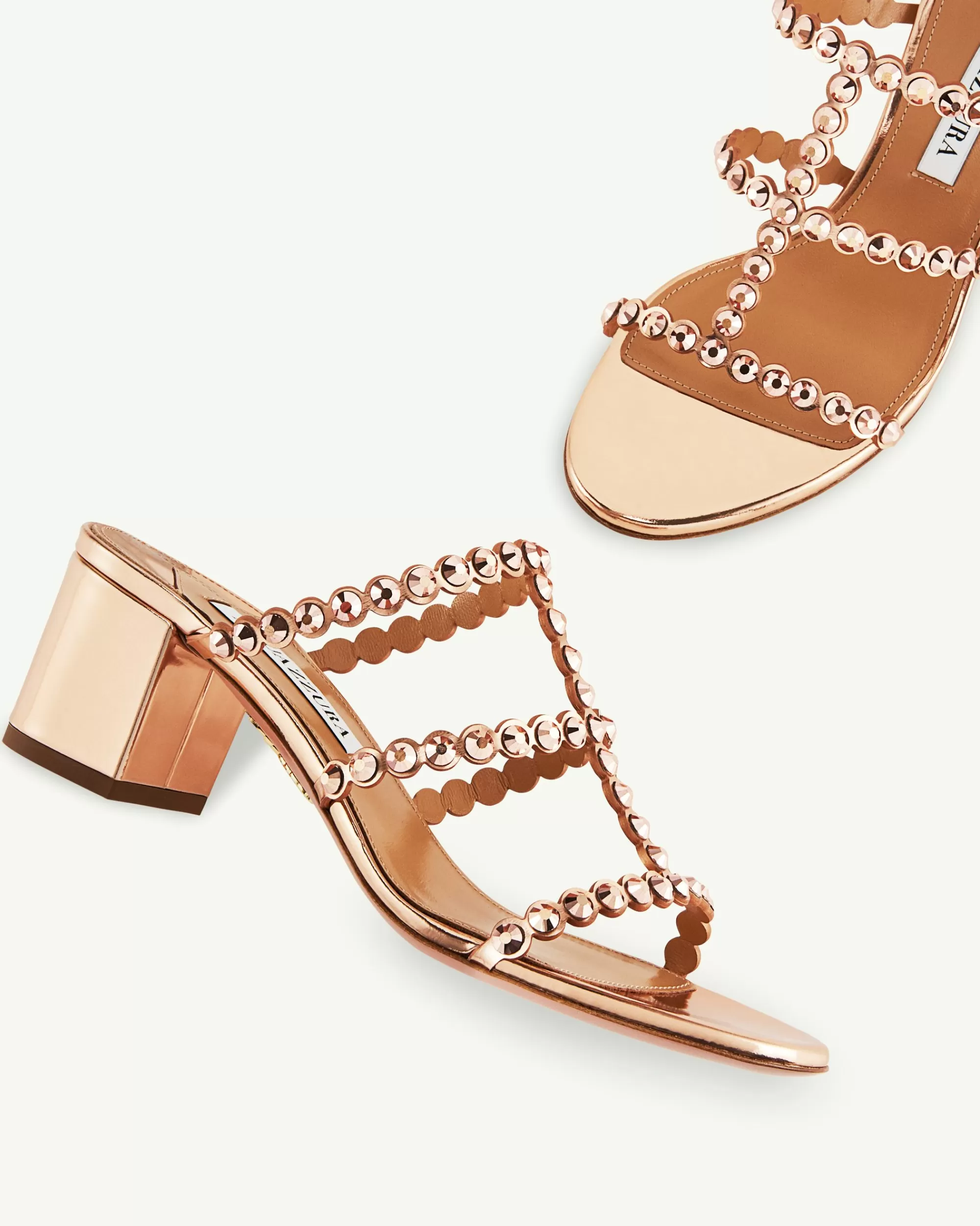 The epitome of contemporary glamour – these Tequila Sandals swap sky-high stilettos for easy-to-wear mid-heels measuring 50 mm. Combining irresistible comfort with decadent allure, they’re crafted from rose-gold leather with a mirror-like sheen, scattered with tonal crystals. Perfect for summer weddings and date nights.