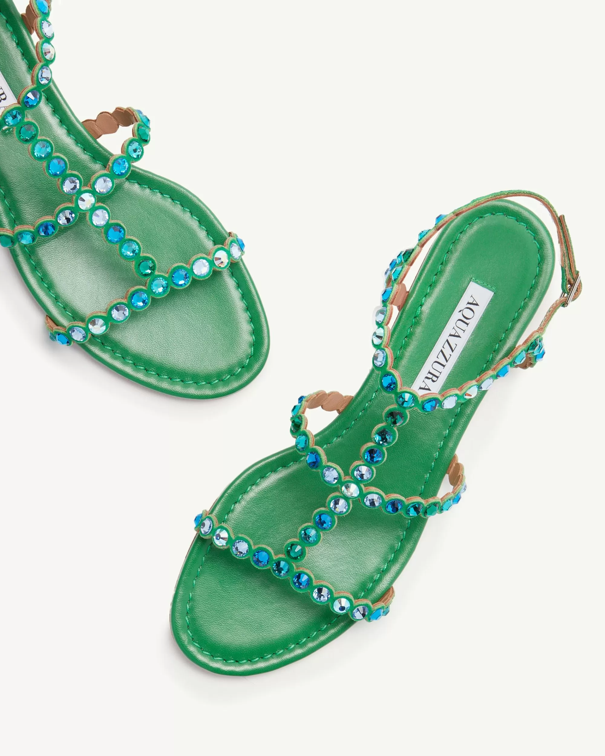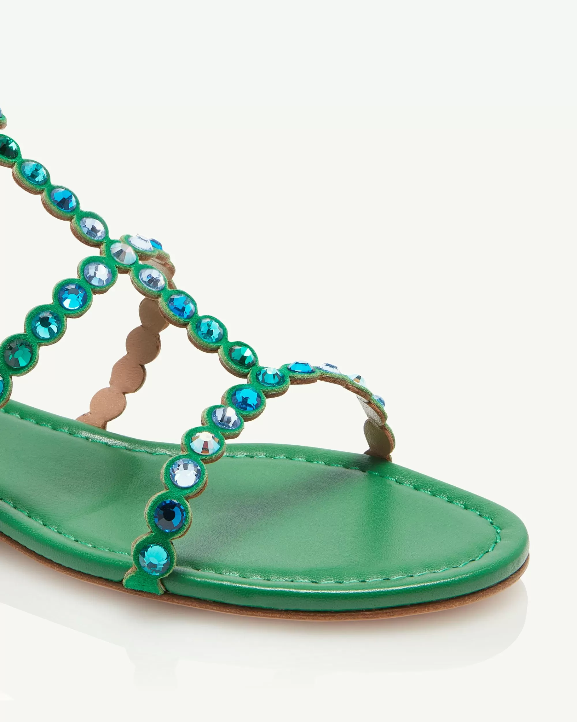 Add an extra dose of sparkle to any ensemble. Our Tequila Flat Sandals are crafted in Italy from buttery suede in vibrant jasmine green and embellished with glittery gems across the straps. Keep the bright shade in focus with ankle-length trousers or a midi skirt.