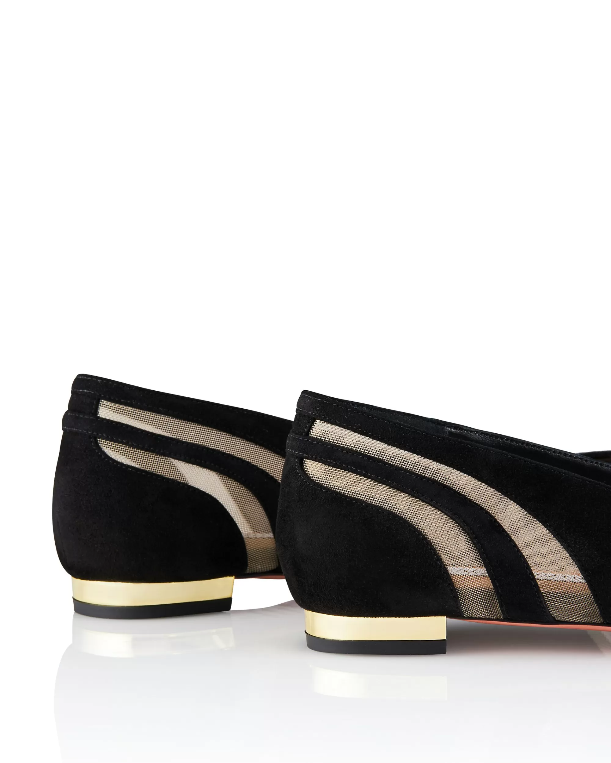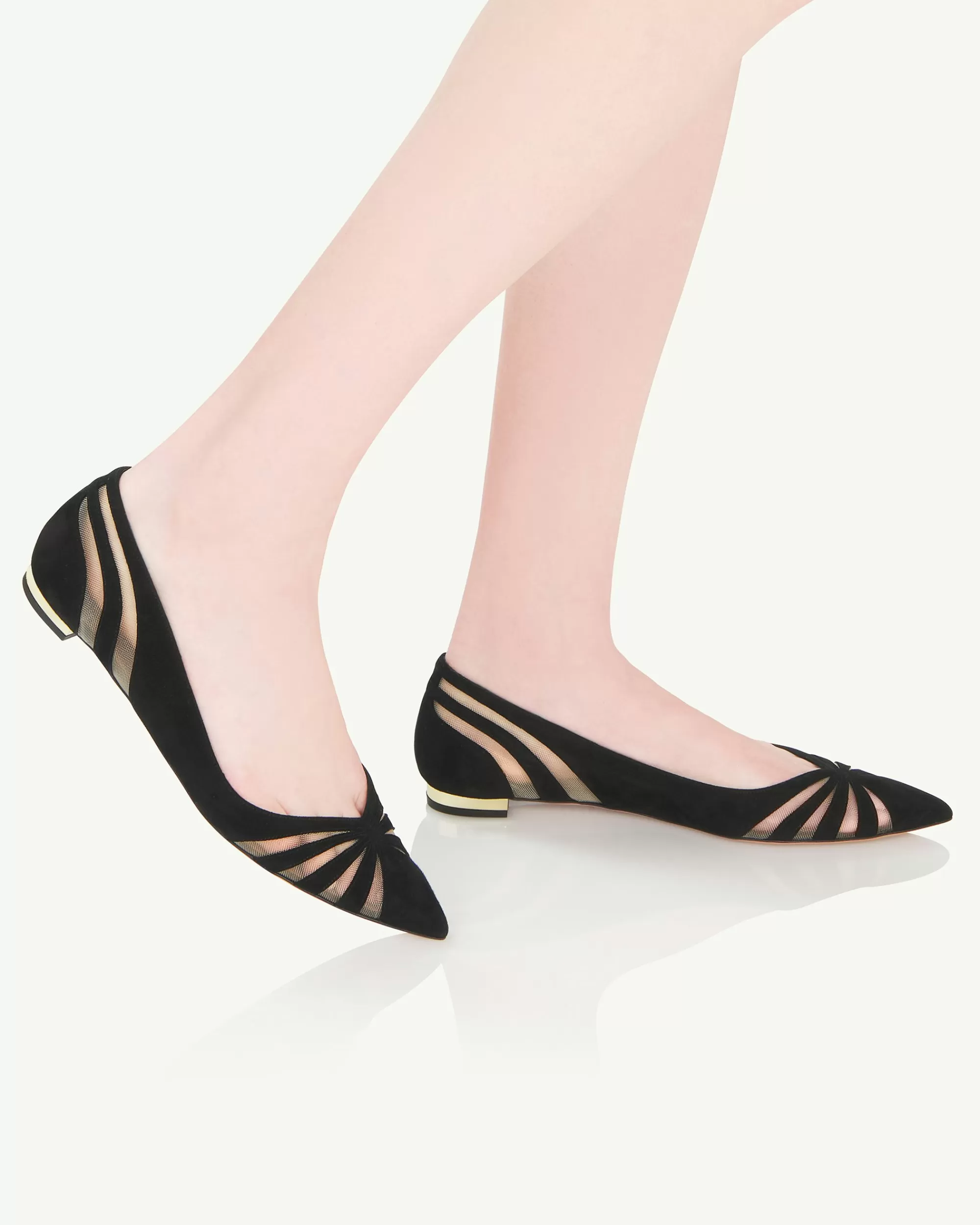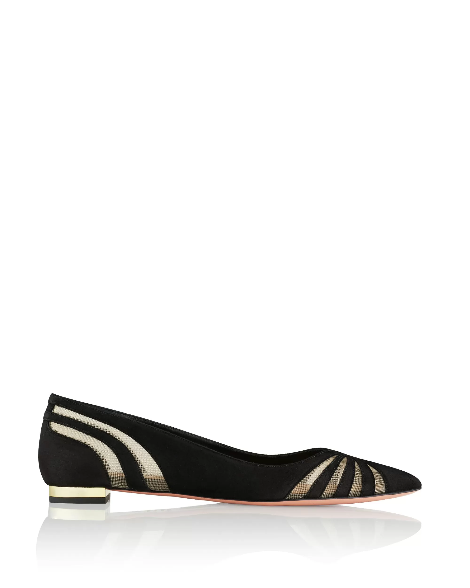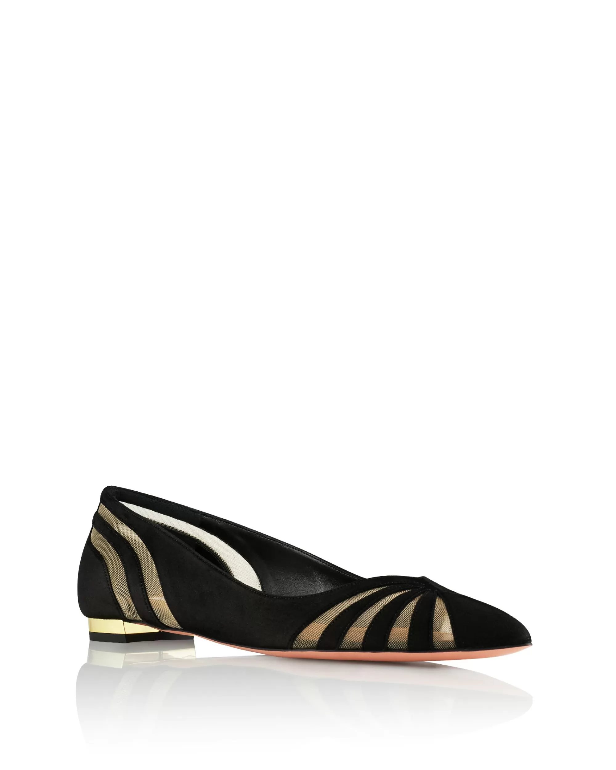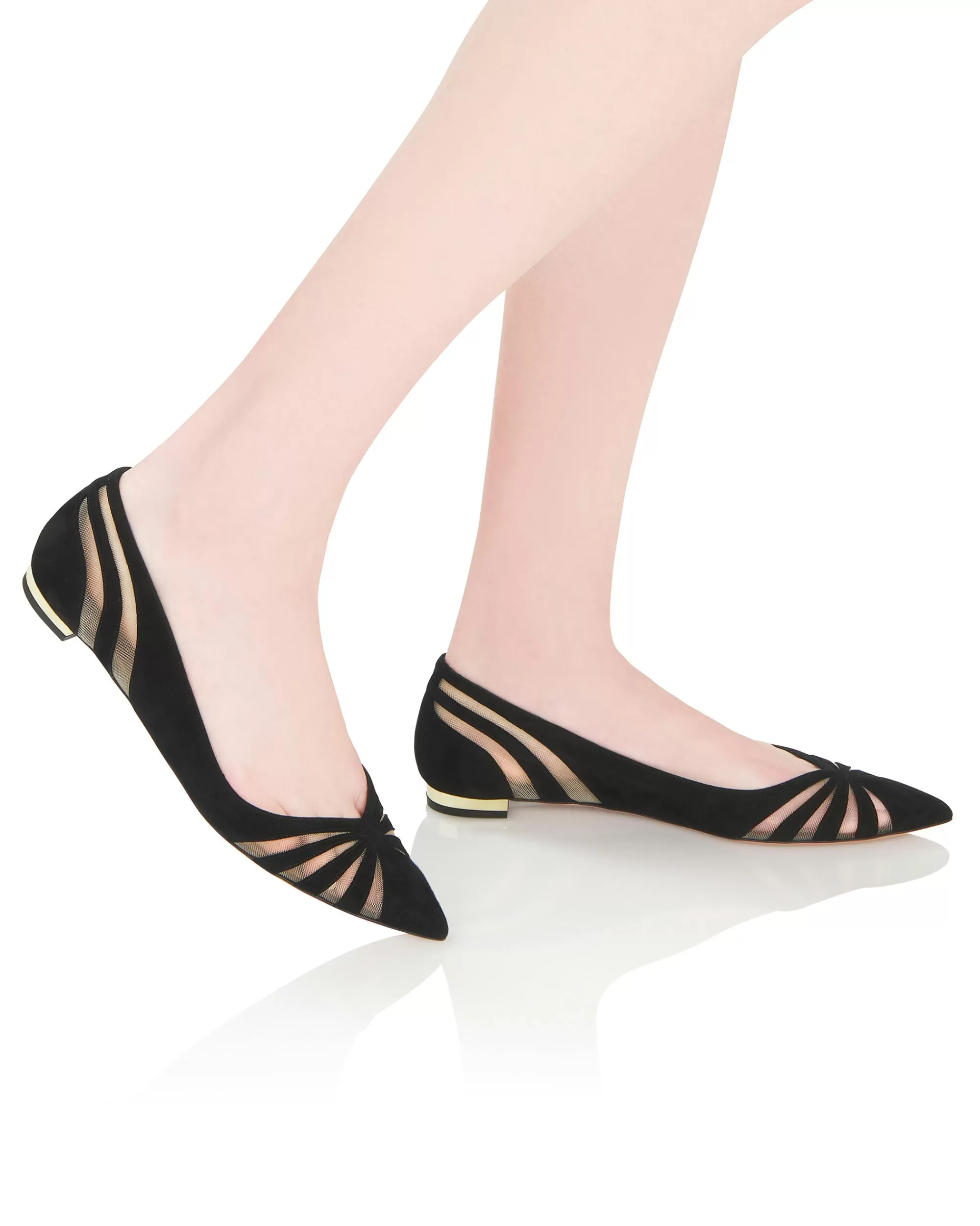 Add a polished finishing touch to your day to evening edits. The Spy Flat is made in Italy from buttery-soft suede in rich black and eye-catching mesh inserts around the toe and heel. The style is finished on our signature metallic plated heel.