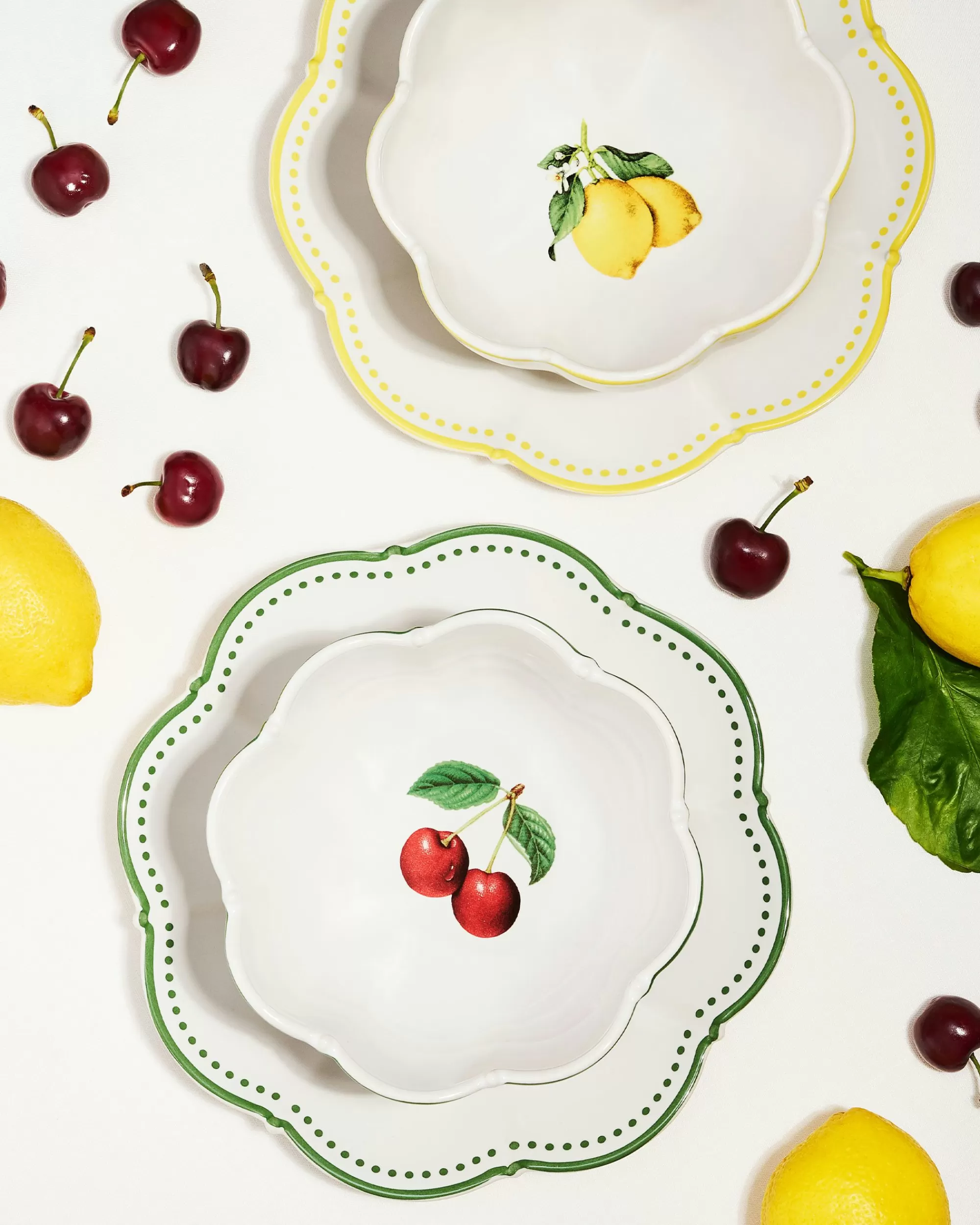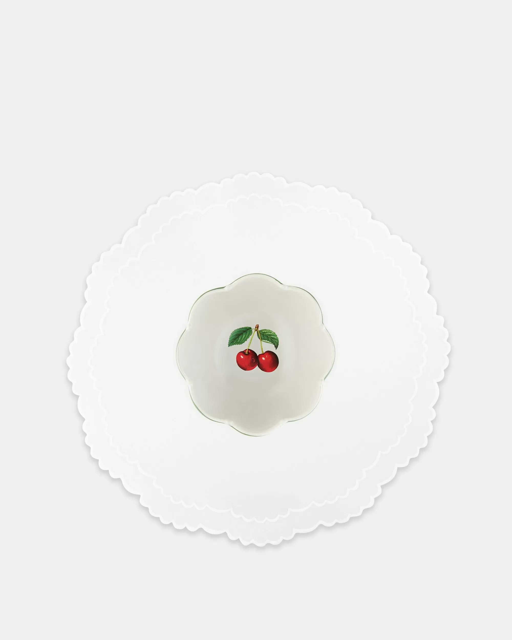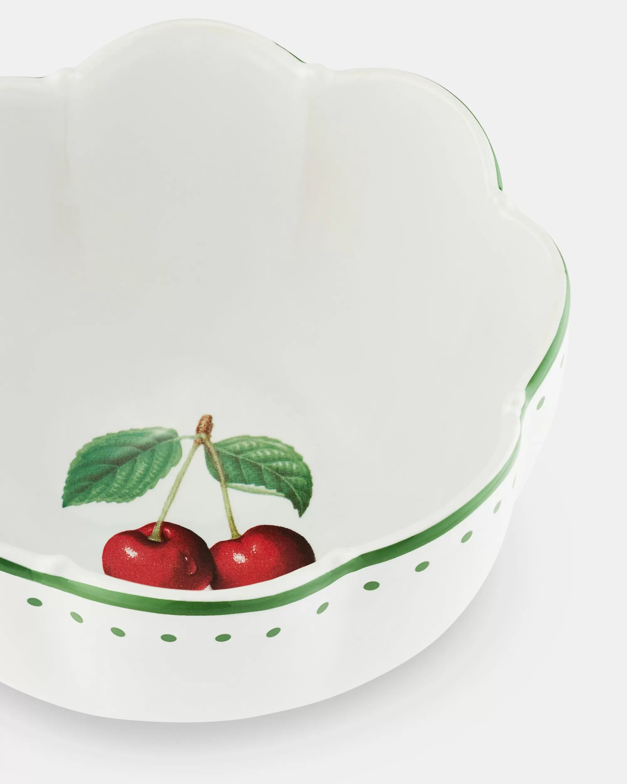 The Mediterranean charm of the island of Capri informs the Tutti Frutti home collection, featuring luscious fruit illustrations and bright, vitaminic tones. This cereal bowl is crafted from pure porcelain in white with green detailing and features a delightful cherry motif.