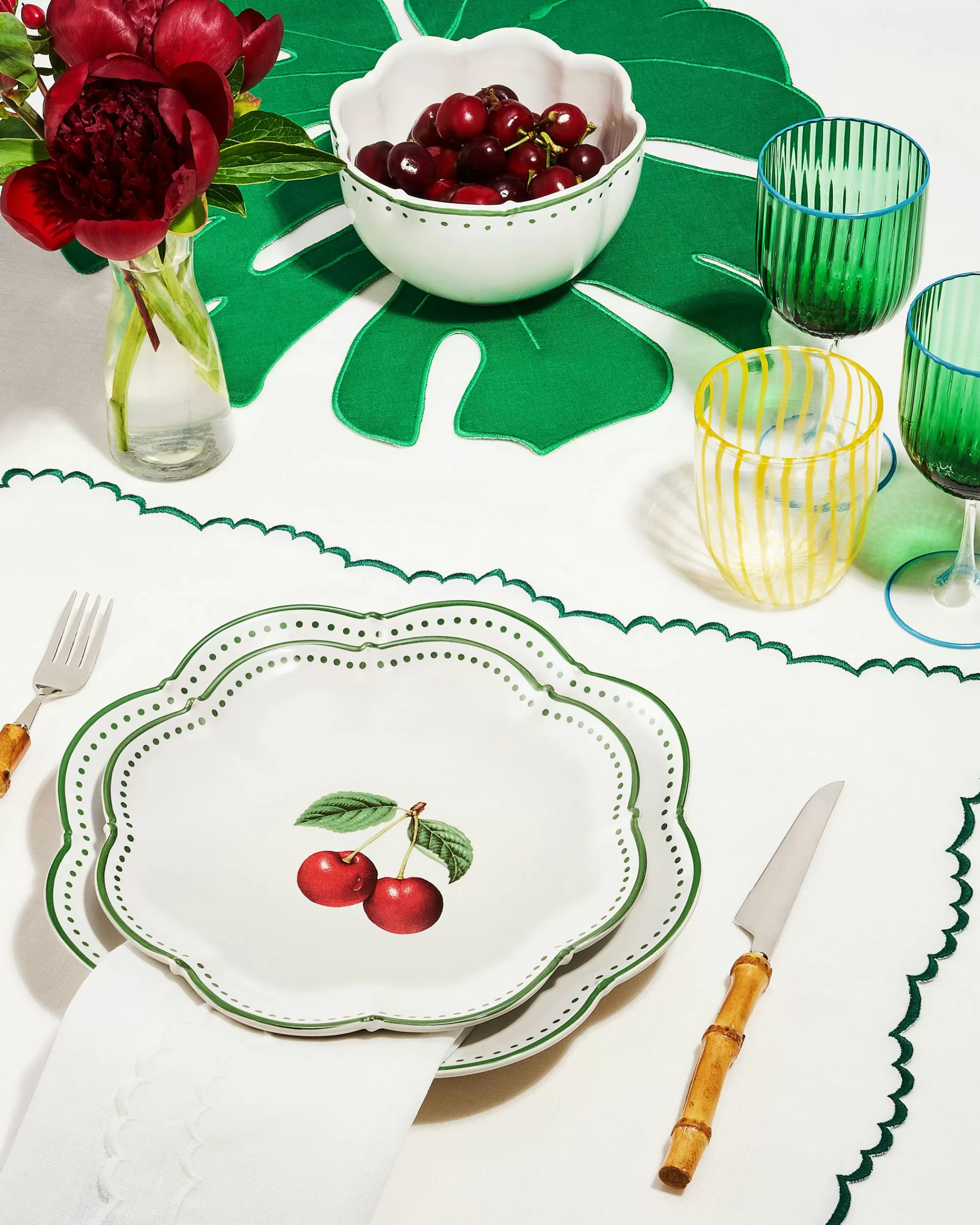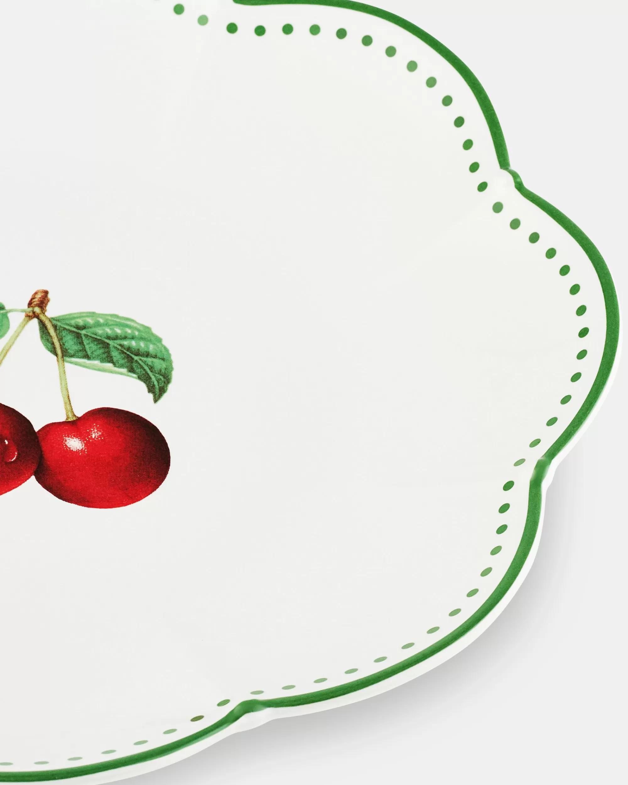 Forming part of the Tutti Frutti collection, this dinner plate is adorned with a sweet cherries-inspired artwork and green decorations along the scalloped edge. Crafted from fine porcelain, all pieces from this Aquazzura Casa range will infuse your dining experience with the warmth and effortless elegance of the island of Capri.