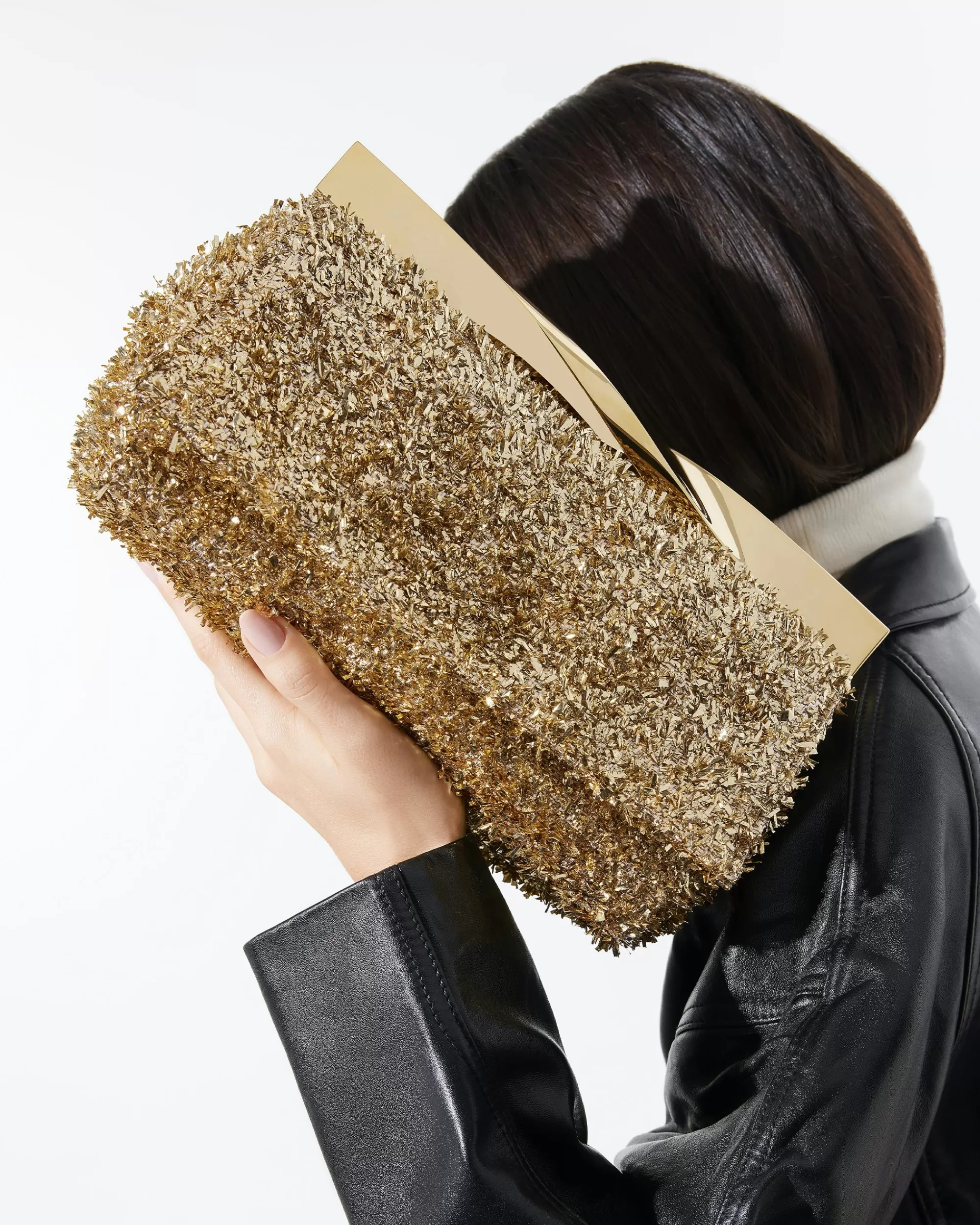 With its name derived from the unmistakable metal clasp, which adorns the essential silhouette, our iconic Twist Clutch is the epitome of modern elegance. This metallic iteration features an eye-catching, playful texture and the brand’s signature light gold-tone hardware. The shoulder strap ensures multiple carry options.