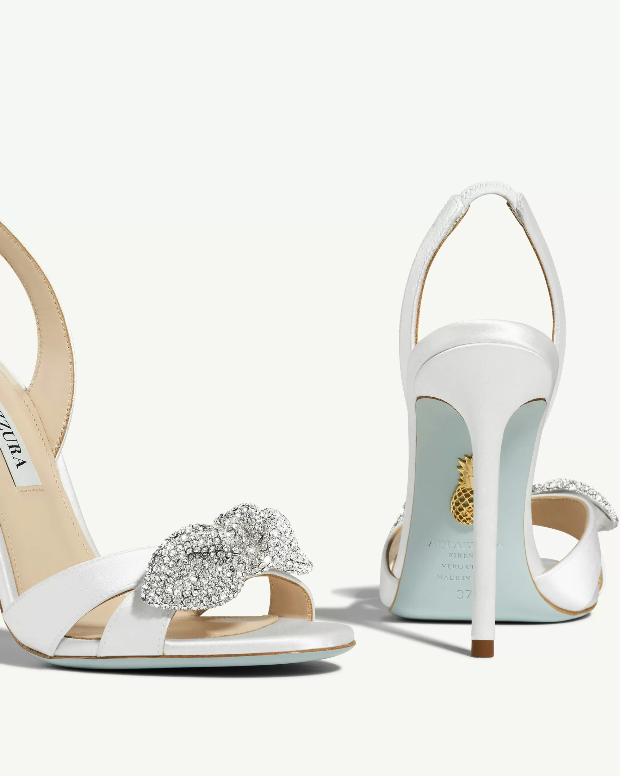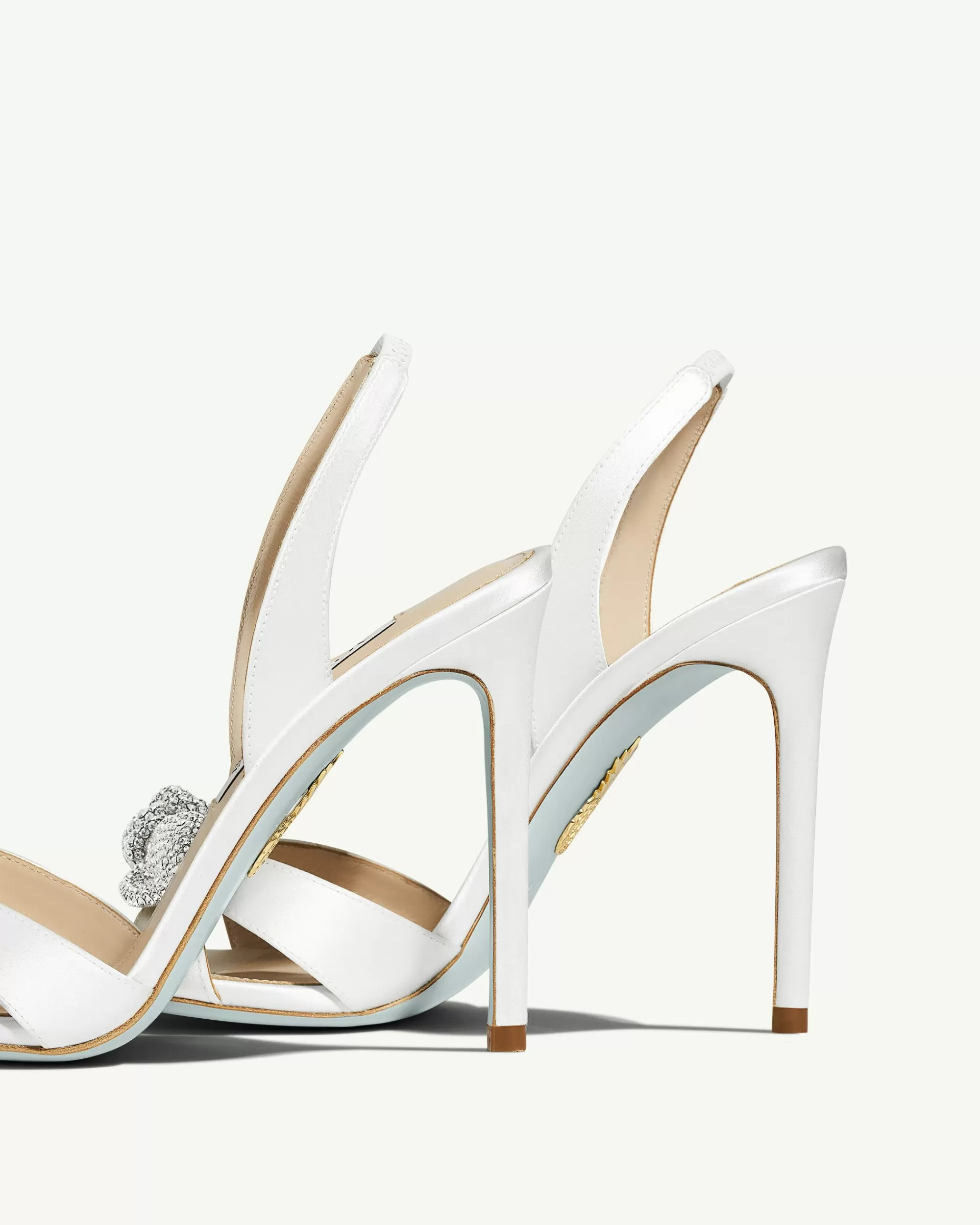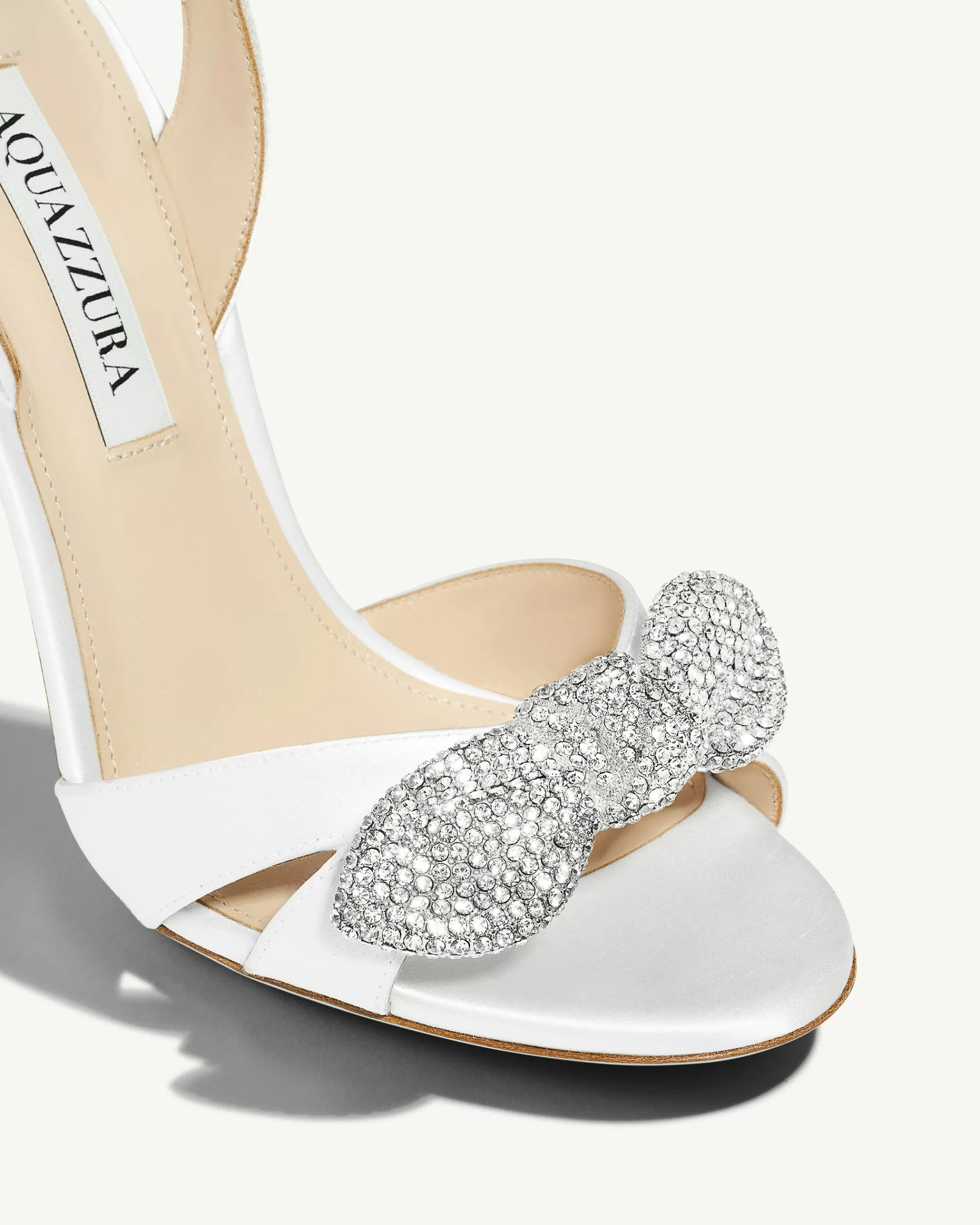 These Very Bow Tie Crystal Sandals are a glamorous choice for the modern bride. Theyre crafted from luminous white satin and topped with crystal-embellished bows – Aquazzuras signature adornment. Poised on 105 mm heels, wear them with party dresses and cropped jeans beyond your big day.