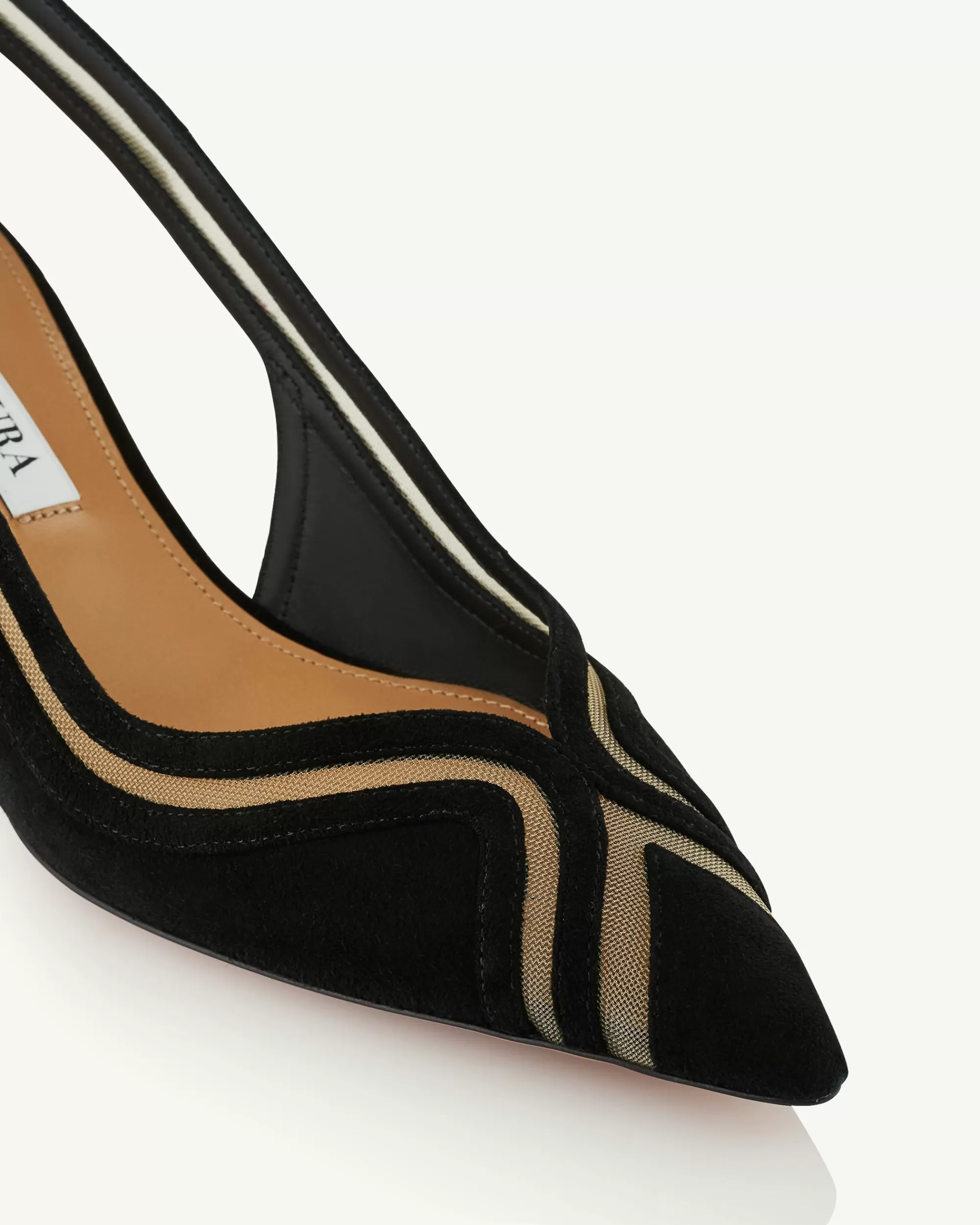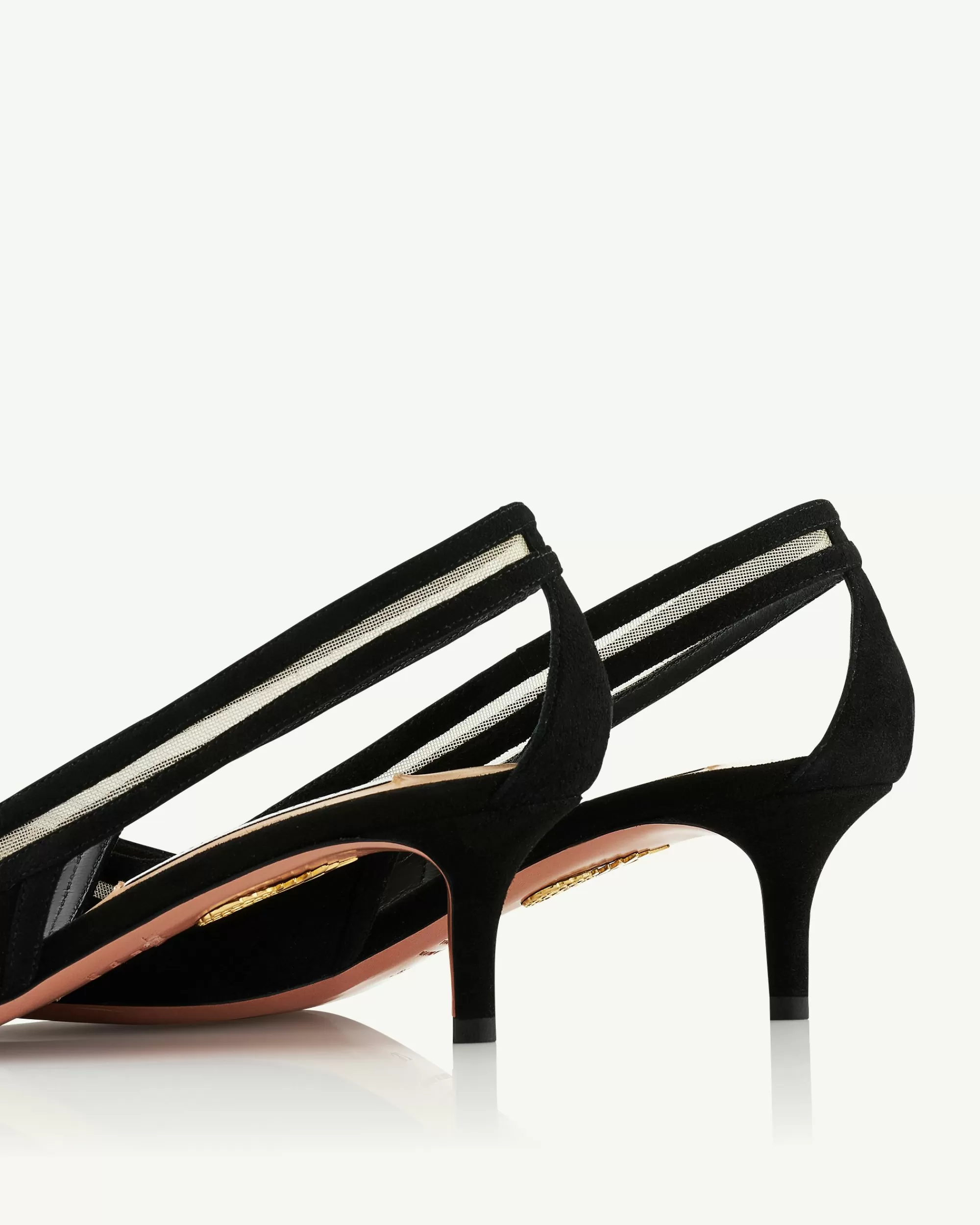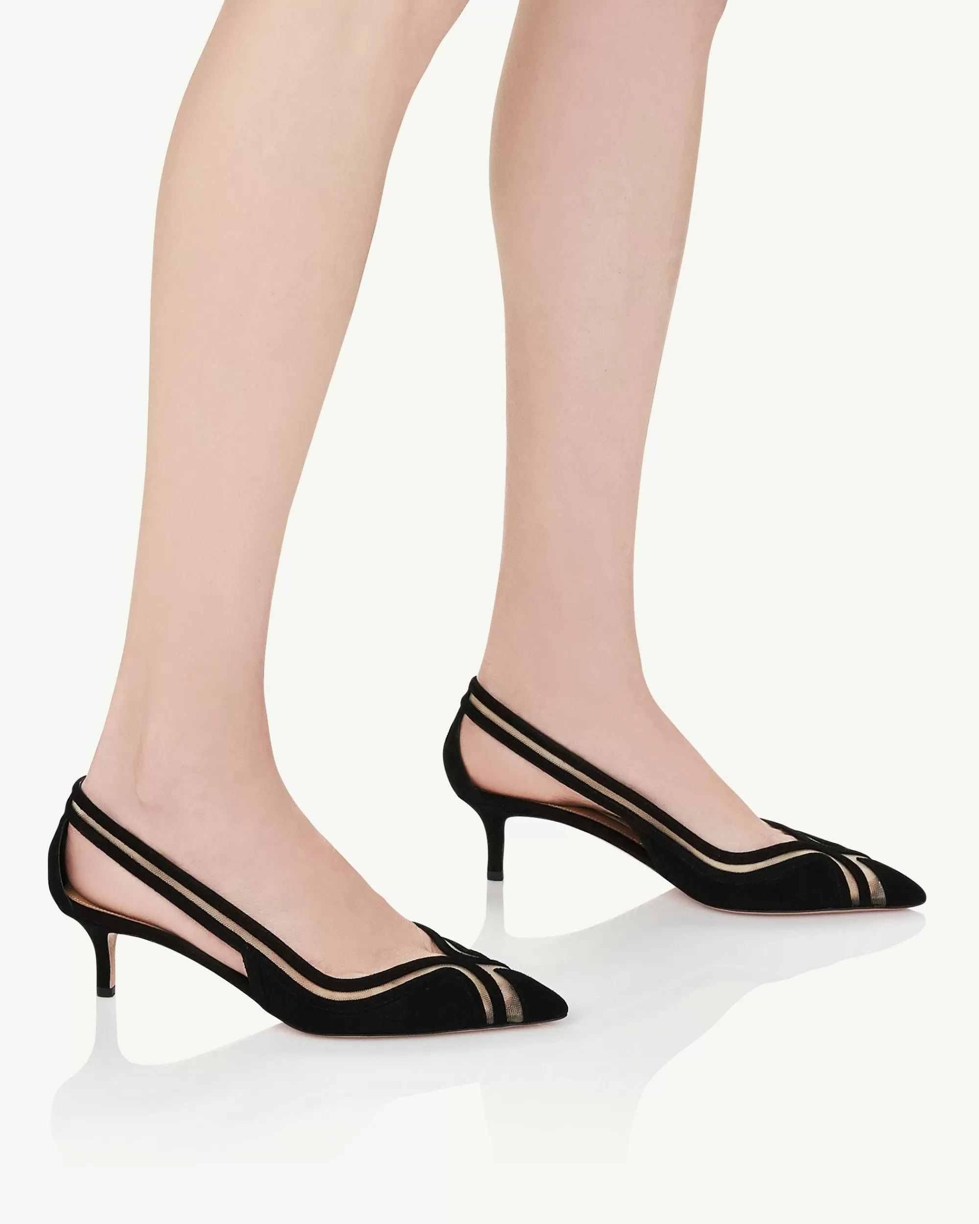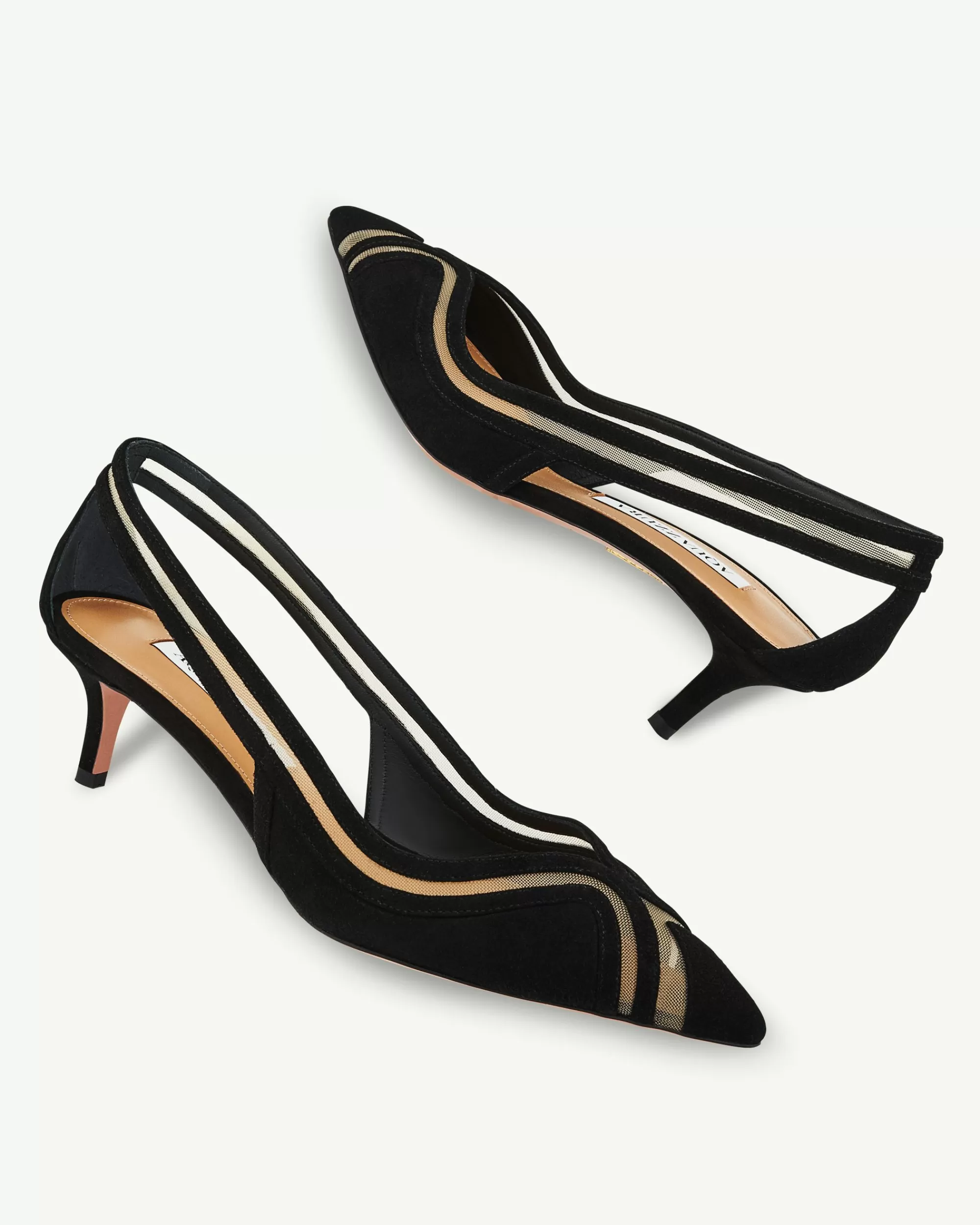 With their classic silhouette, spliced with sensuous sheer mesh inserts, our Vila Pumps exude modern glamour without being overpowering. Crafted in Italy from black suede and patent leather, they have sleek pointed toes and 50 mm heels that effortlessly transition from day to night.