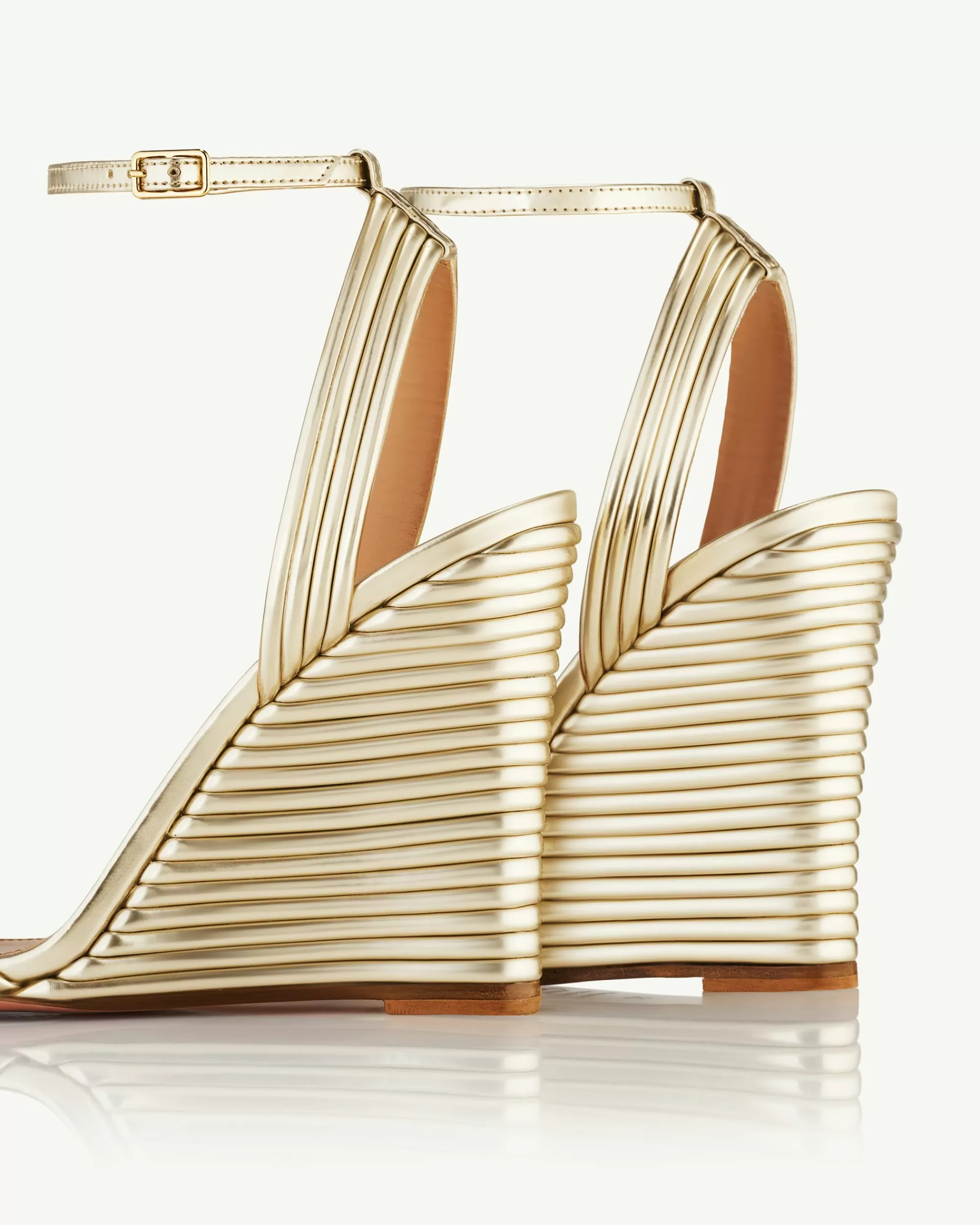 A precious pair you’ll treasure for years to come – our Wow Wedge sandals will amplify any look. The minimalist, geometric silhouette is crafted from light-gold leather with a unique, dynamic texture that enhances the lustrous sheen. Secured with delicate ankle straps, style yours with evening-worthy maxi lengths and laid-back looks alike.