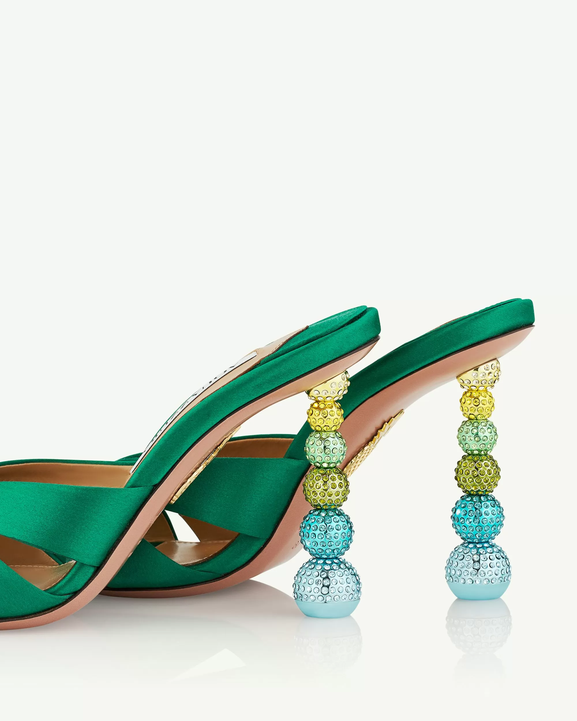 A closer look at our mesmerising Yes Baby Mules reveals a sculptural heel composed of six crystal-encrusted spheres – inspired by disco balls, in all their glittering glory. Theyre crafted from lustrous Emerald green satin with lightly cushioned leather insoles. Bonus point? Matching earrings are also available.