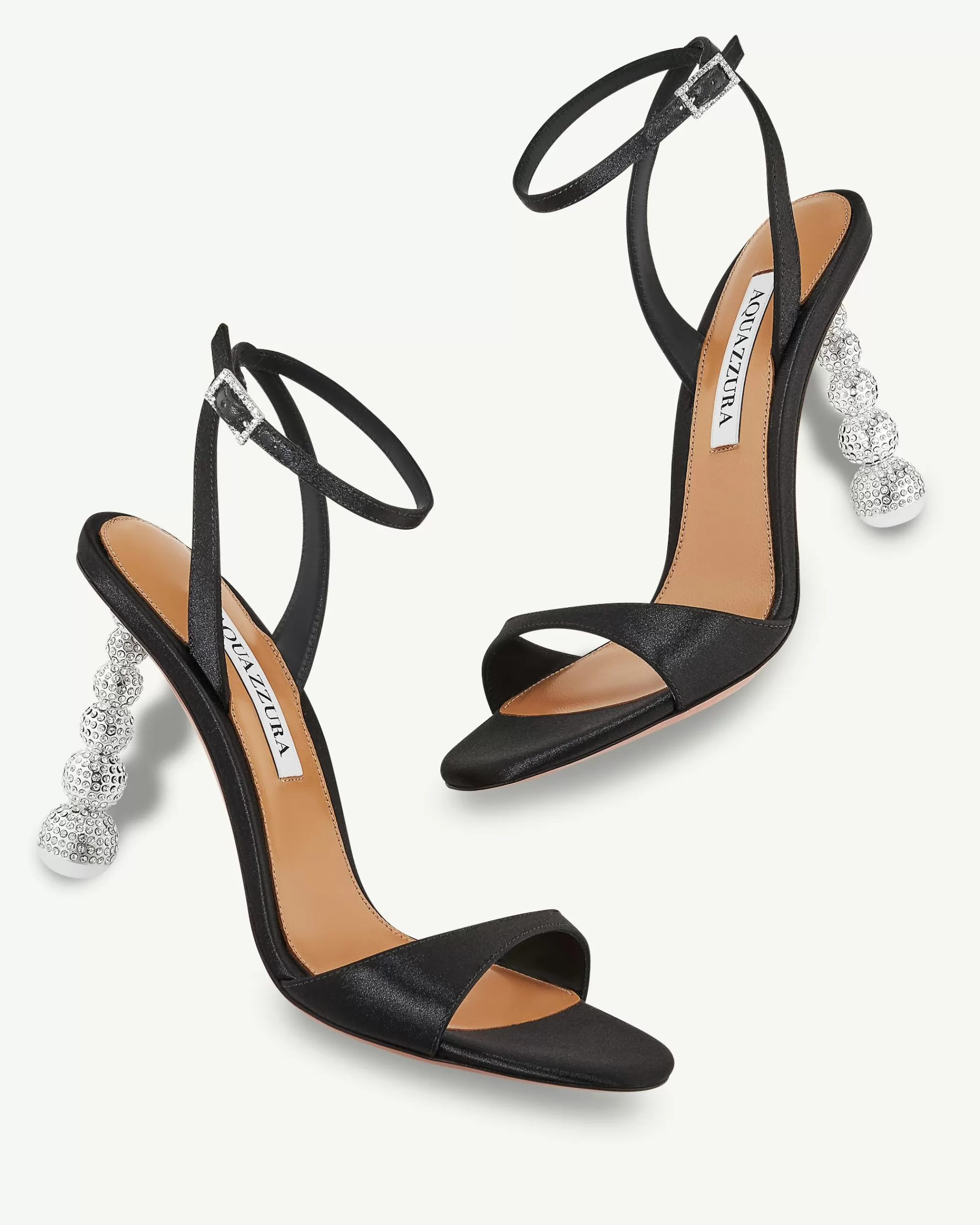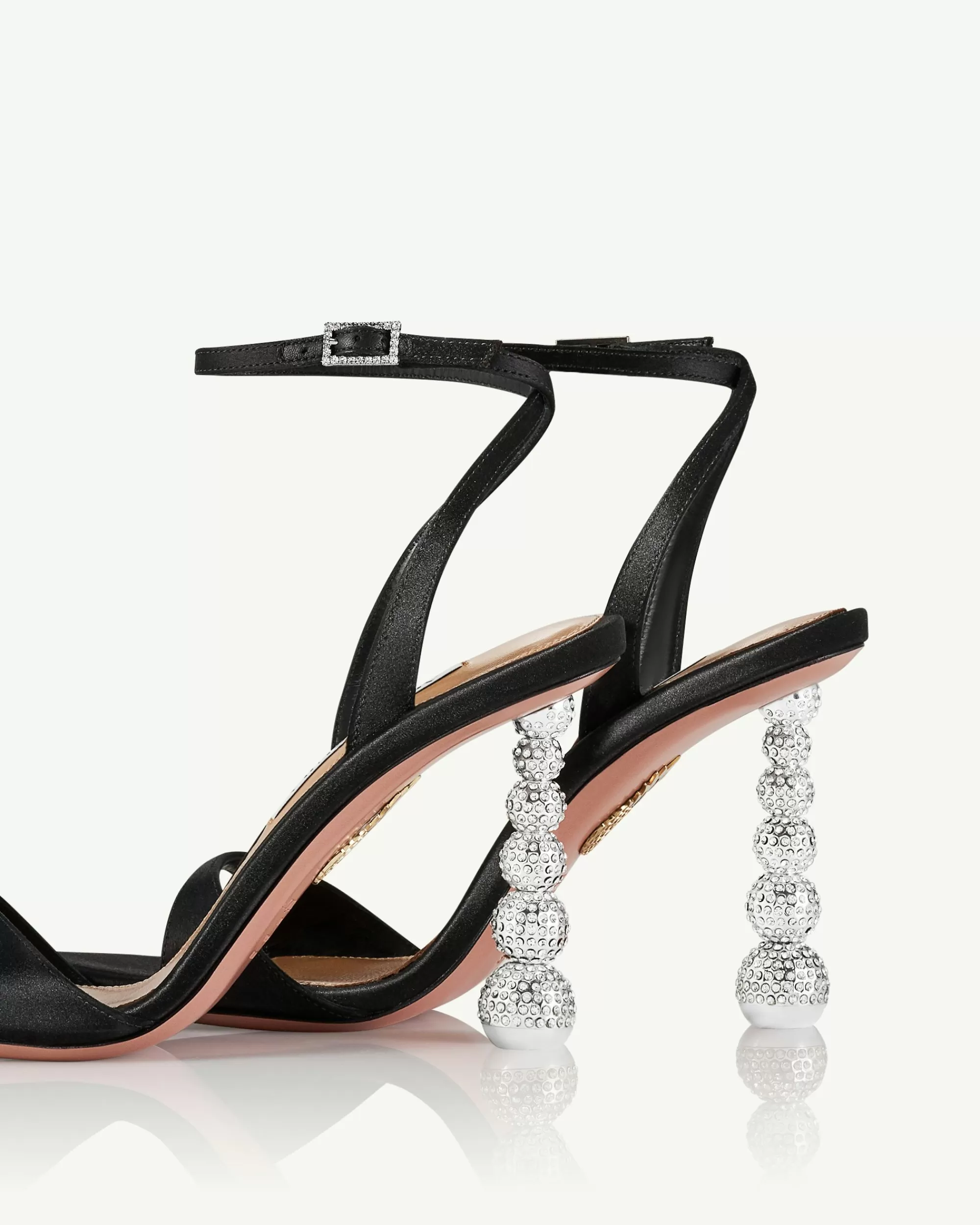 Set to shine on the dancefloor: these Yes Baby Sandals combine a minimalist strappy silhouette with a sculptural heel composed of six crystal-encrusted spheres. Theyre crafted in Italy from lustrous black satin that contrasts beautifully with the intricate embellishments. Dont miss the matching earrings in the collection.